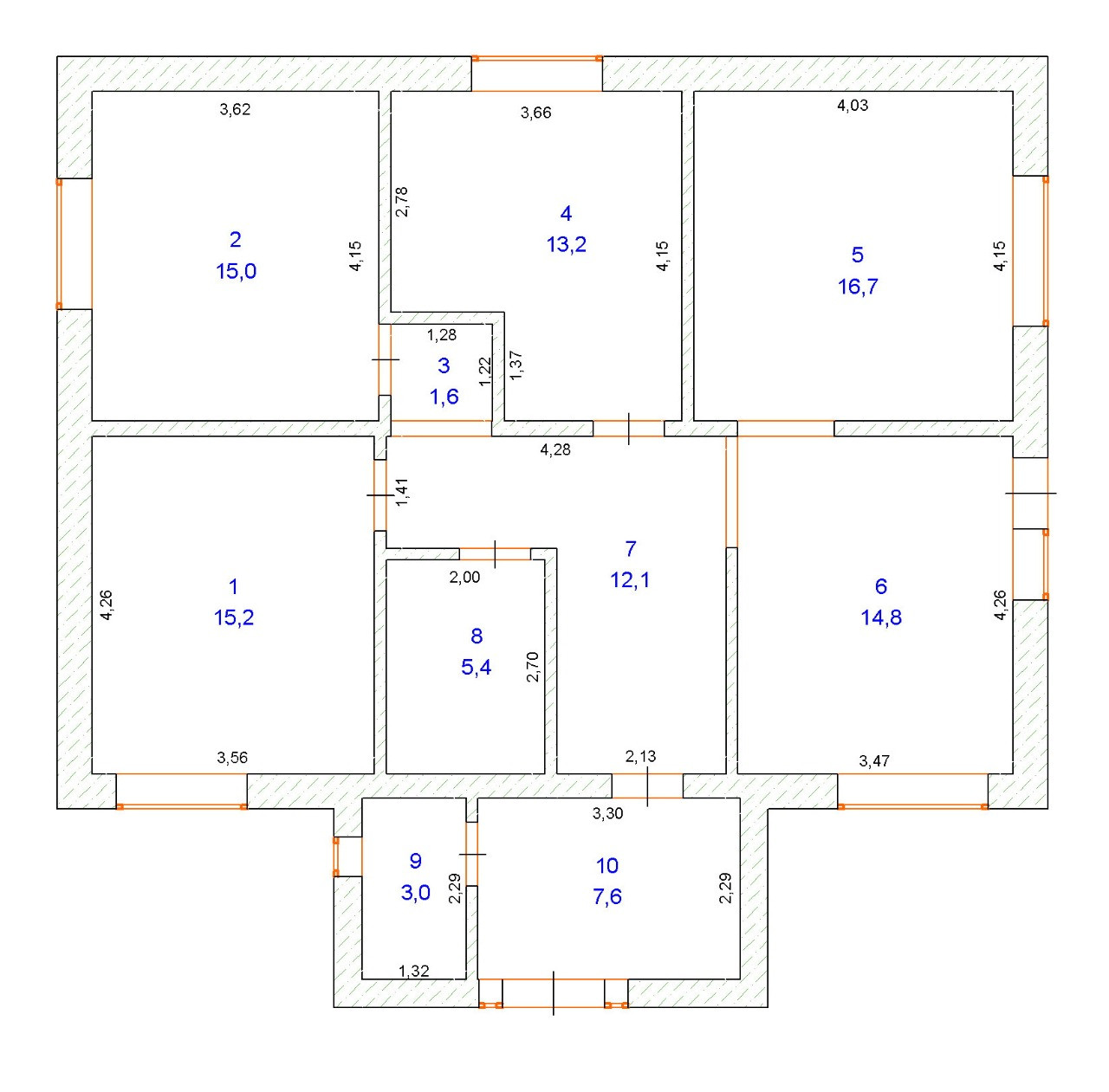 Общая площадь дома = 115 кв.м. Просторная кухня= 14,8 кв.м. с выходом на Ваш участок в панорамном стиле, большая гостиная = 16,7 кв.м., три просторные комнаты = 15,2 кв.м., 15 кв.м., 13,2 кв.м., СУ =5,4 кв.м., просторные холлы и котельная = 3 кв.м.