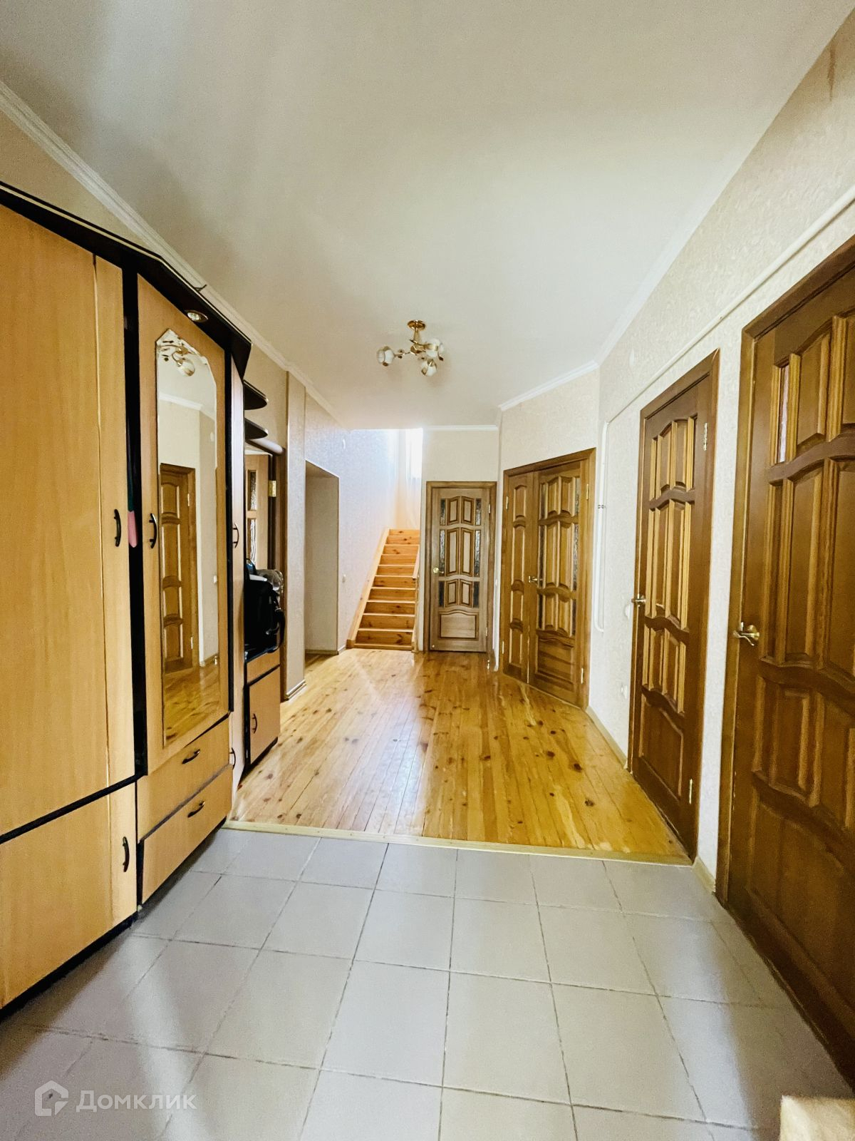 — 1 этаж: широкий коридор, с возможностью установить вместительный шкаф купе. Просторная кухня с выходом на летнюю террасу, гостиная, 2 спальни, ванная и туалетная комнаты, выход в подвал. Лестница на второй этаж из натурального дерева.