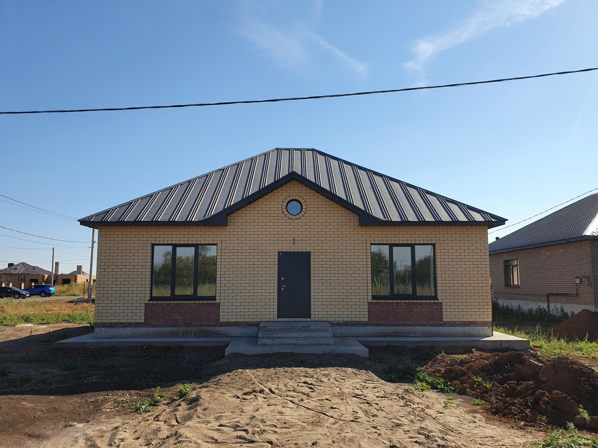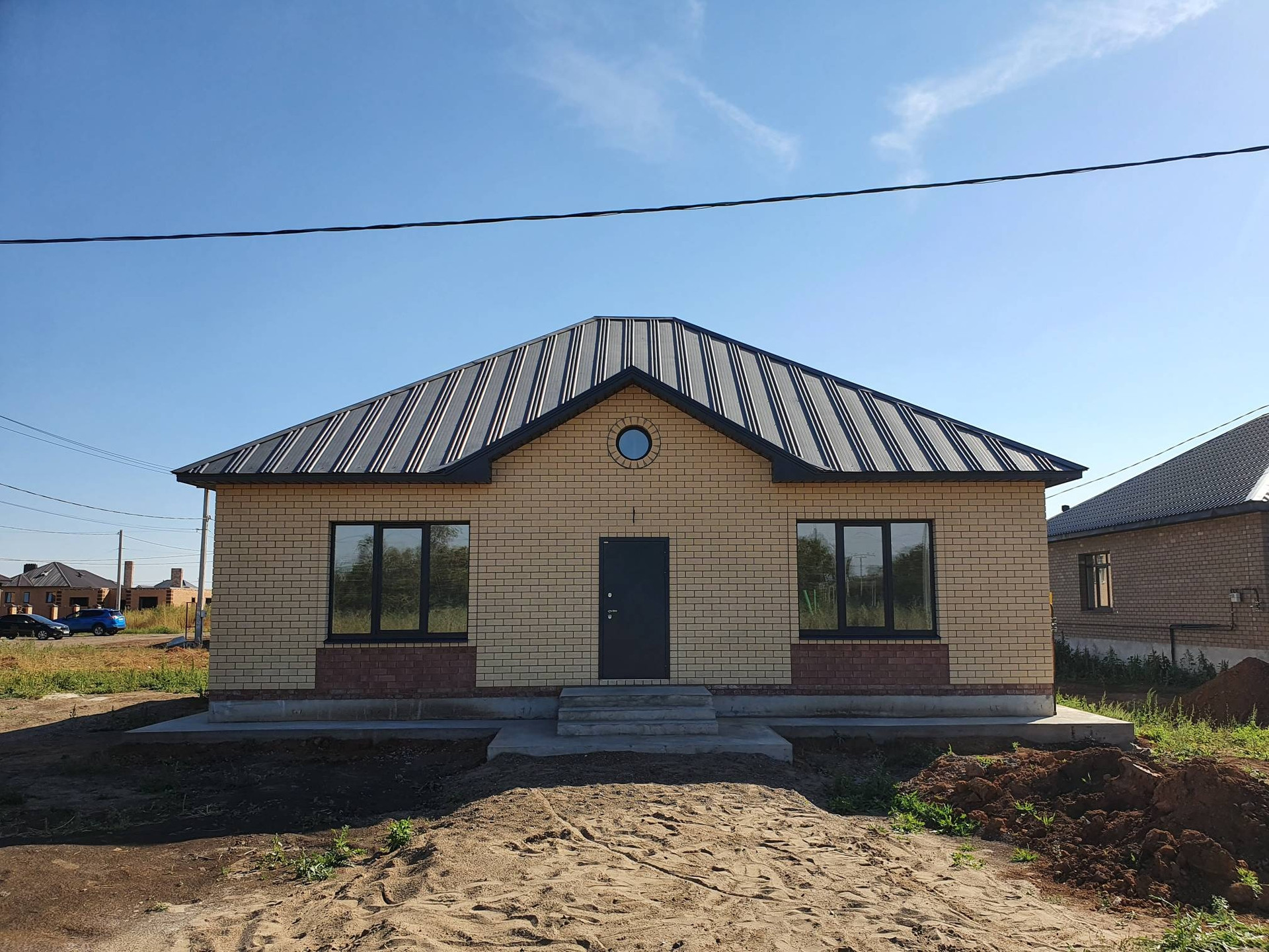 Стены, керамзитоблок ,утеплитель, облицовочный кирпич.Кровля - металлочерепица Капелла Мир кровли, Окна Висла , фундамент свайно-ленточный, 2 м.