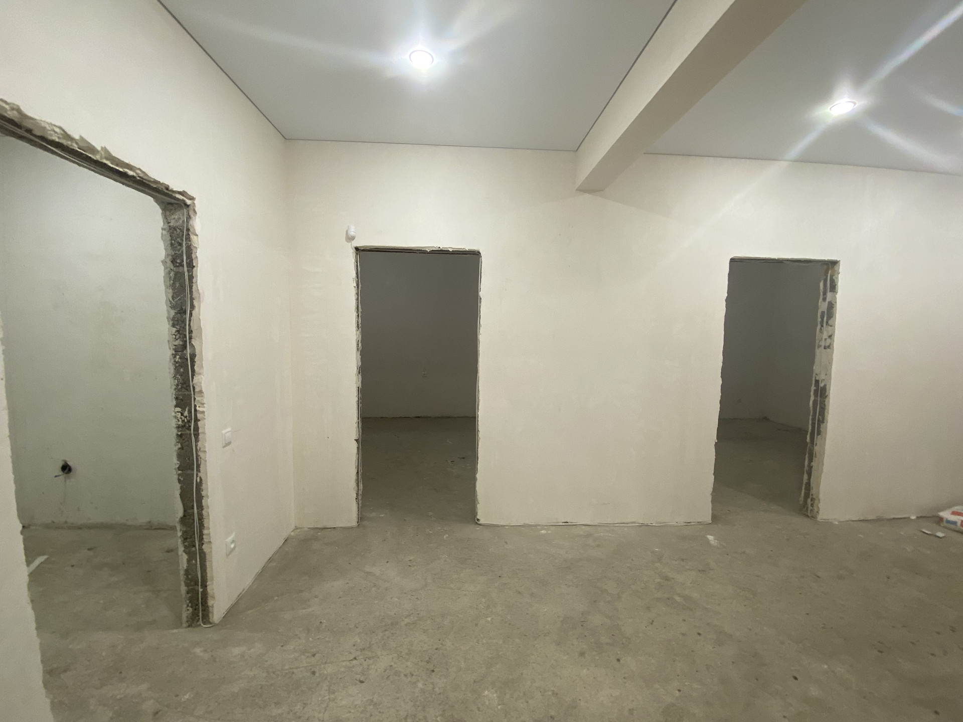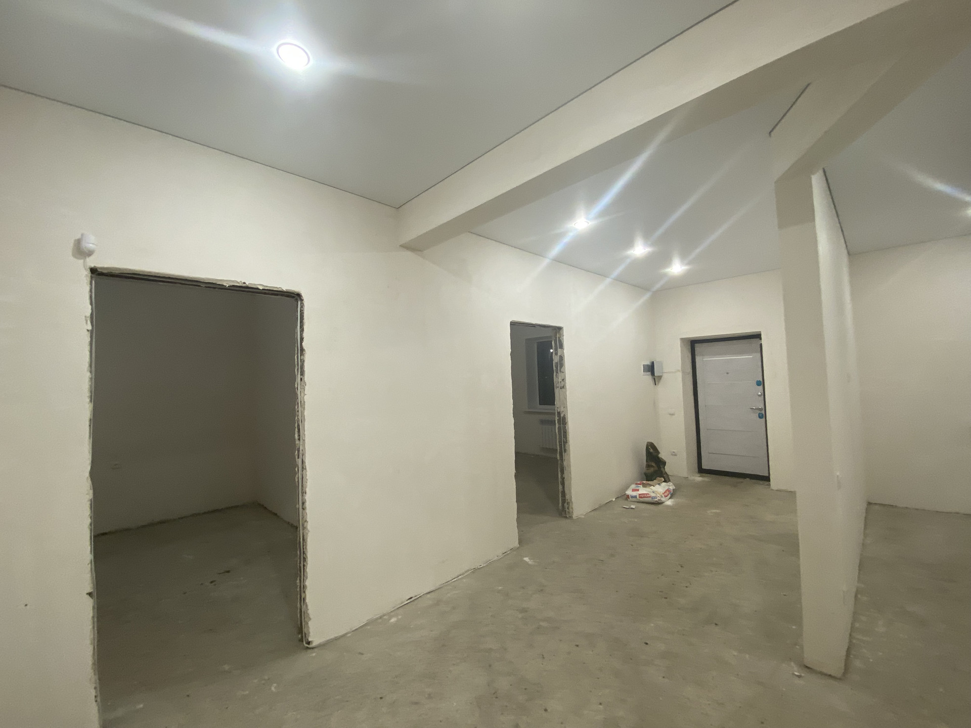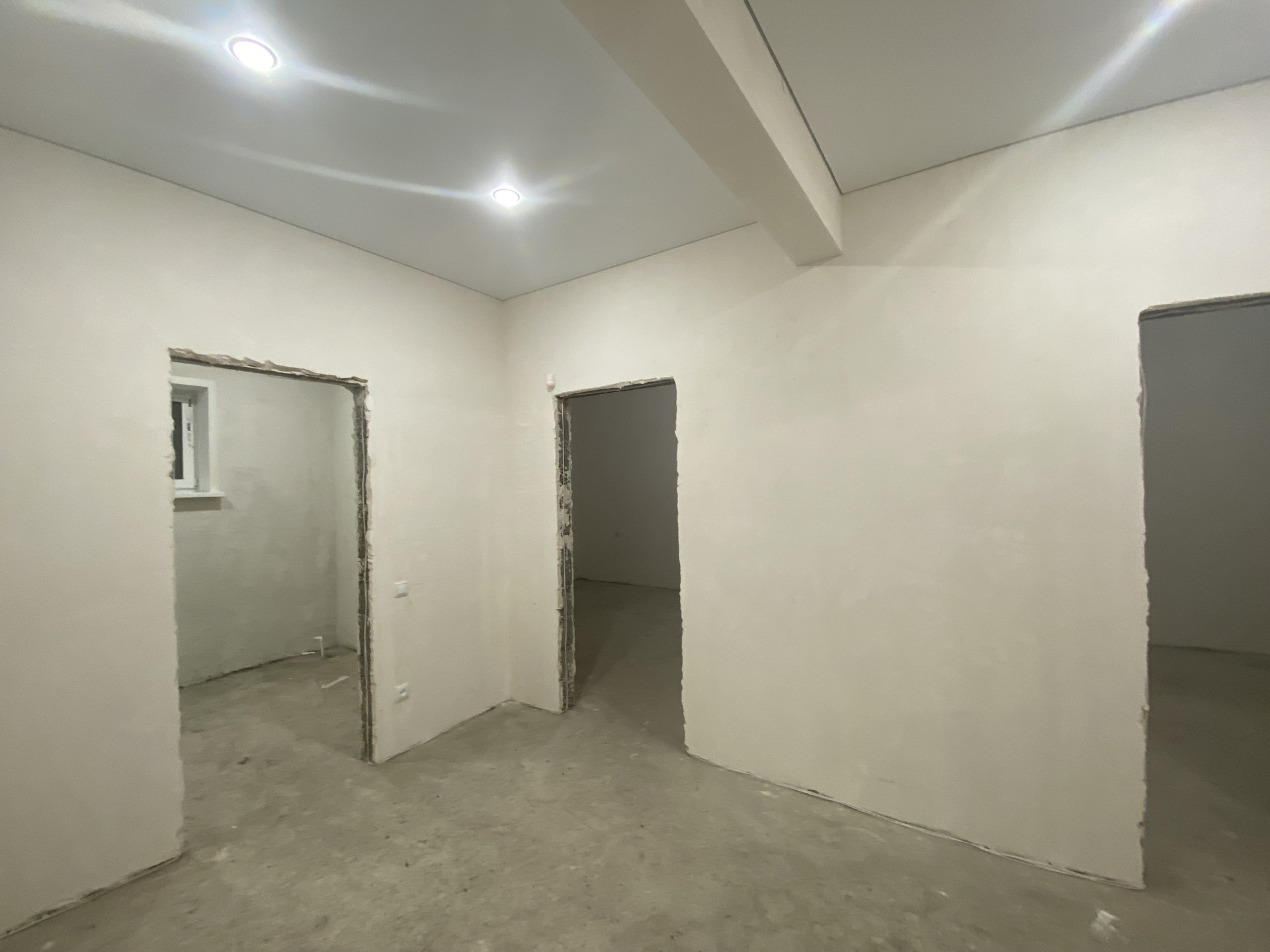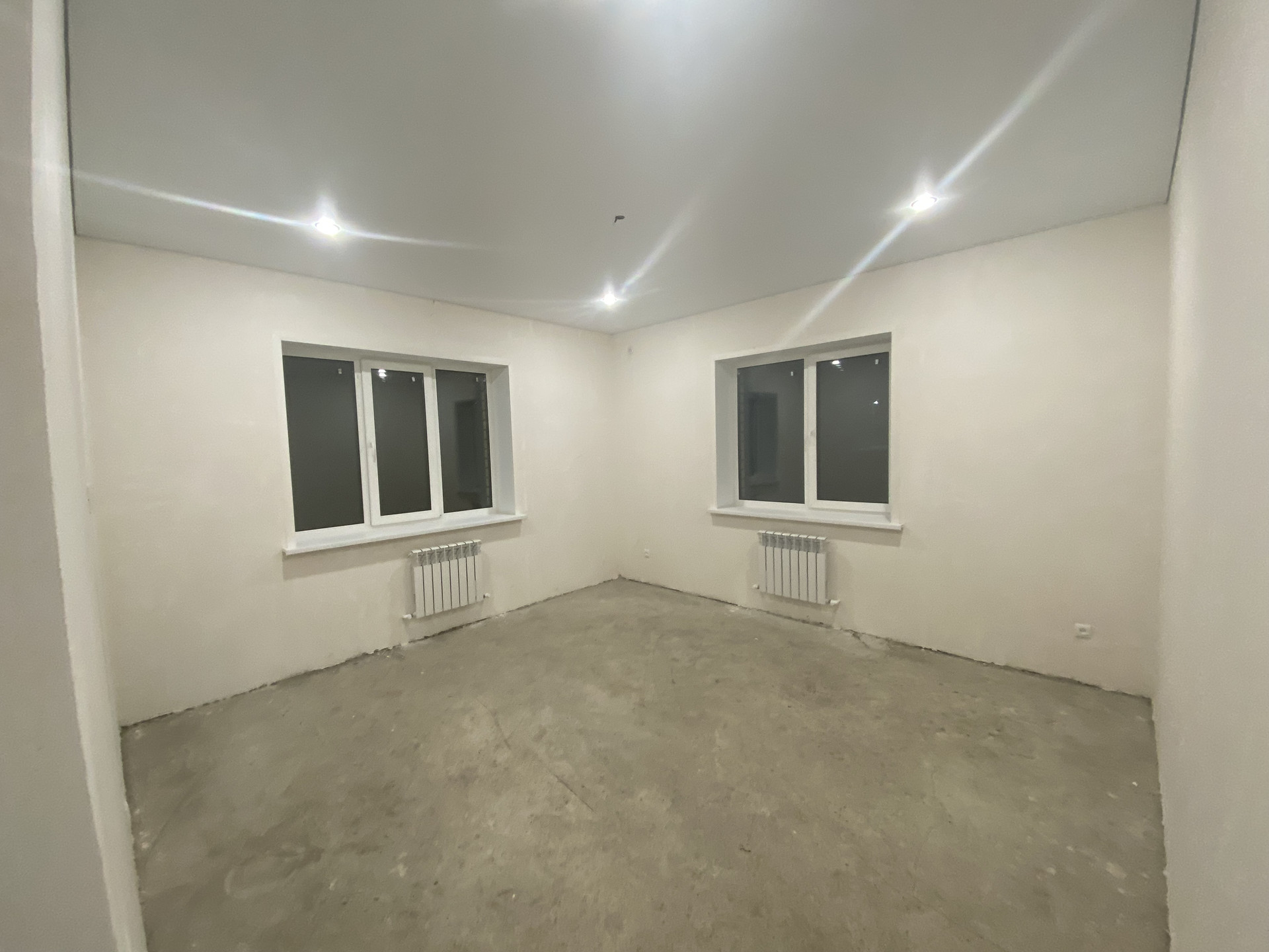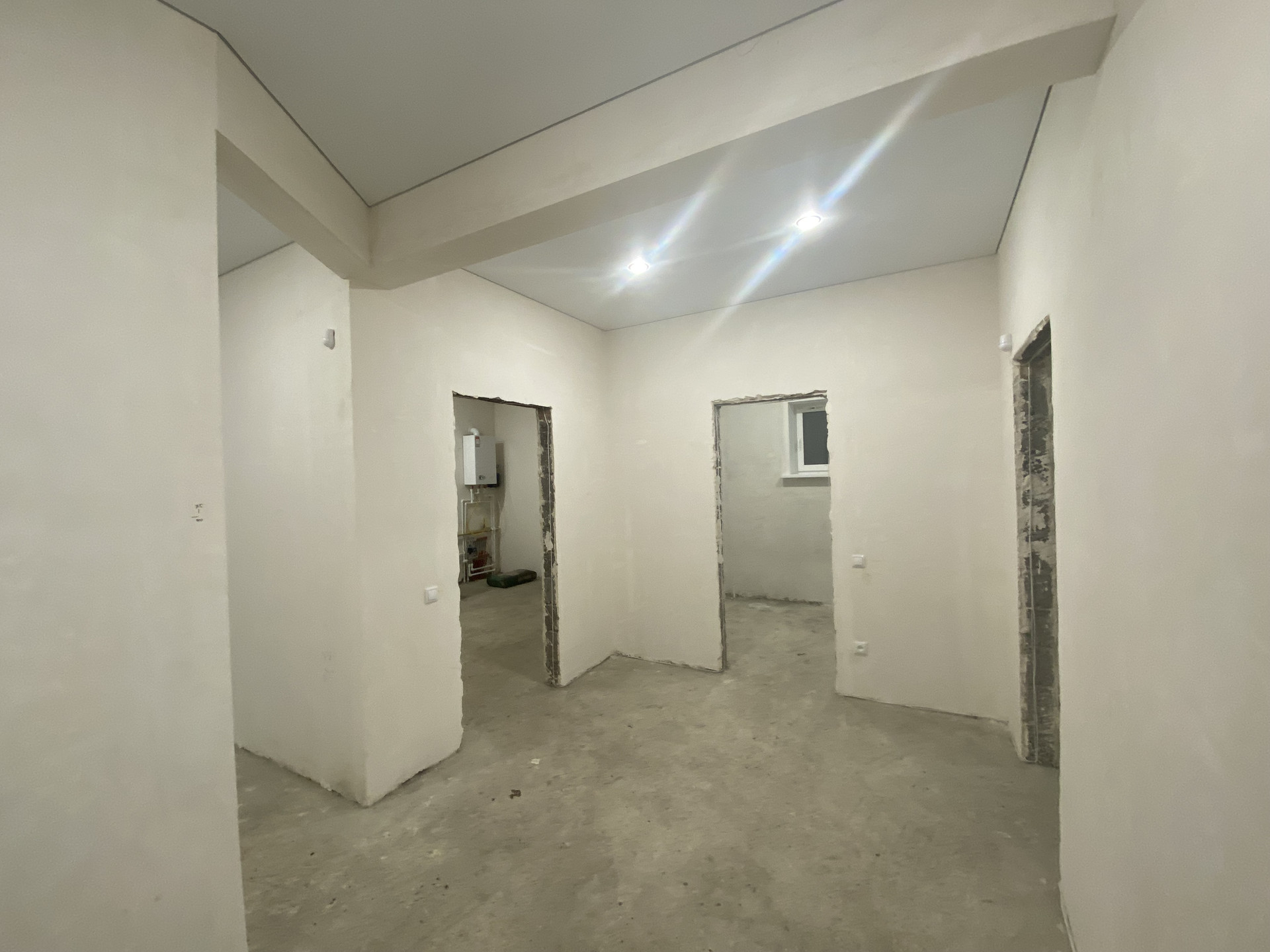 Стены отштукатурены под обои, пол теплый по всему дому, радиаторы в каждой комнате, электрика проведена, установлены выключатели и розетки, установлены подоконники и теплые откосы из сэндвич панелей,двухконтарный котел в топочной,дорогая входная дверь.
