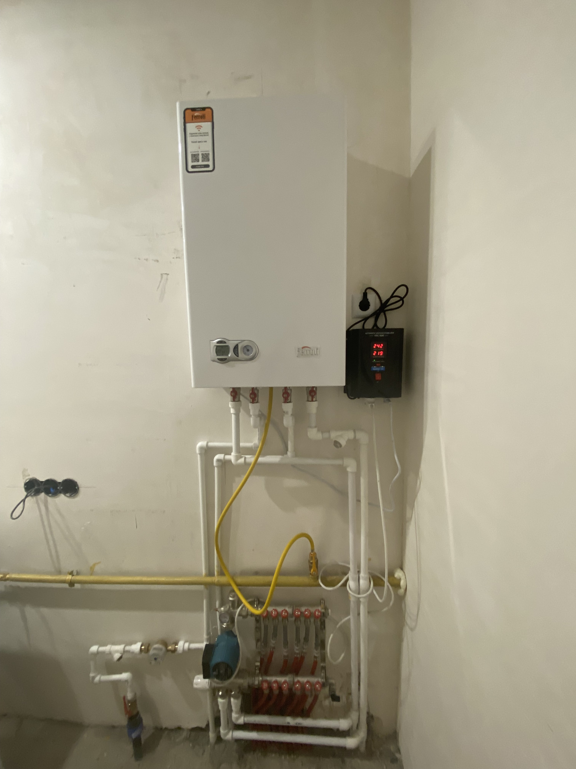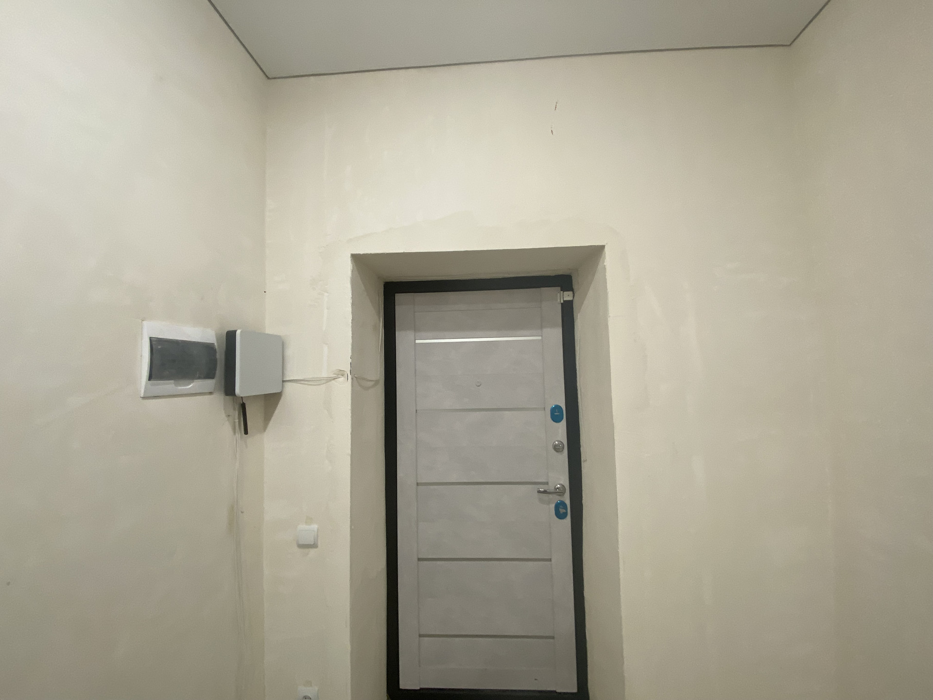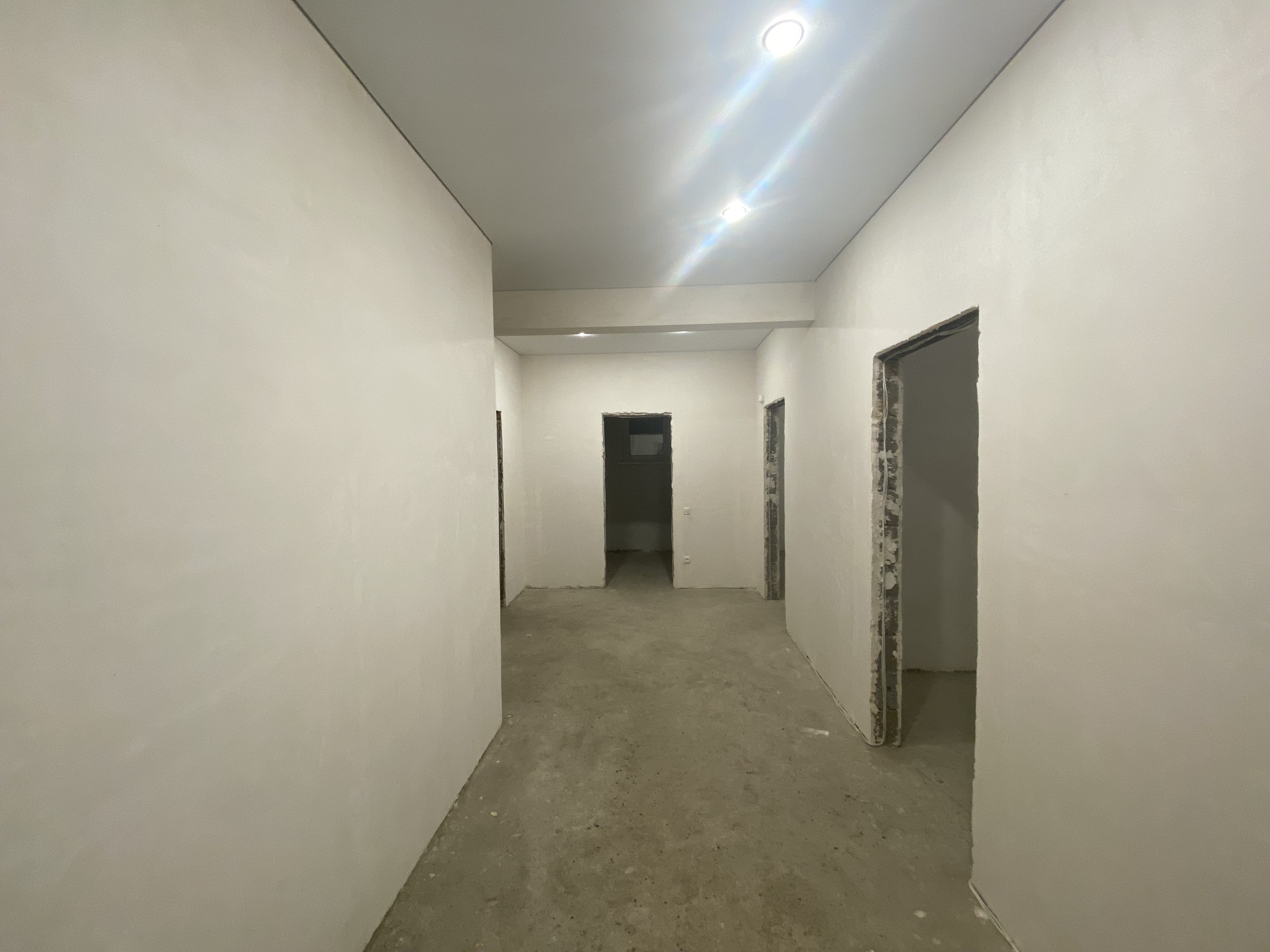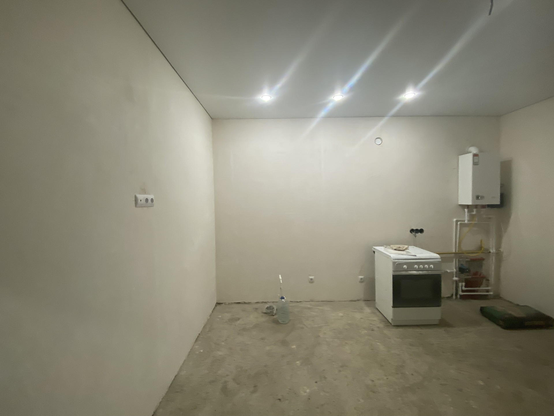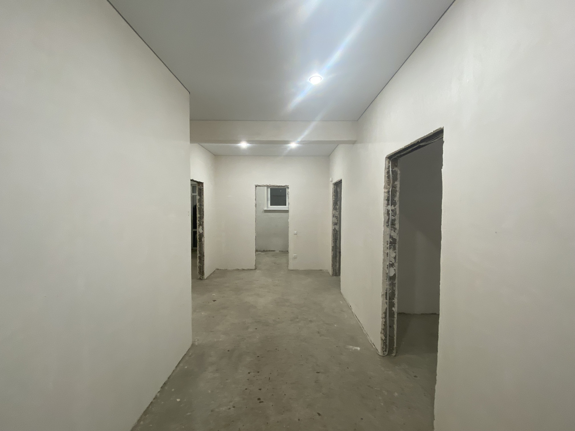 Стены отштукатурены под обои, пол теплый по всему дому, радиаторы в каждой комнате, электрика проведена, установлены выключатели и розетки, установлены подоконники и теплые откосы из сэндвич панелей,двухконтарный котел в топочной,дорогая входная дверь.
