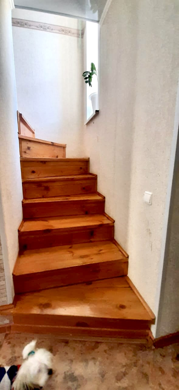 На первом этаже  - тамбур, прихожая, совмещенный санузел с ванной и туалетом,  кухня-гостиная  с выходом на террасу (с навесом) и собственный, огороженный забором из профлиста двор 1,2 сотки