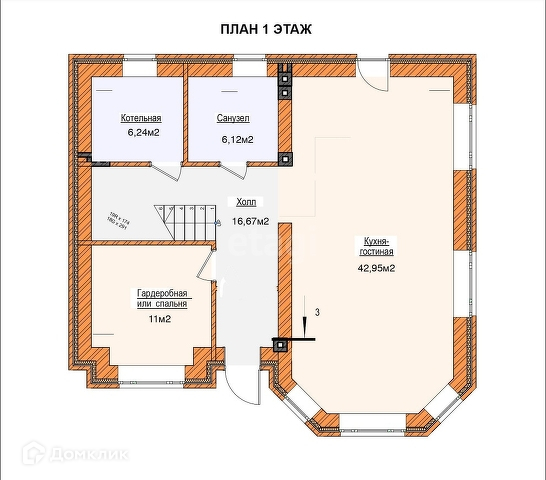 1й этаж - кухня-столовая с дополнительным выходом на задний двор, санузел, котельная, комната свободного назначения (гостевая спальня, кабинет и тд).