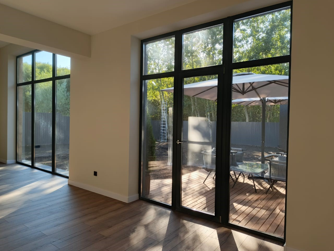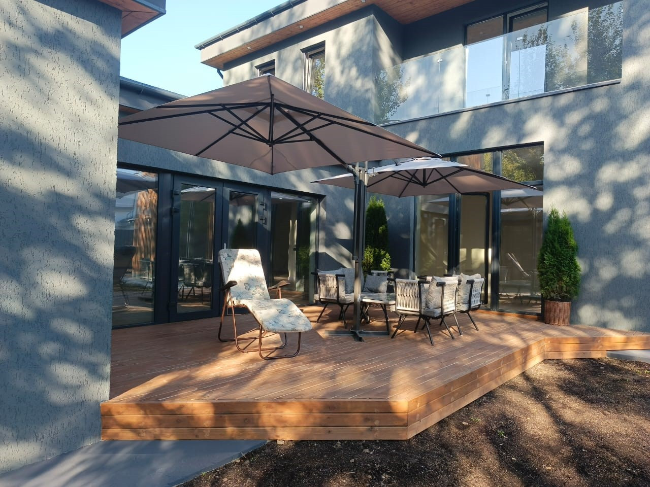 На втором этаже: мастер-спальня с  с/у, ванная с большим панорамным остеклением и выходом на балкон, две спальни, отдельная гардеробная комната, просторный санузел и открытая терраса.