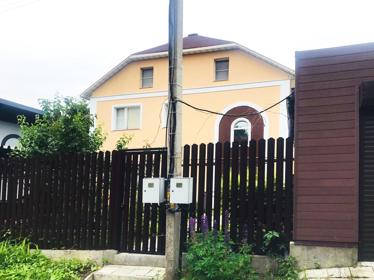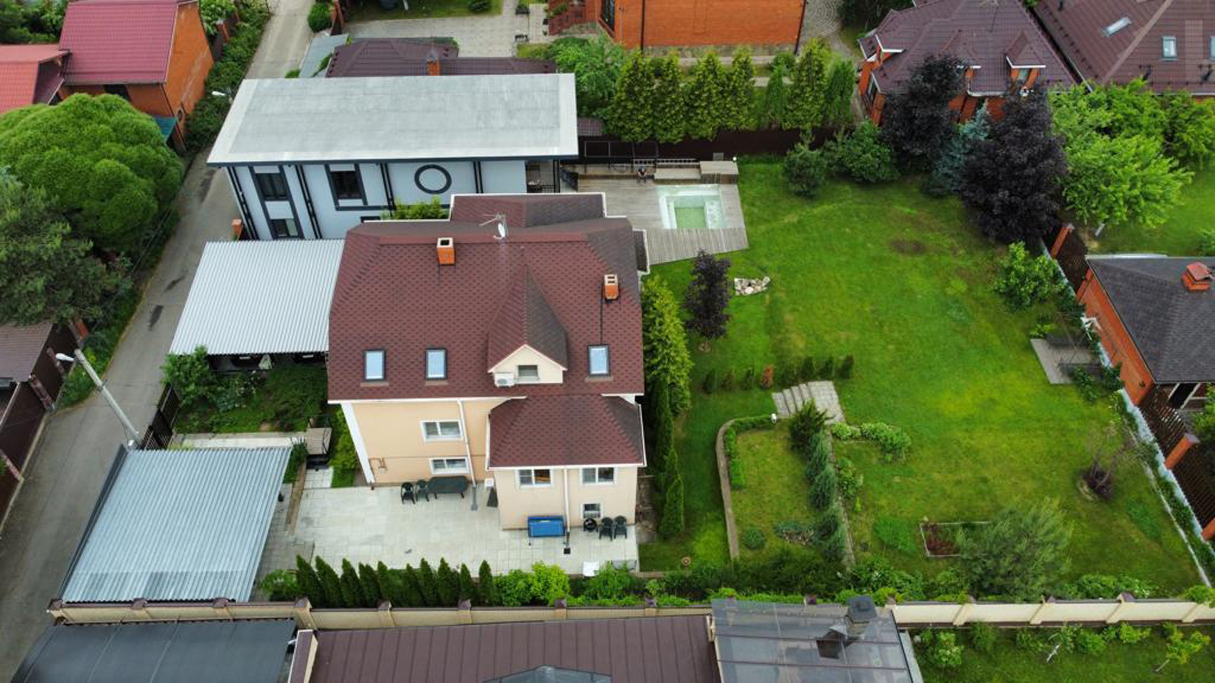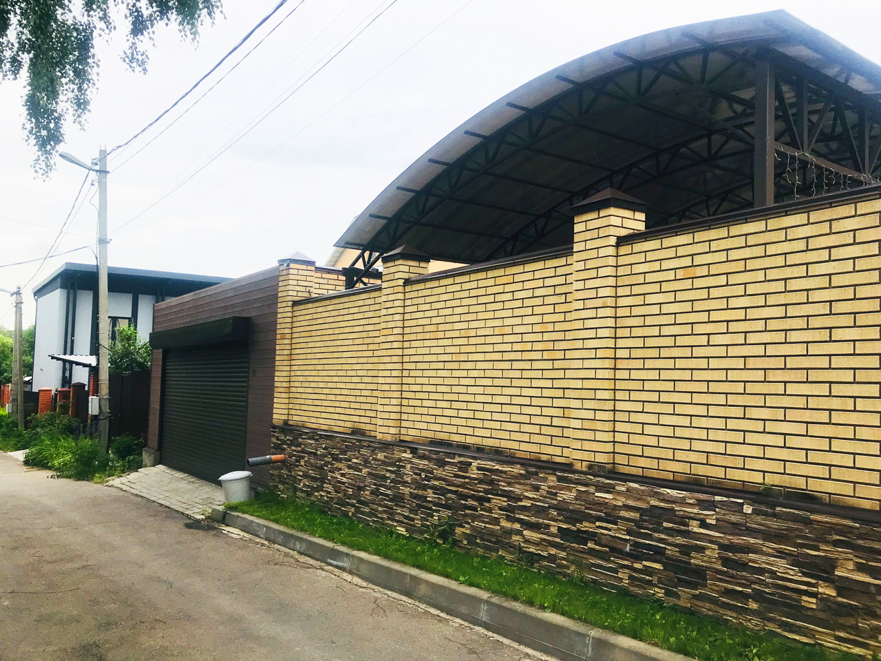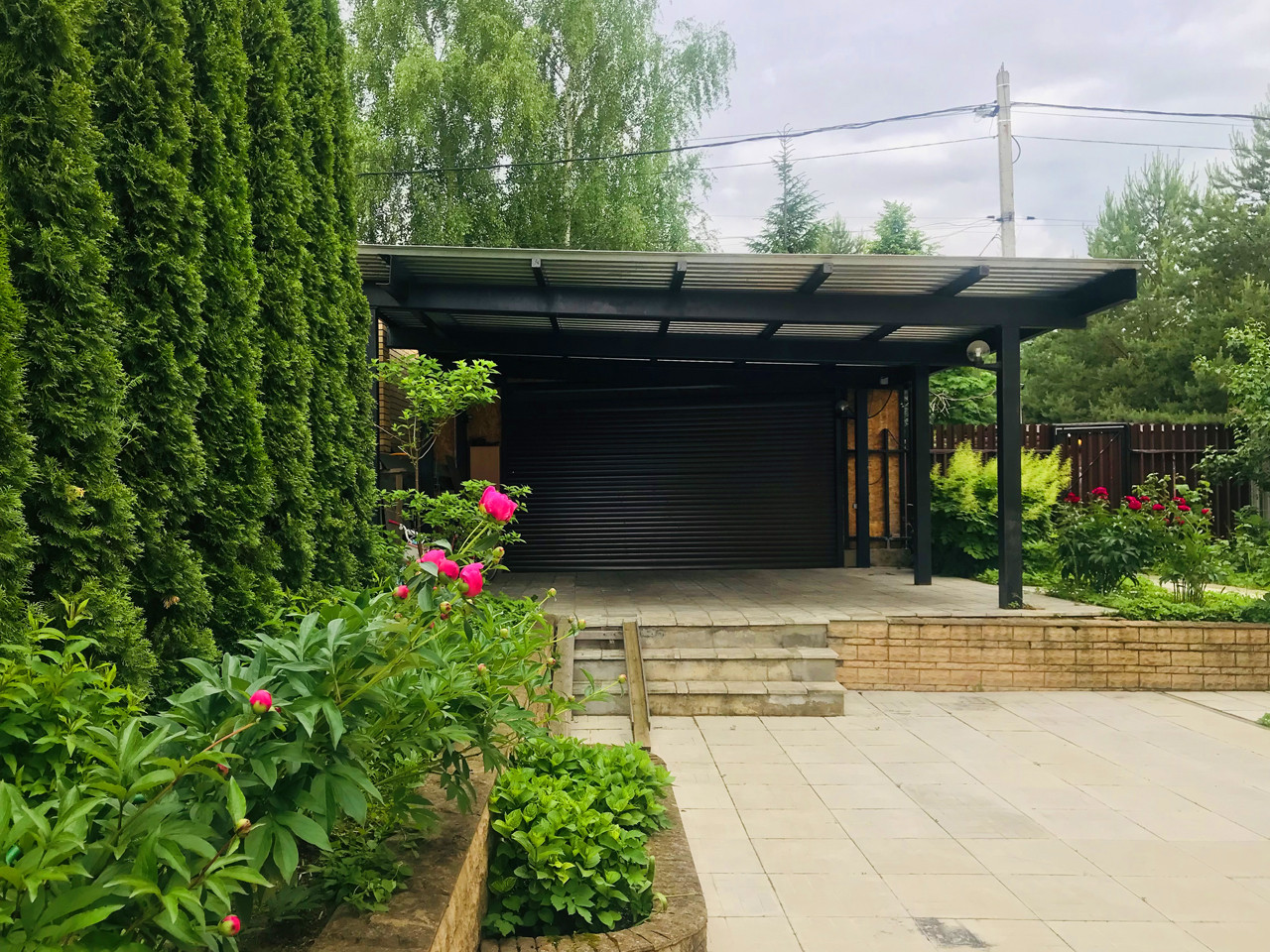 Участок 8 соток, садовые деревья, кустарники, глухой забор, беседка, подъездная дорога, асфальт до участка. За воротами на территории, навес - стоянка на 2 авто.