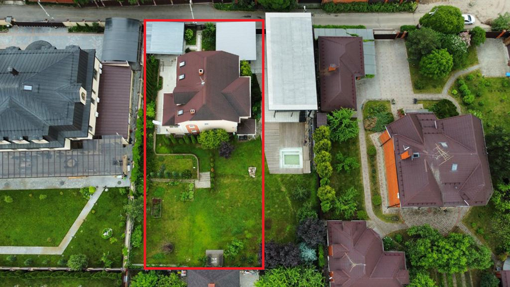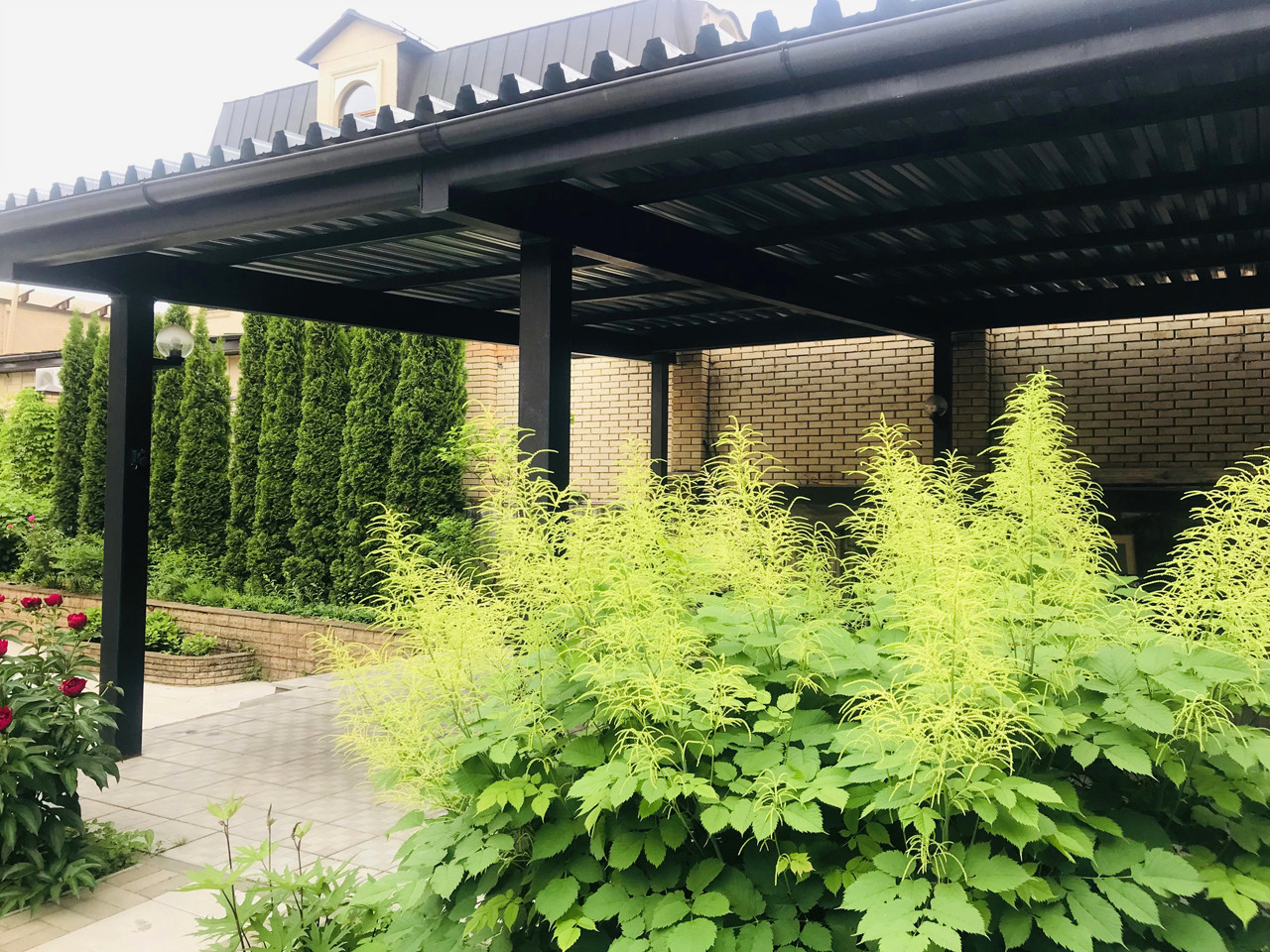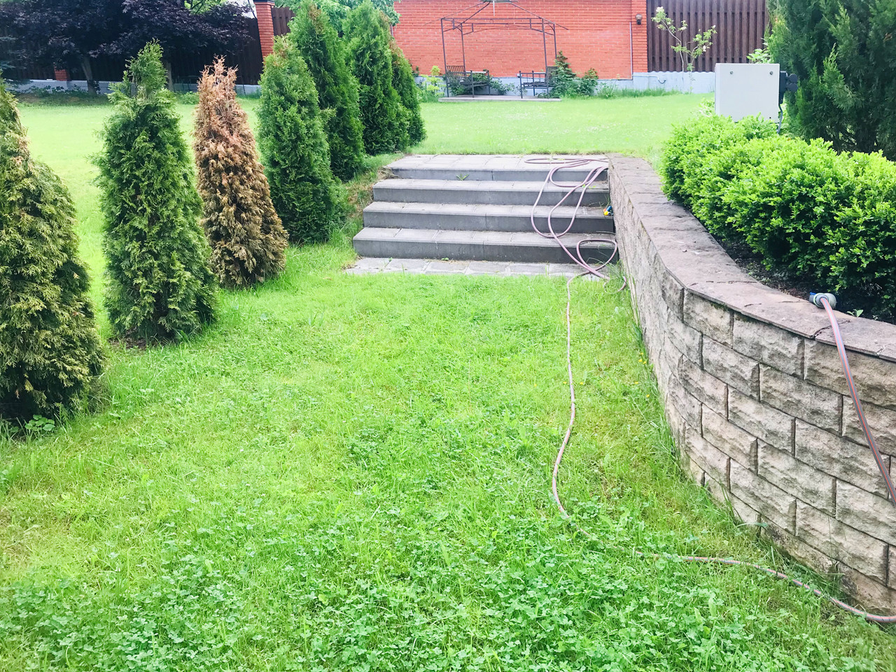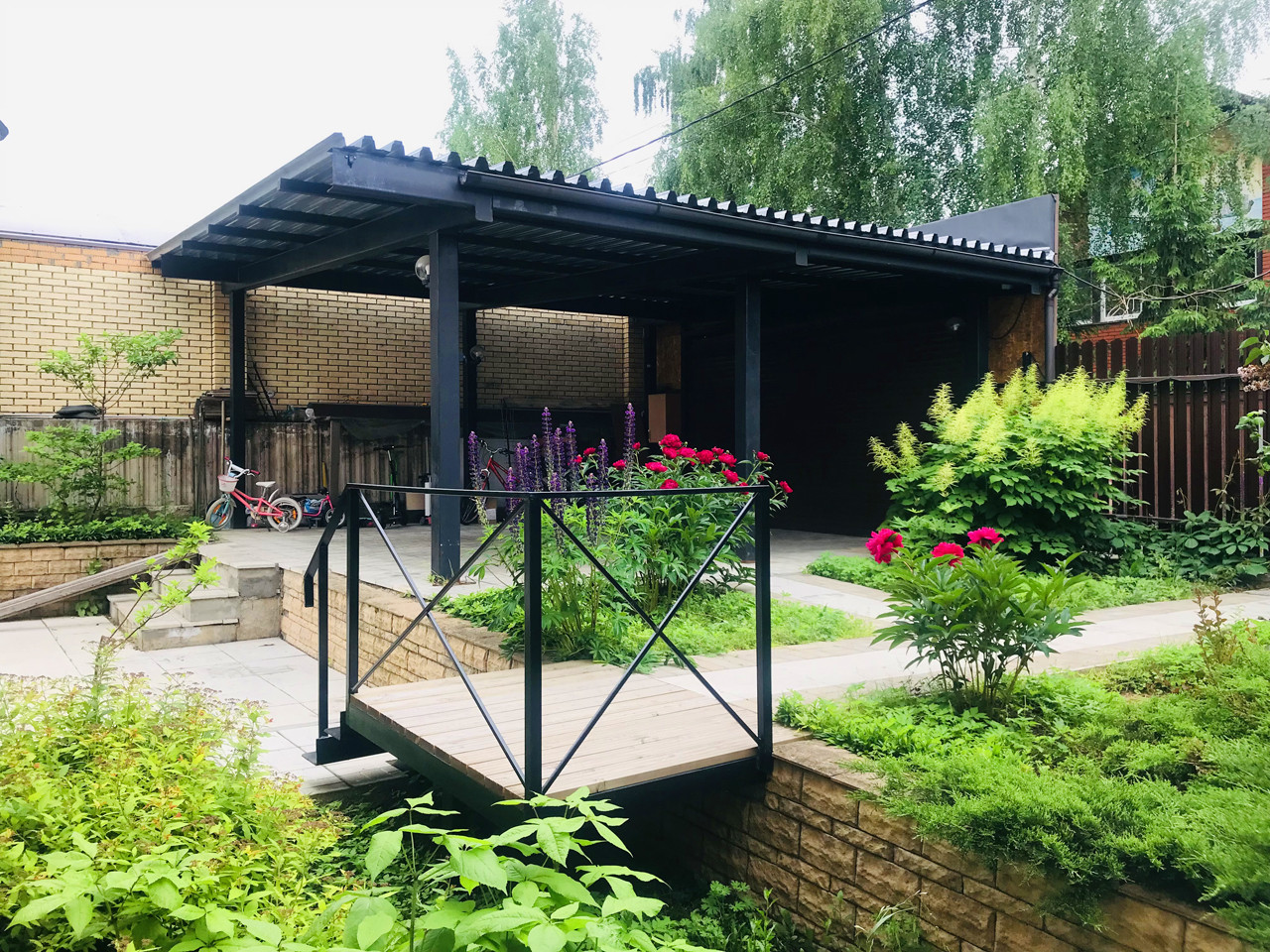 Участок 8 соток, садовые деревья, кустарники, глухой забор, беседка, подъездная дорога, асфальт до участка. За воротами на территории, навес - стоянка на 2 авто.