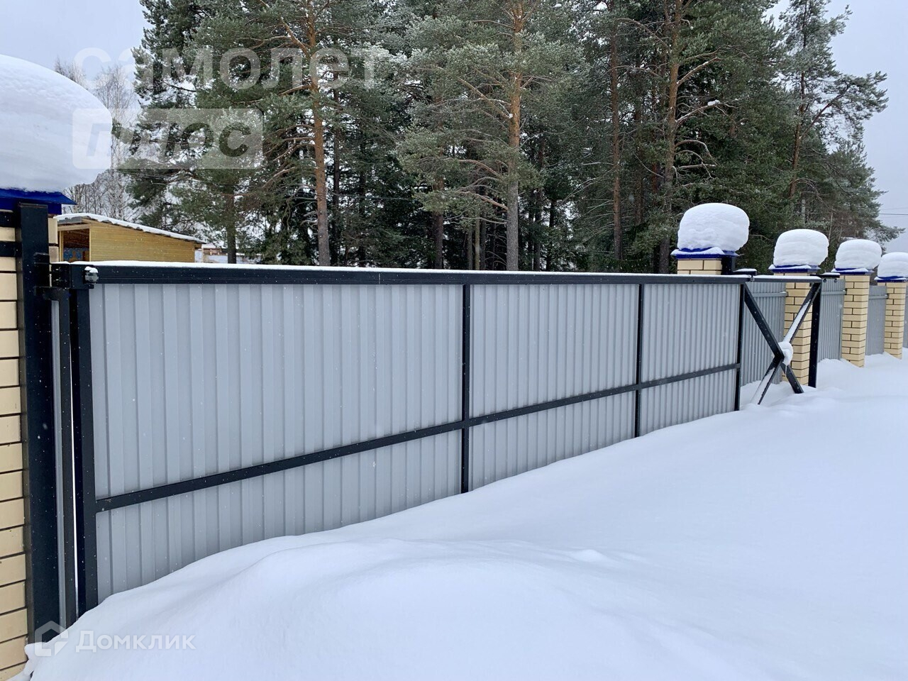 Площадь-1272 кв.м. Забор: кирпичные колонны, связаны профильной трубой+ профнастил. Автоматические откатные ворота. Оборудован свой спуск к реке.