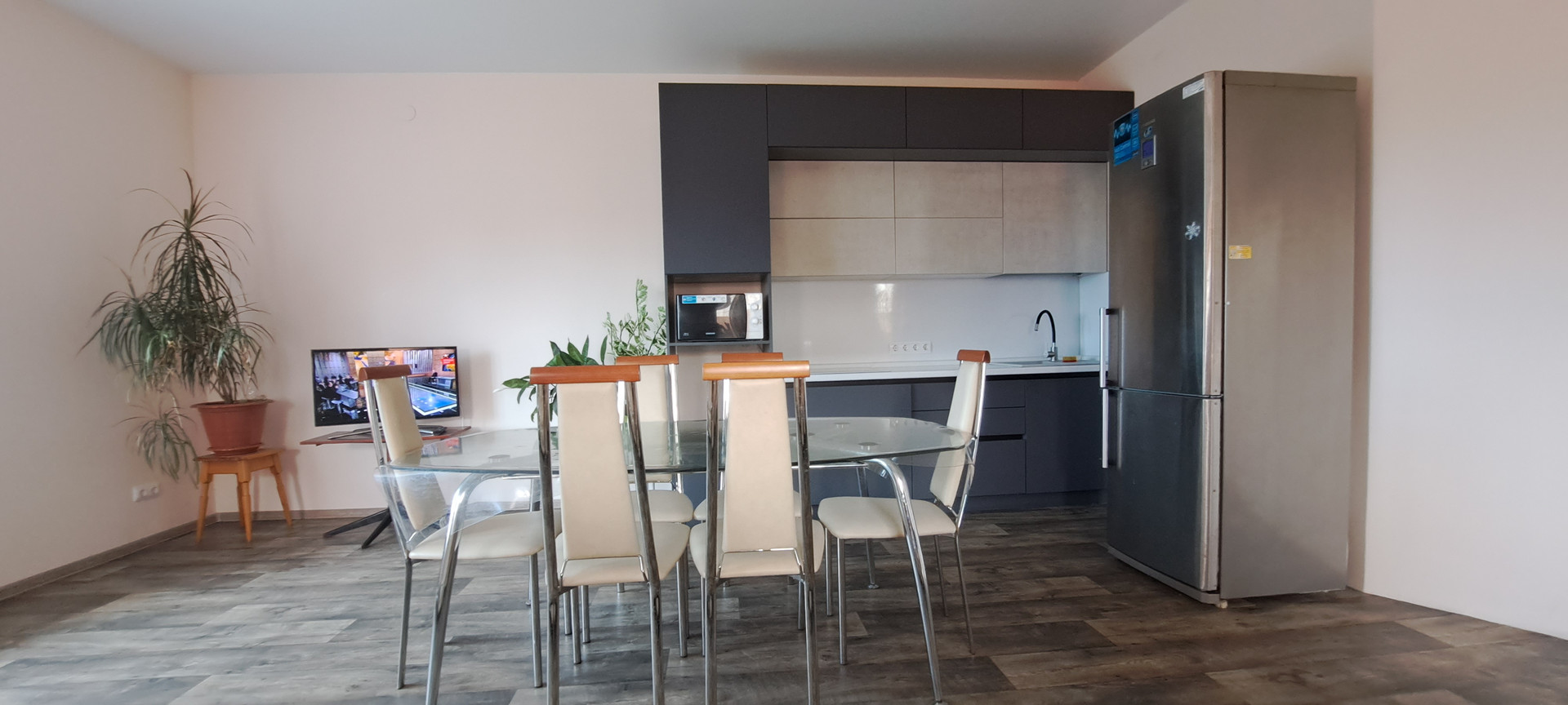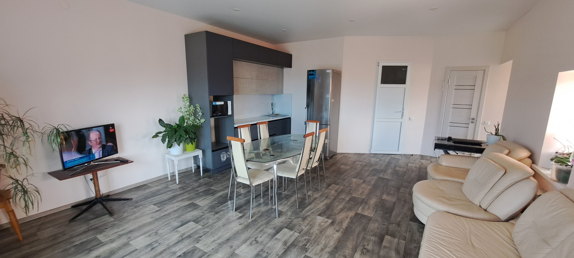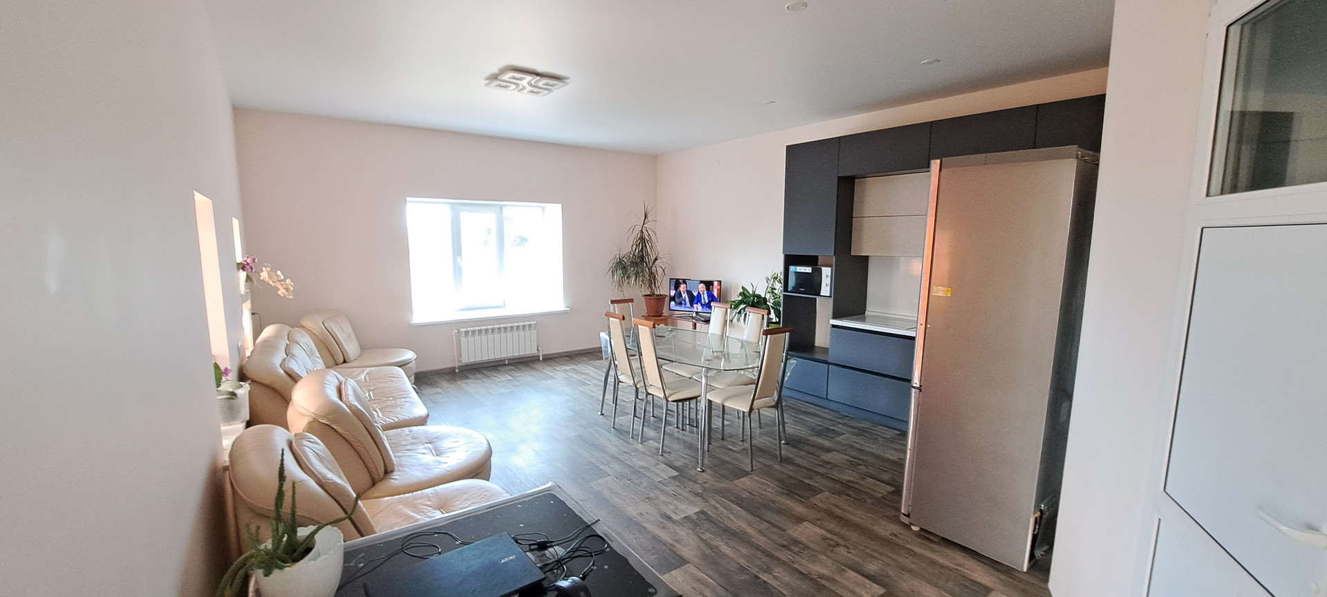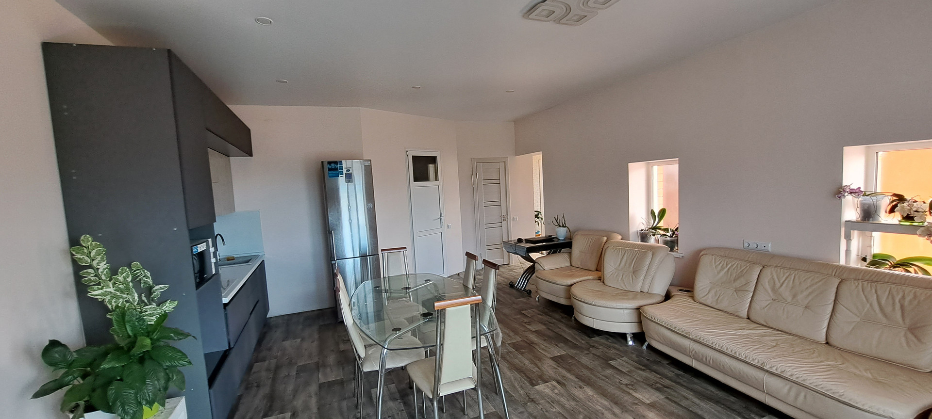 окна пластиковые, кухня студия 30 м. спальня 14 м. тех комната 15 м.  высота потолков 2,80 натяжные потолки пов сему дому водяные тёплые полы