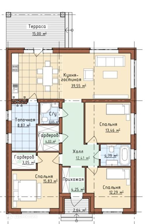 В доме 3 спальных комнаты, просторная кухня-гостиная с выходом на крытую террасу.