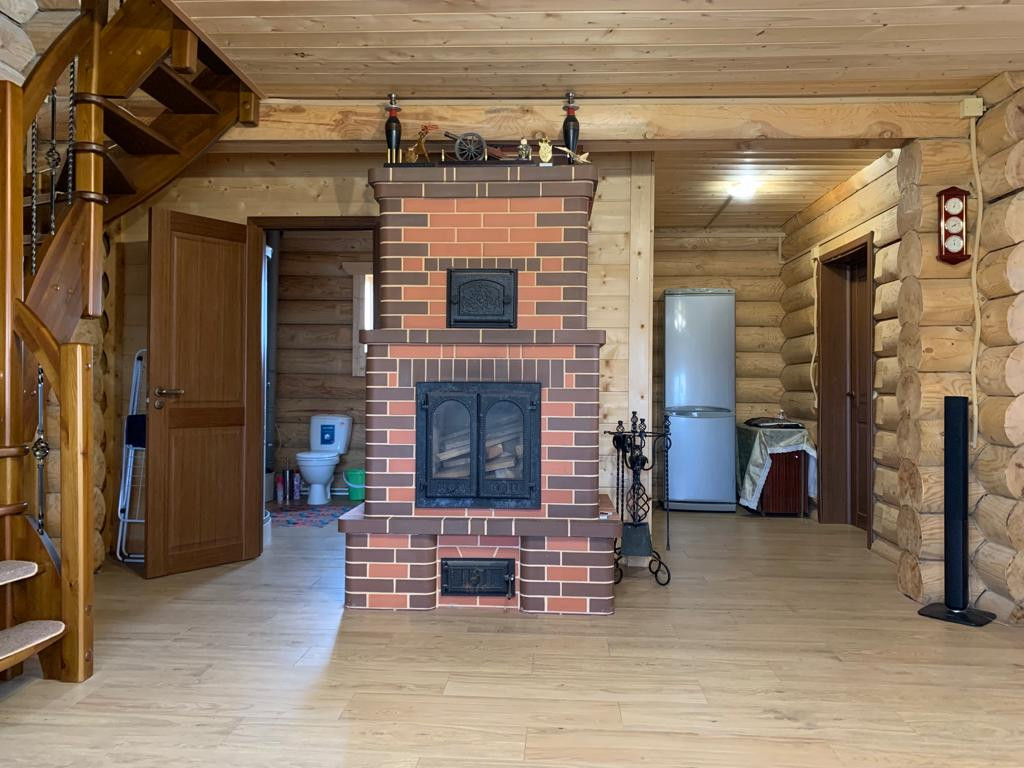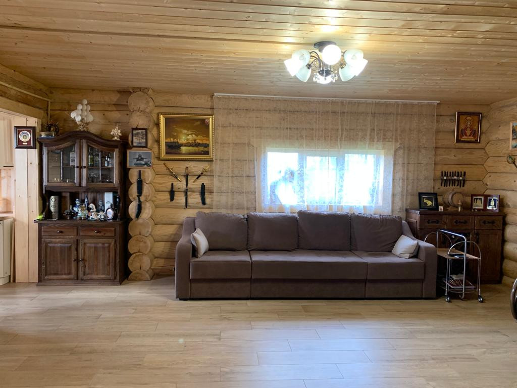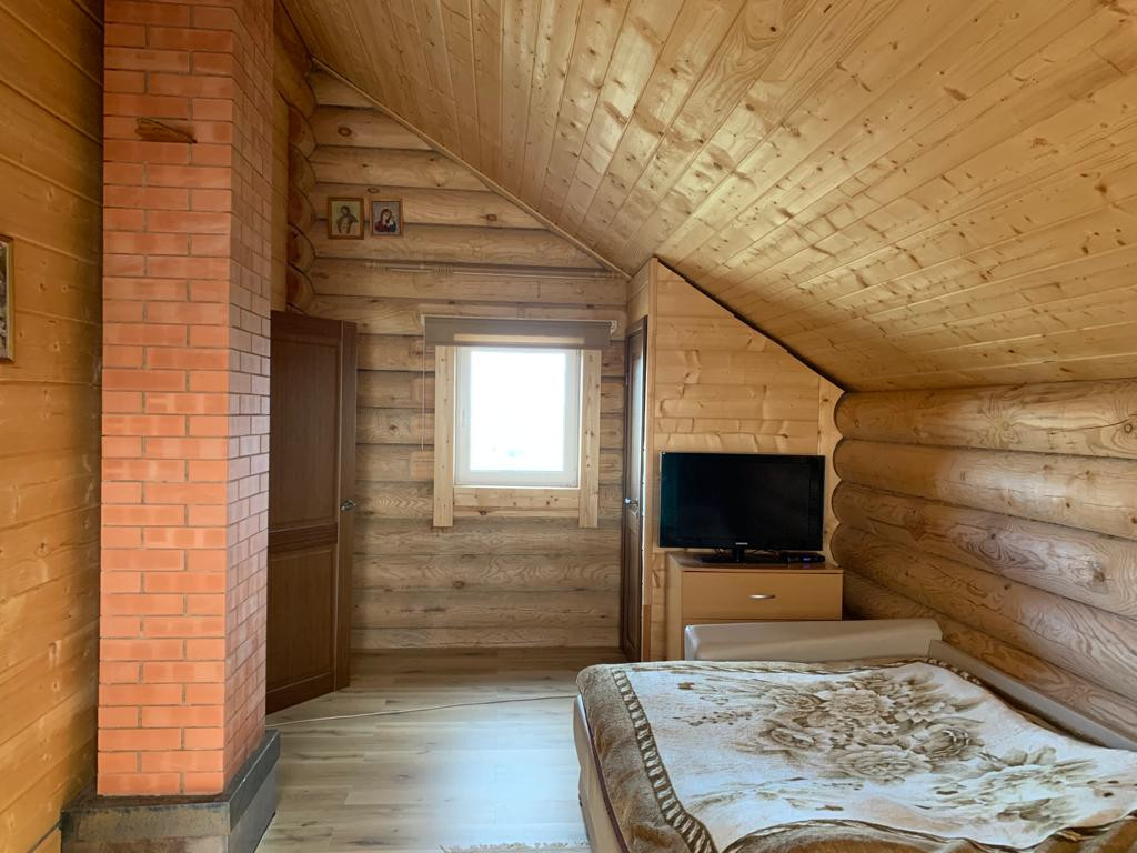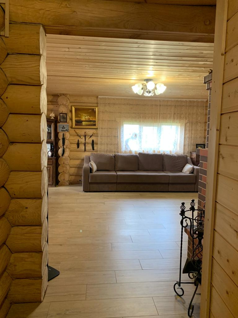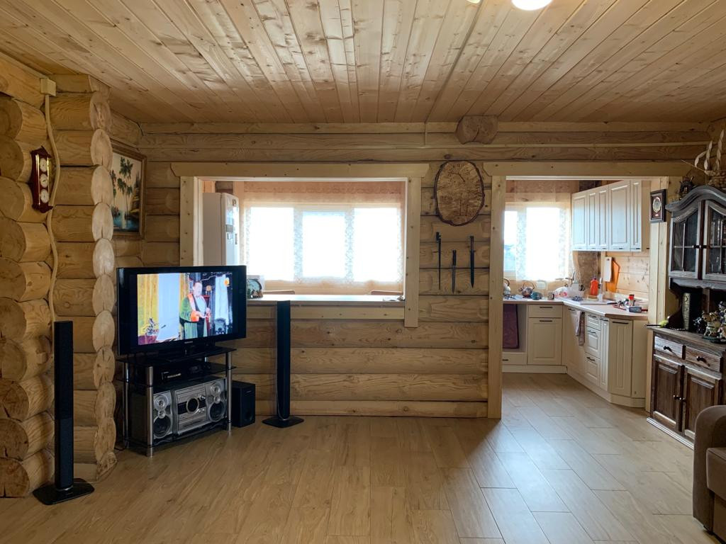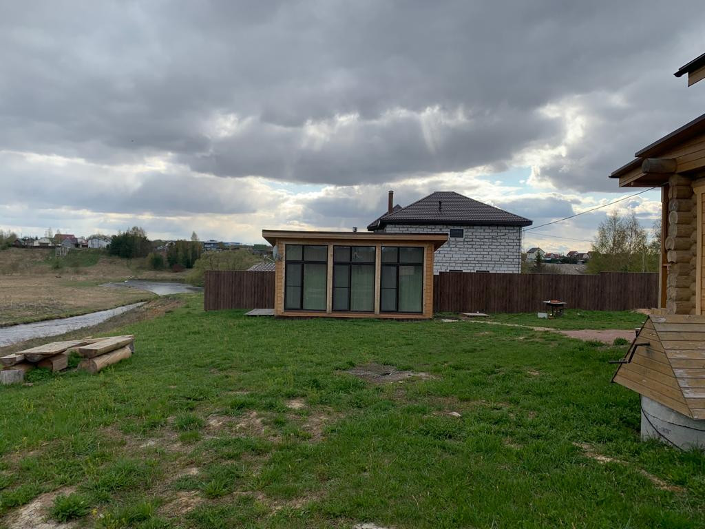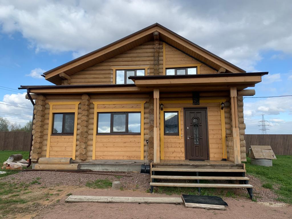 Новый бревенчатый дом на берегу реки Ижора. Поселок Войскорово расположен в Тосненском районе Ленинградской области, удаленность от Санкт-Петербурга 17 км. Выезд из поселка на Московское шоссе.