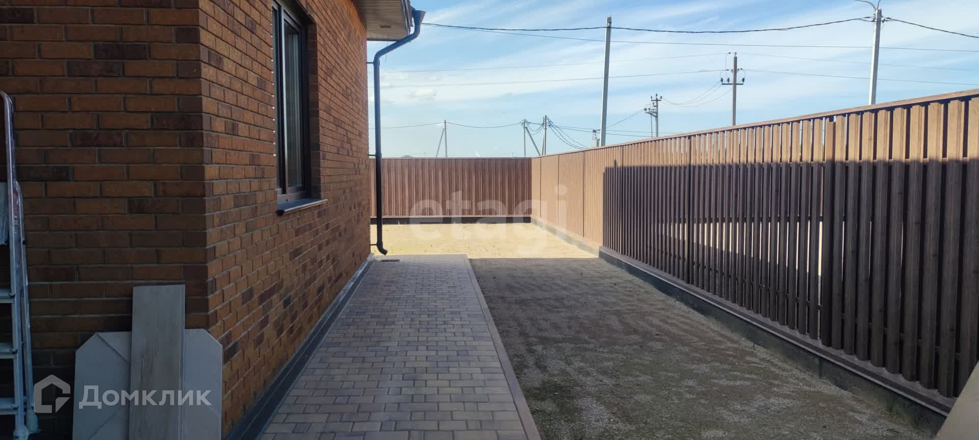 Участок выровнен и подготовлен для засеивания газоном , дорожки и площадка под парковку выложены тротуарной плиткой.