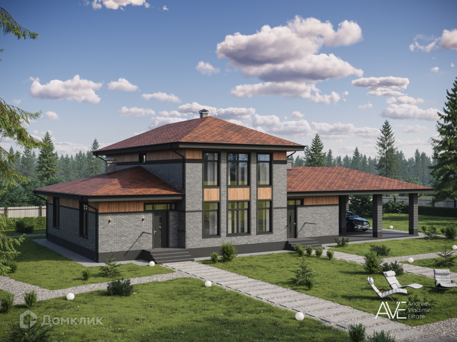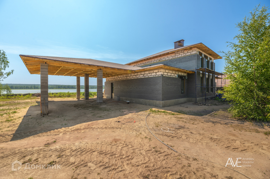 В продаже новый дом в стиле Фрэнка Ллойда Райта на первой линии озера Волочаевское под внутреннюю отделку, расположенный в охраняемом коттеджном поселке Северная Корона.