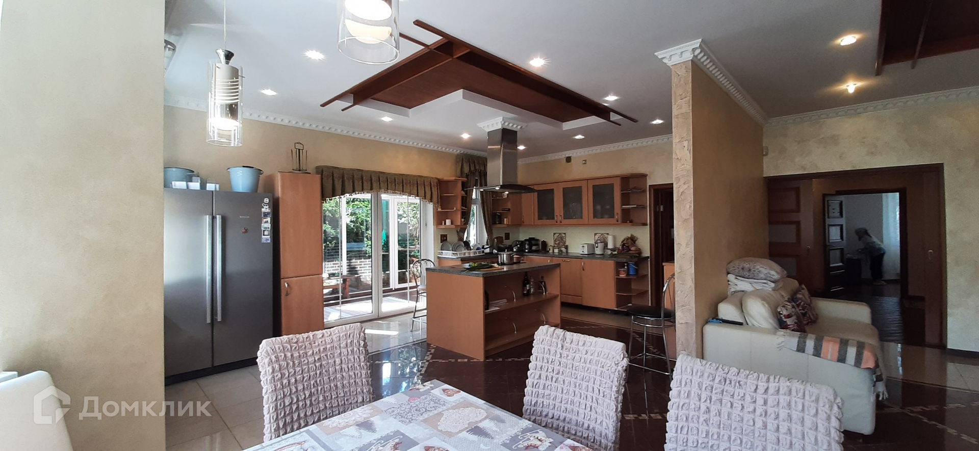 На первом этаже просторная кухня-столовая с панорамным остеклением и выходом на застекенную террасу и гостевая комната,с/у. А также постирочная ,гараж и тежнические помещения.
