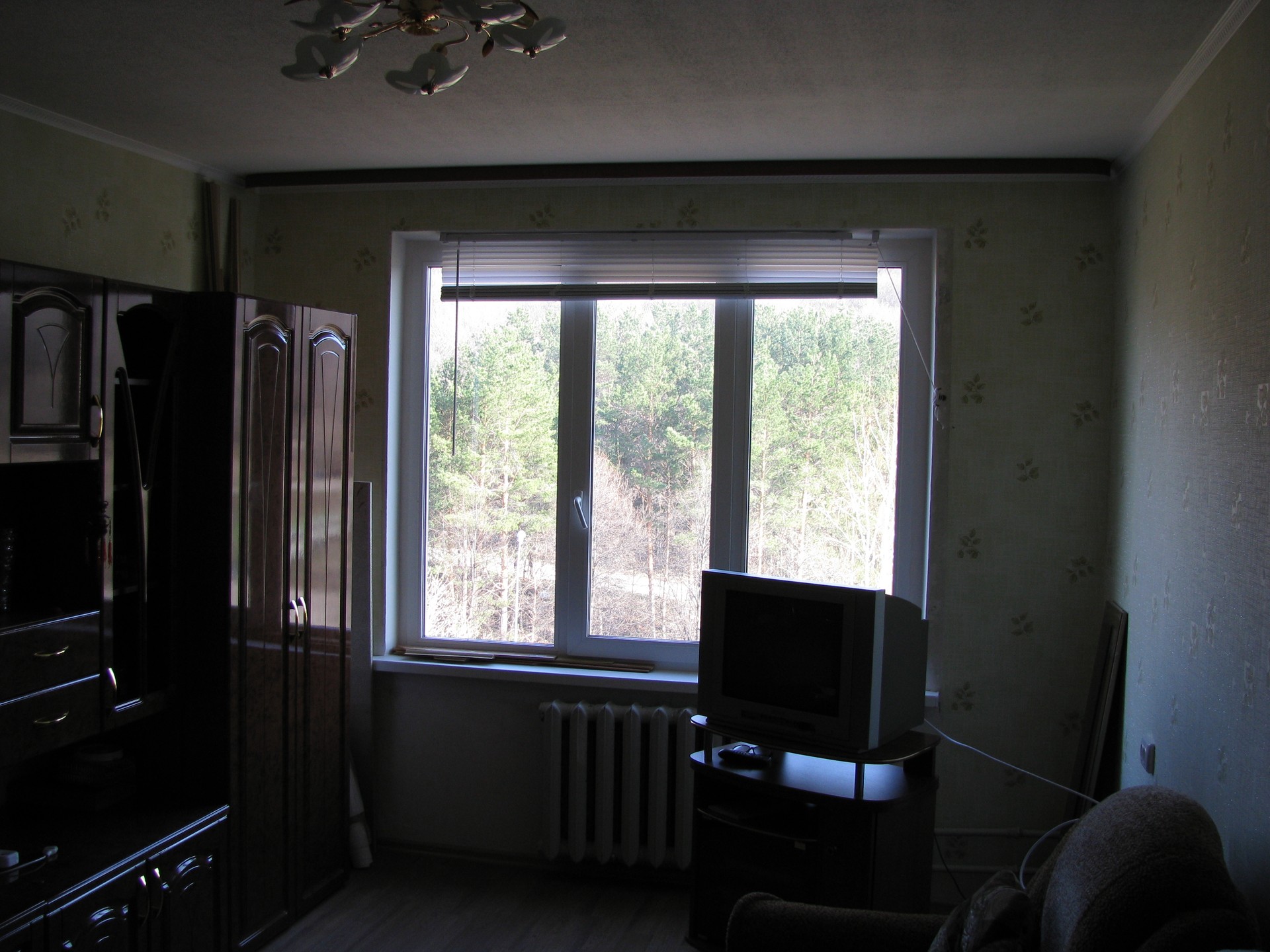 Очень красивый вид из окна на лес и церковь.