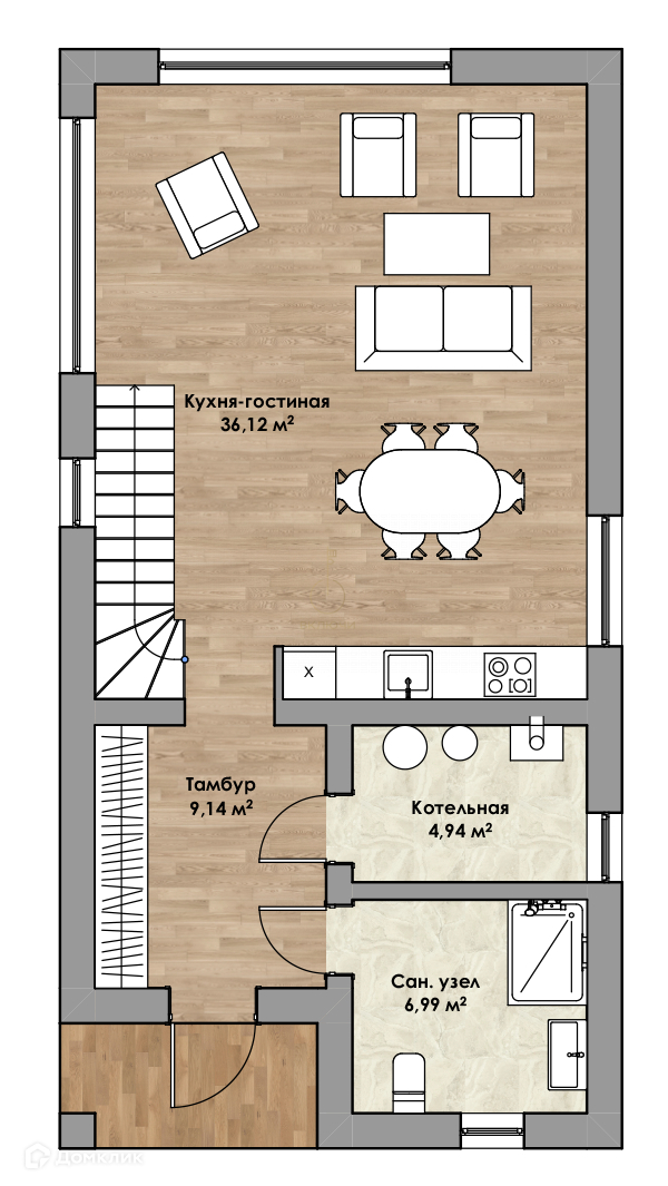 Первый этаж: санузел, котельная, просторная кухня-гостинная.