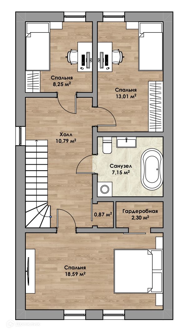 Второй этаж: три спальни и большая ванная комната.