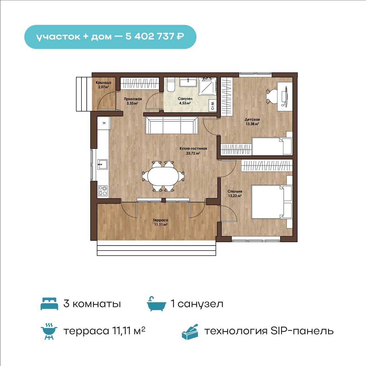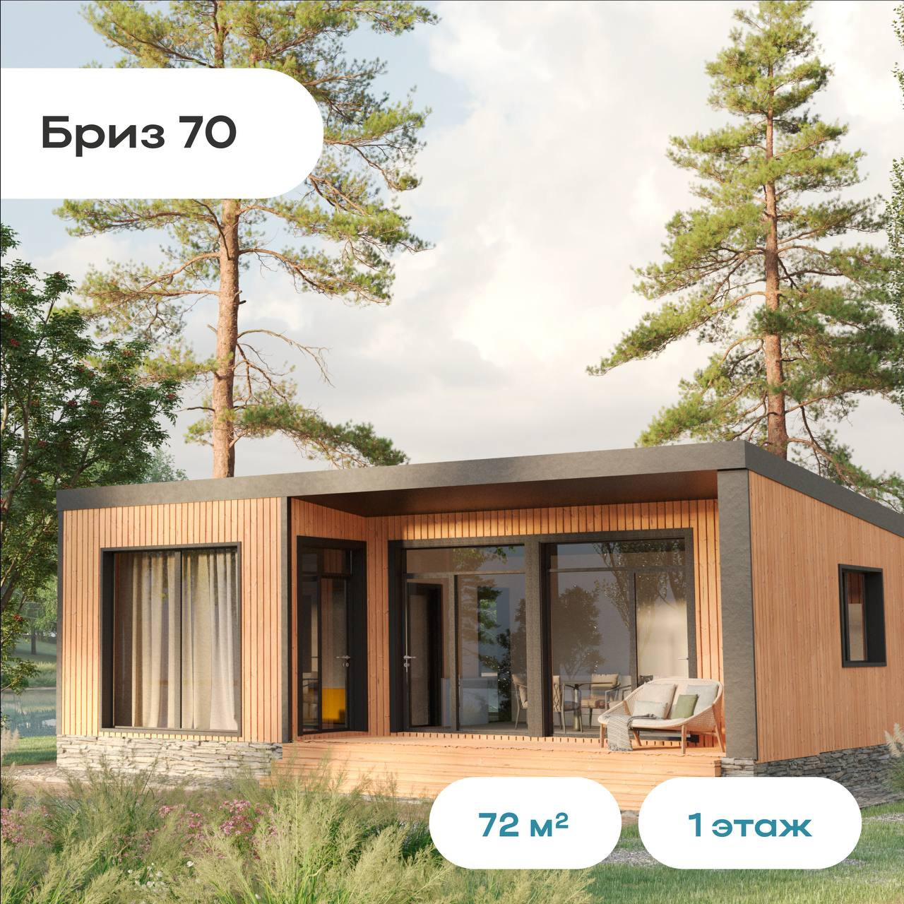 Площадь 71 м2 — золотой стандарт для семьи из трёх человек. На террасе можно играть в настольные игры, устраивать летом семейные обеды или отдыхать на подвесных качелях. В кухне-гостиной — готовить с красивыми видами на природу. Детскую — отдать ребёнку для самовыражения, чтобы он чувствовал себя взрослым и свободным. А спальню оставить для своего комфортного сна под щебетание птиц за окном.