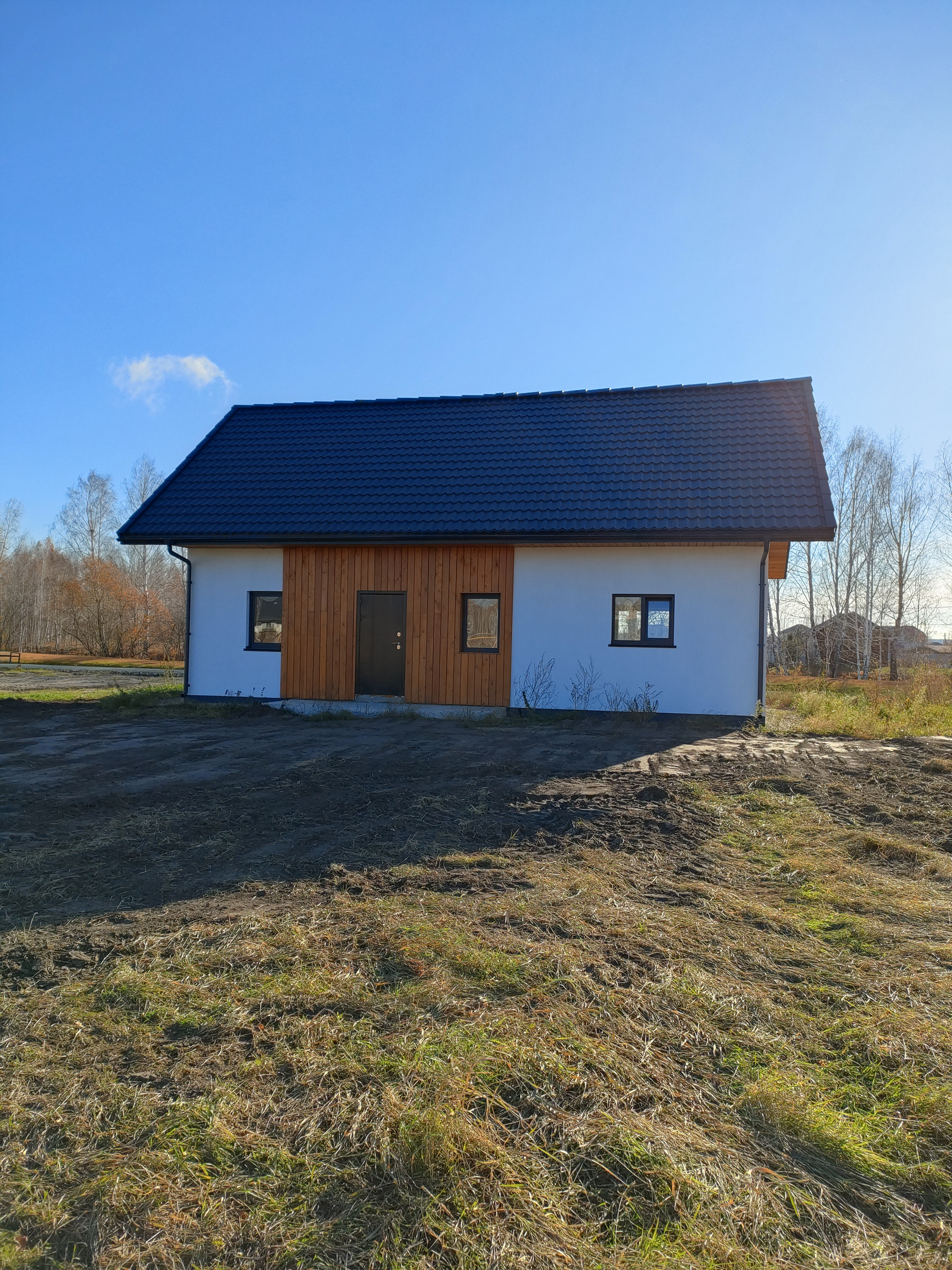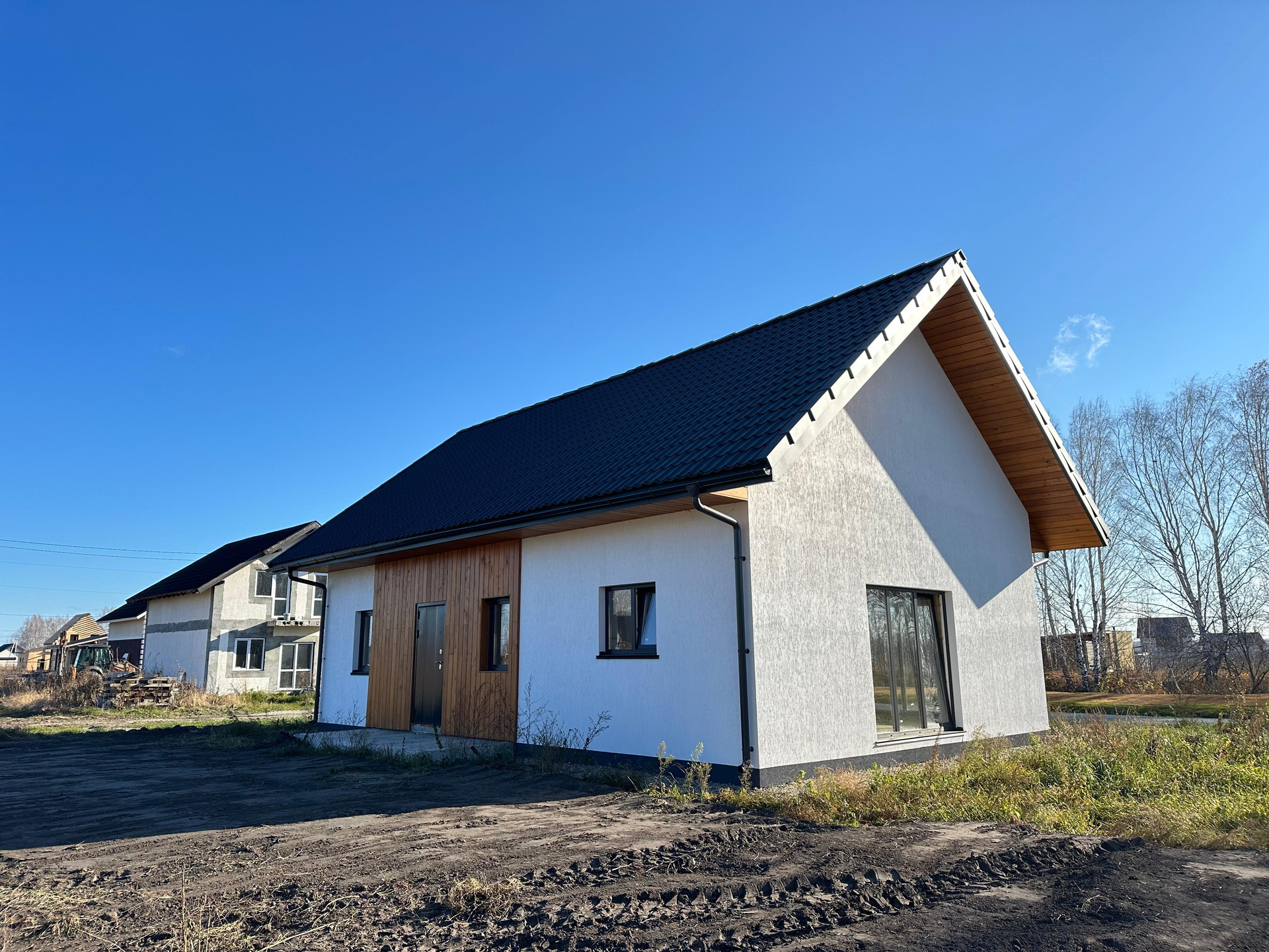 Фундамент: армированная бетонная подушка выполнена с запасом 250 мм и с обратной отсыпкой песка 600 мм, в котловане заложены все коммуникации. Мягкая отмостка с водоотведением, мембрана заложена и засыпана галькой (не возникнет сложностей с размещением септика). Централизованного водоотведения в поселке нет.