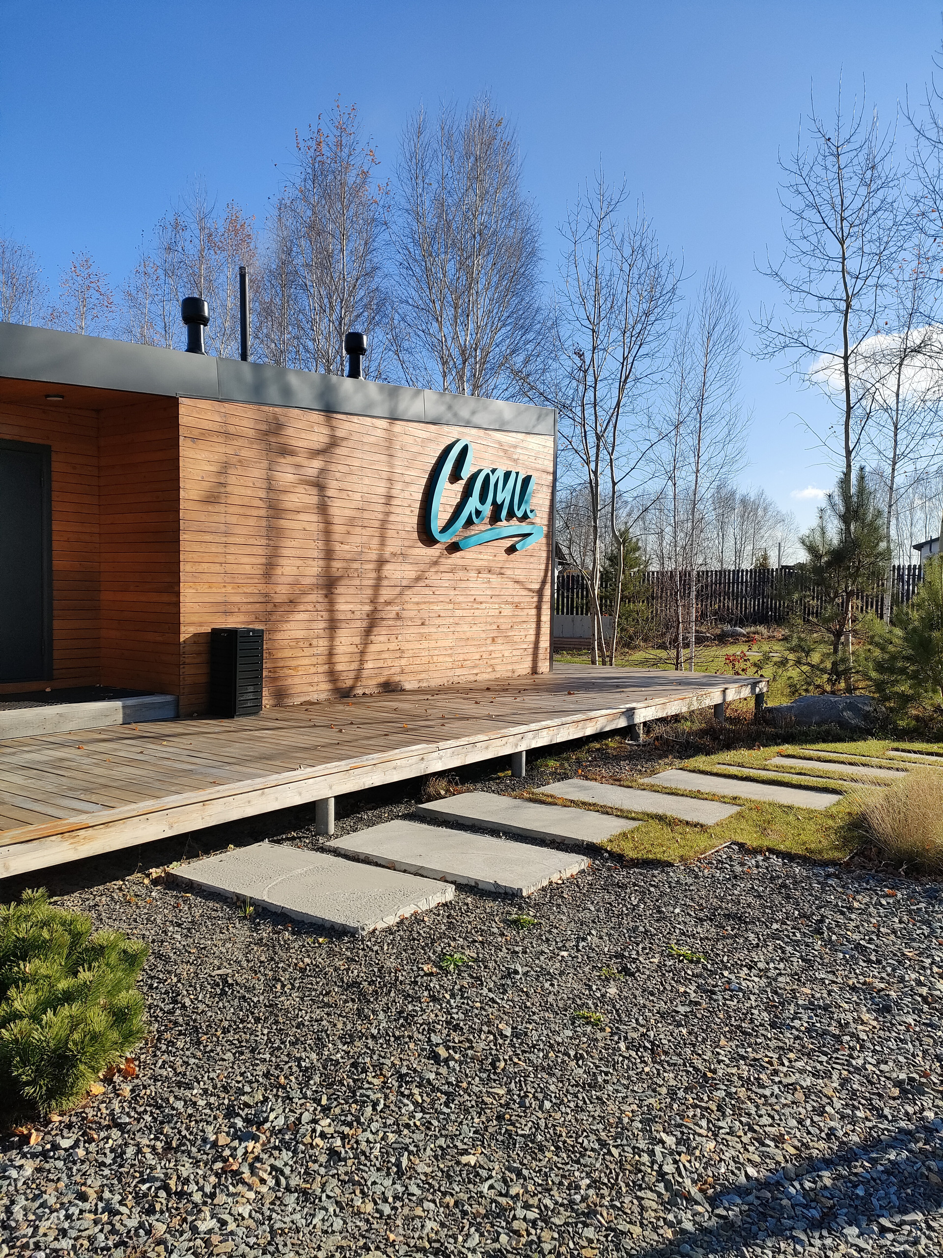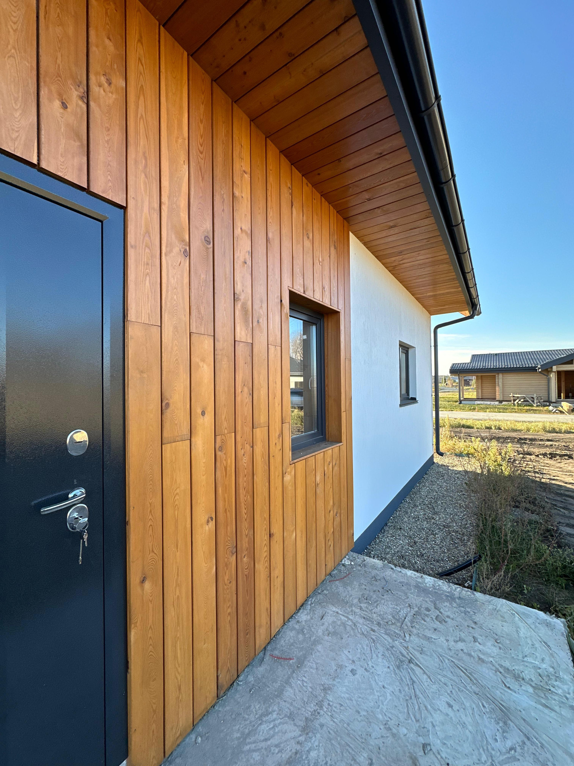 Декор фасада (карнизы, входная группа) выполнен доской из лиственницы – самый стрессоустойчивый вид бруса.