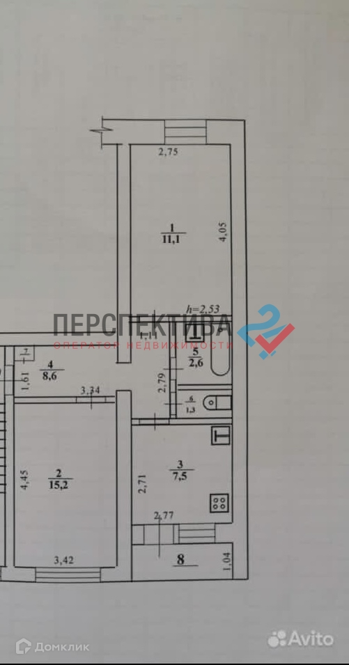 Вместительная кухня - 7,5 м/кв, Просторная прихожая - 8,6 м/кв. Две комнаты имеют площадь, 15,2 и 11,1 кв/м.