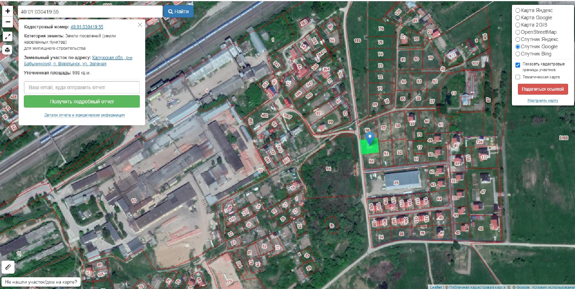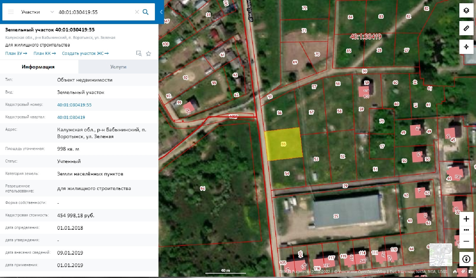 Продаётся земельный участок площадью 998 кв. м., по адресу Калужская область, Бабынинский район, посёлок Воротынск, ул. Зелёная, КН 40:01:030419:55. Категория - земли населённых пунктов, вид разрешённого использования - для жилищного строительства, что предполагает строительство индивидуального жилого дома не более трёх этажей для проживания одной семьи. Соседи активно строятся, рядом магазин Светофор. Свет, газ, вода. Участок виден на Публичной кадастровой карте, метка на карте здесь соответствует действительности, просьба осмотр произвести самостоятельно. В наличии ещё четыре участка там же, номера  :27, :54, :81, :84  от 8 до 10 соток.  Цена 22 тыс руб за сотку. Ипотека возможна. Собственник.