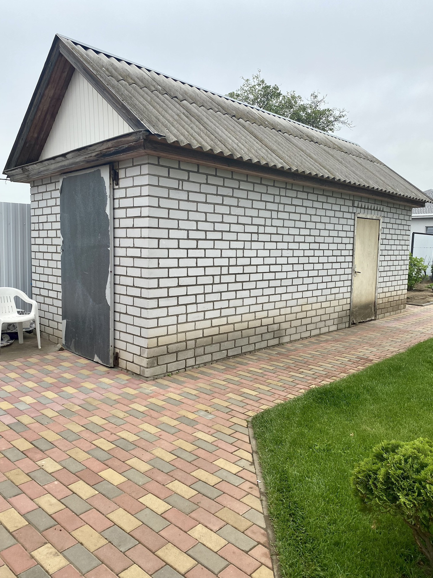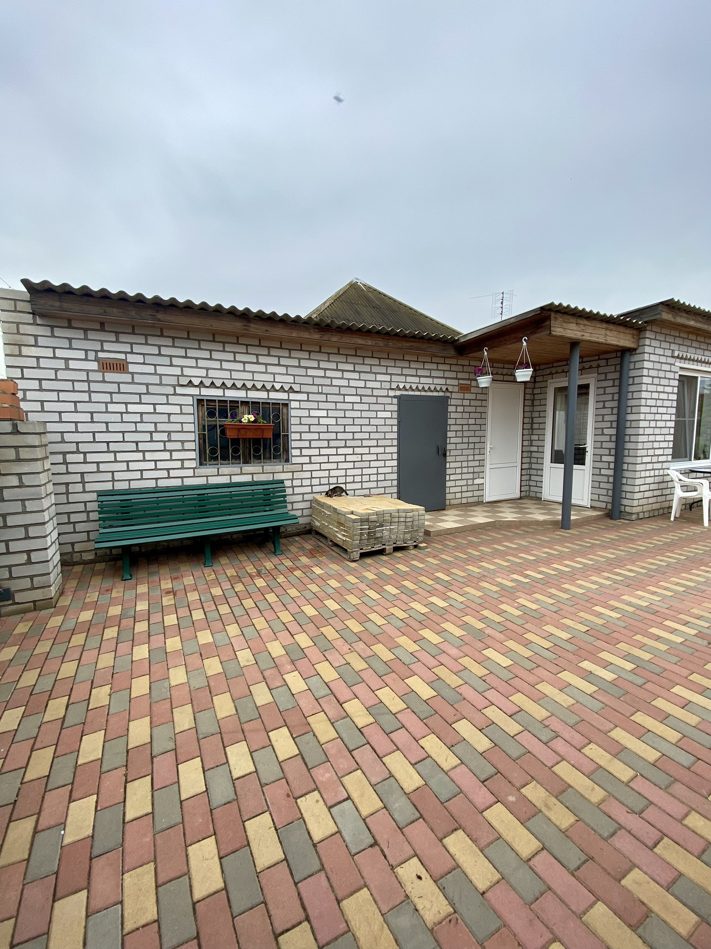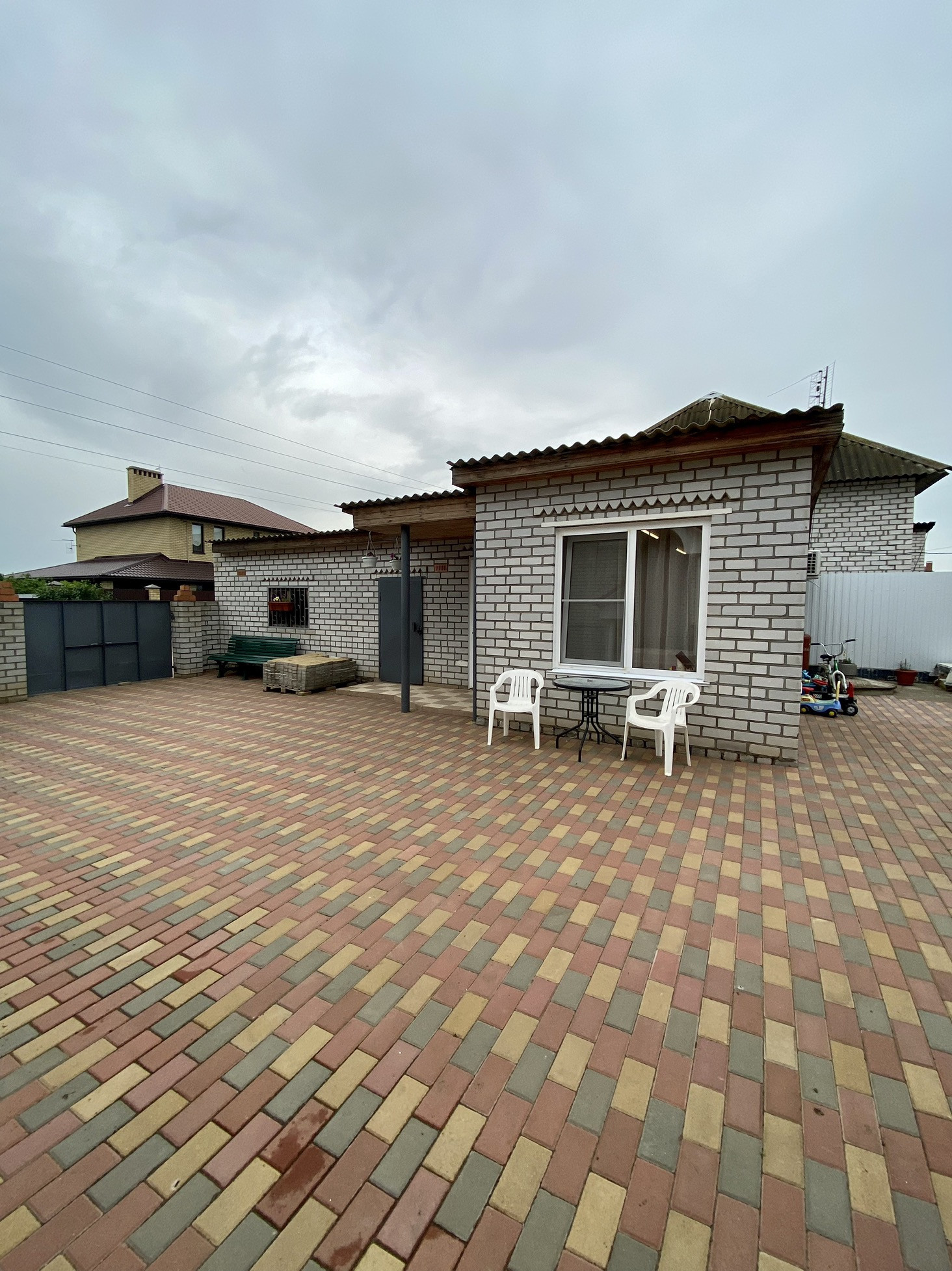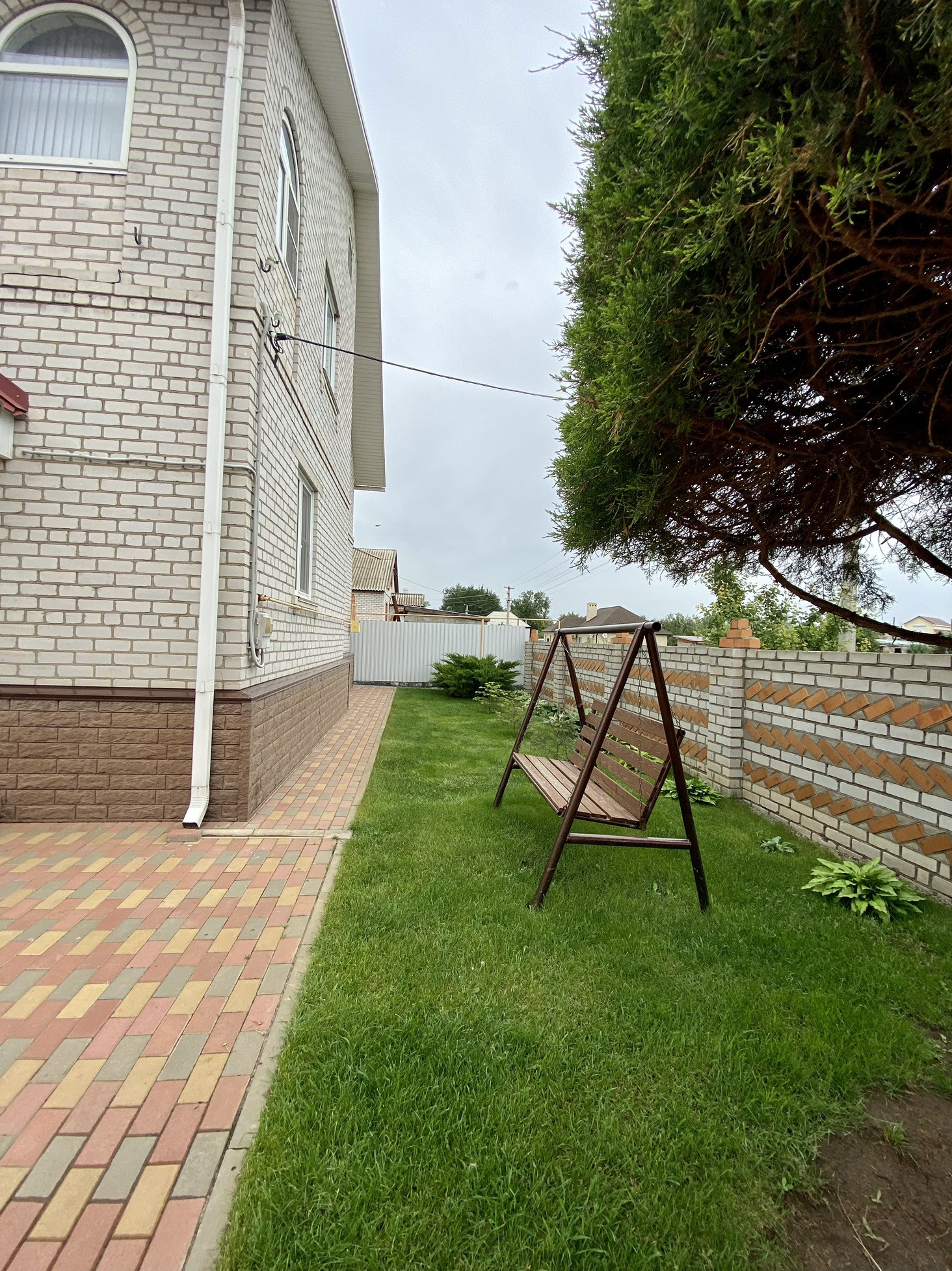 На участке птичий вольер, теплица, замощенные брусчаткой дорожки и площадка перед домом. По периметру участка ограждение из металлосайдинга, вход украшает оригинальный кирпичный забор. Перед забором дома дополнительно несколько парковочных мест.