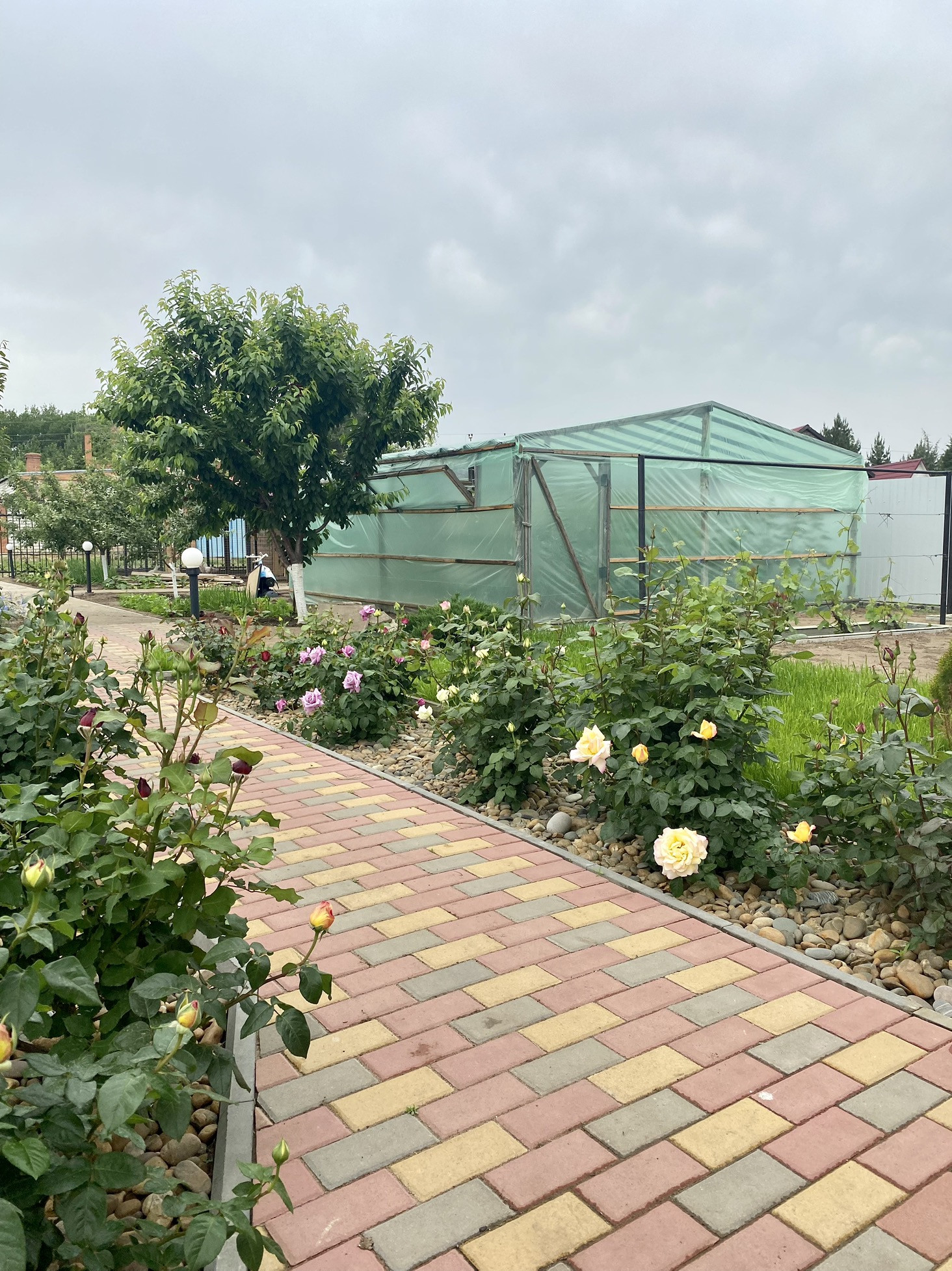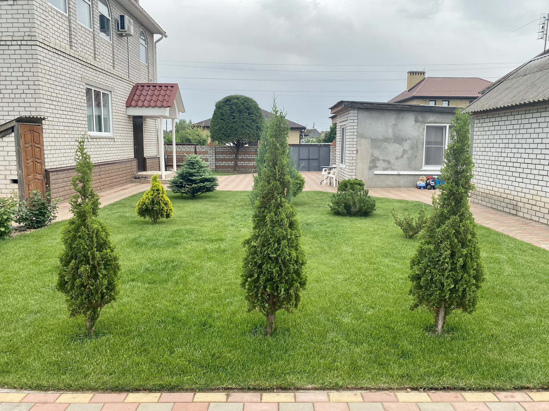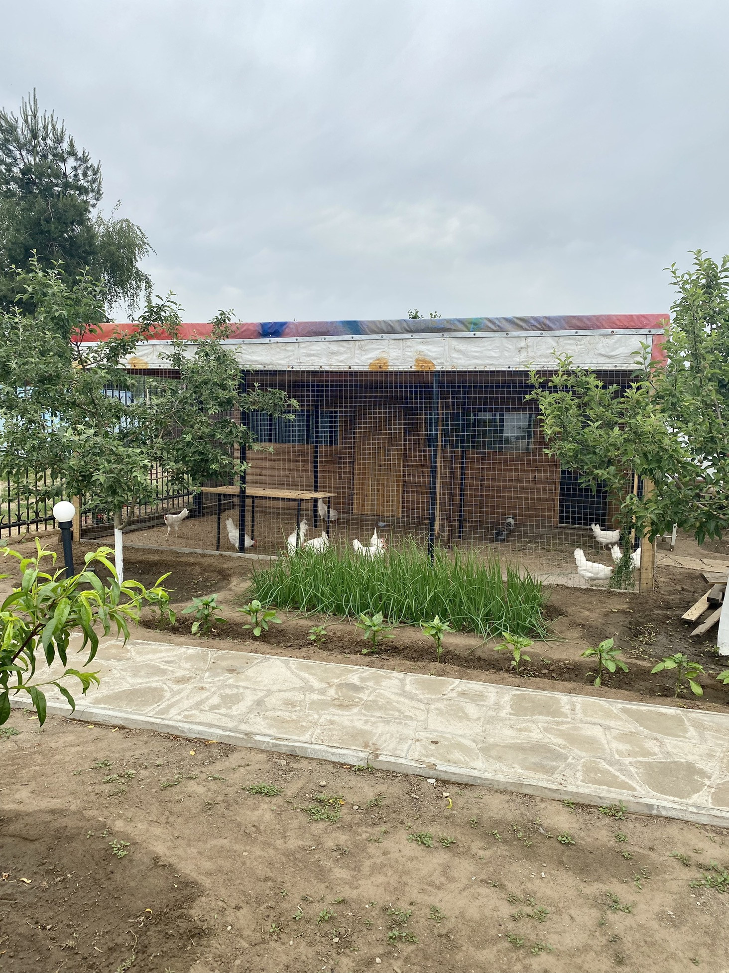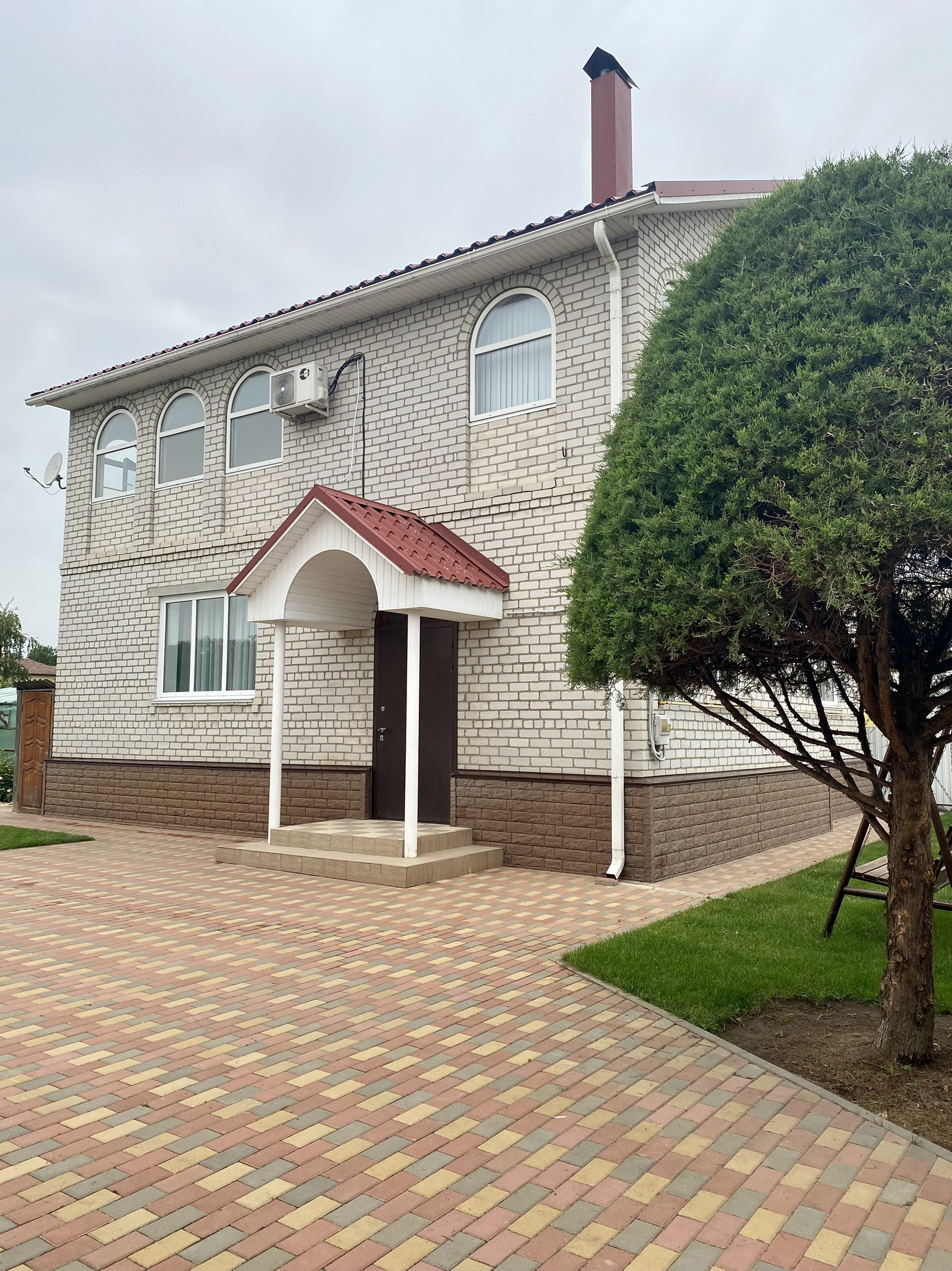 На участке птичий вольер, теплица, замощенные брусчаткой дорожки и площадка перед домом. По периметру участка ограждение из металлосайдинга, вход украшает оригинальный кирпичный забор. Перед забором дома дополнительно несколько парковочных мест.