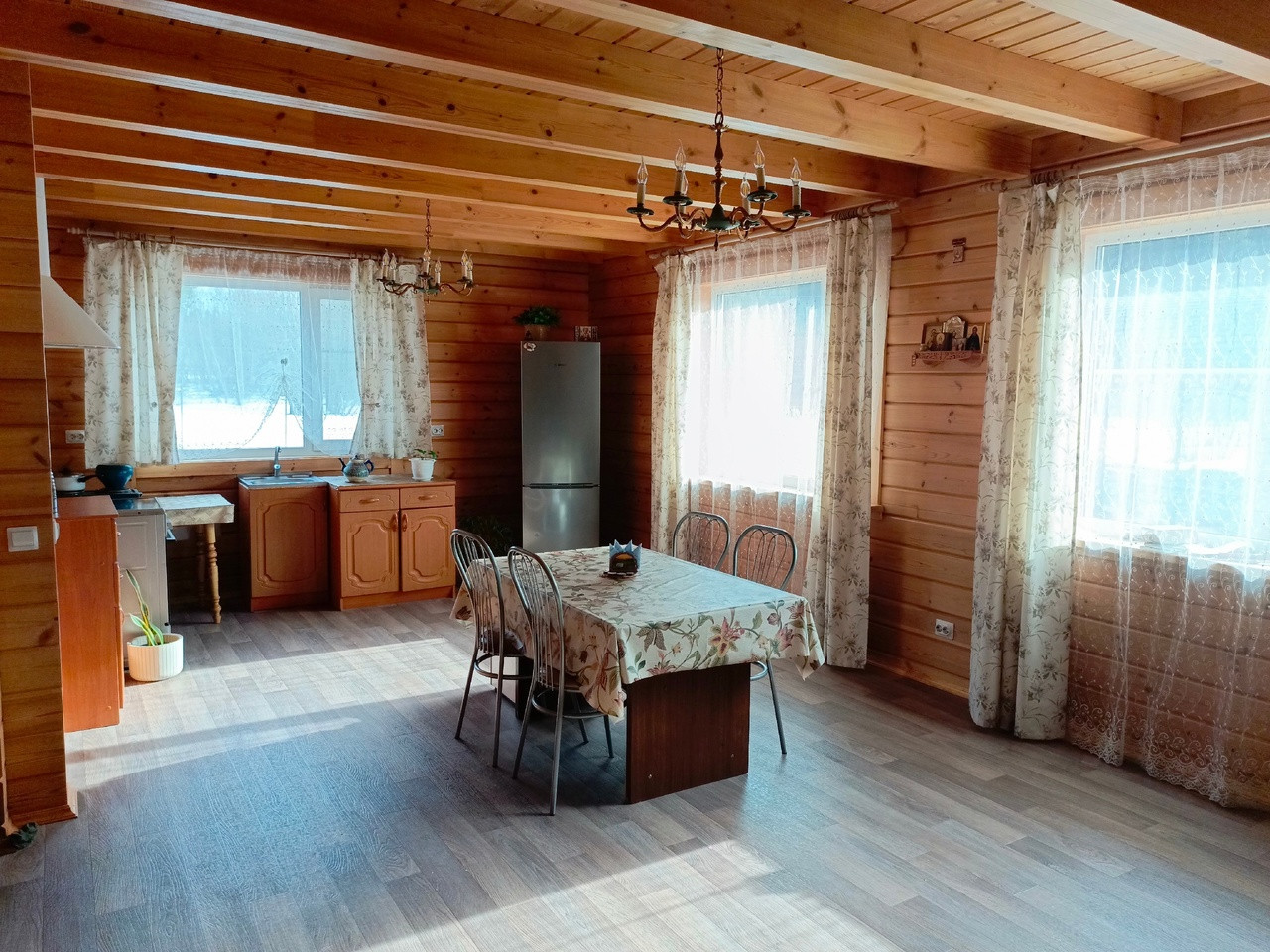 Первый этаж:прихожая (финская входная дверь), большая кухня-гостиная, 4 раздельные комнаты,санузел, бойлерная.
