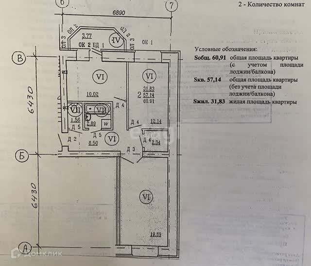 Общая площадь 60.91 м2