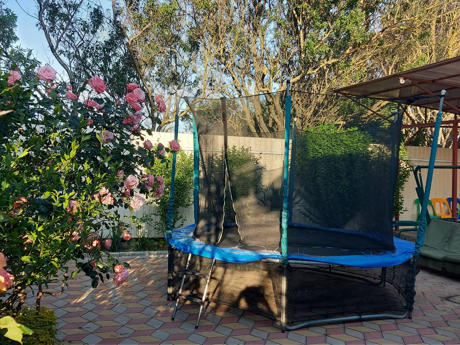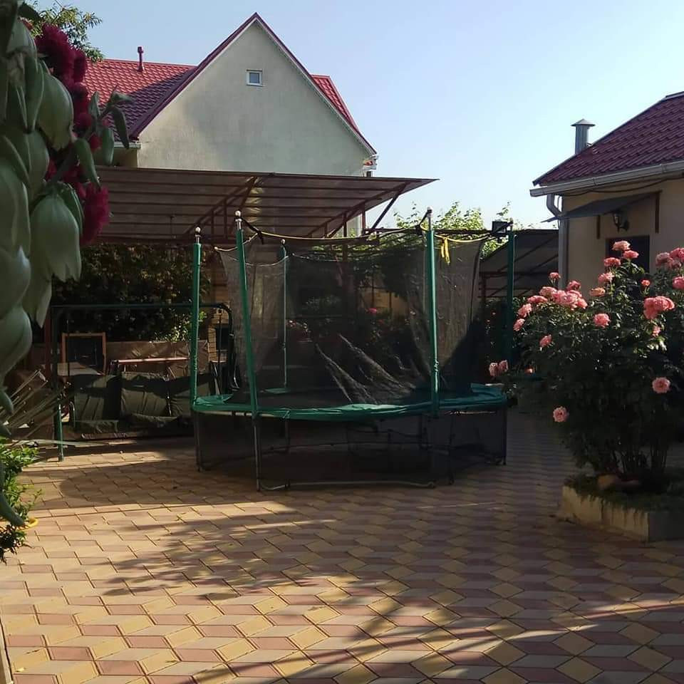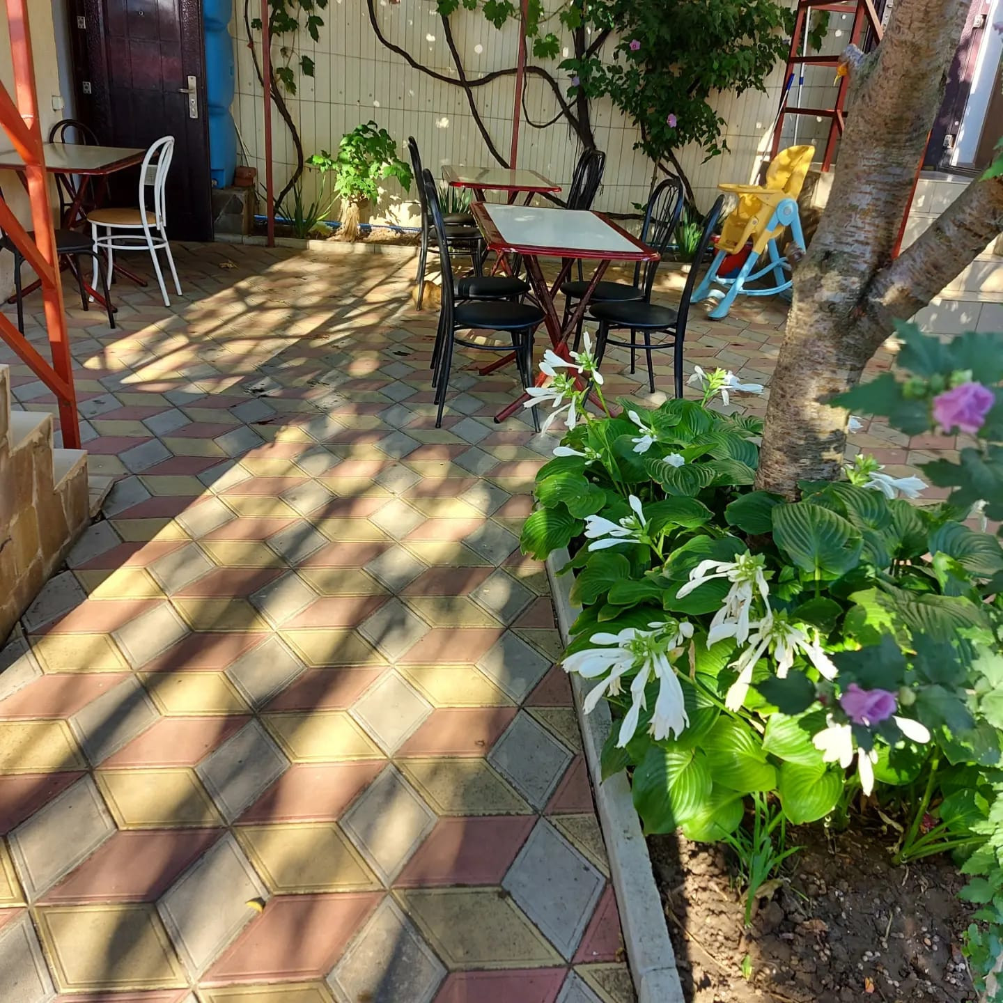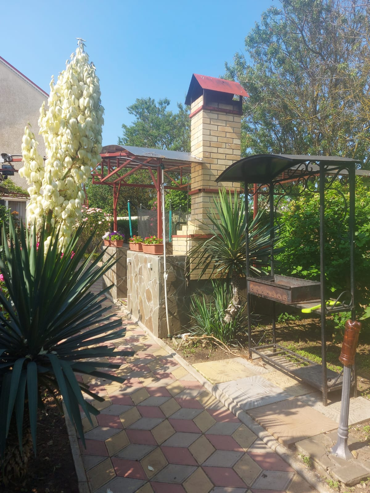 Ухоженная  дворовая территория облагорожена плодовыми деревьями: инжир, черешня, виноград разных сортов, декоративные кустарники, цветы, много роз.