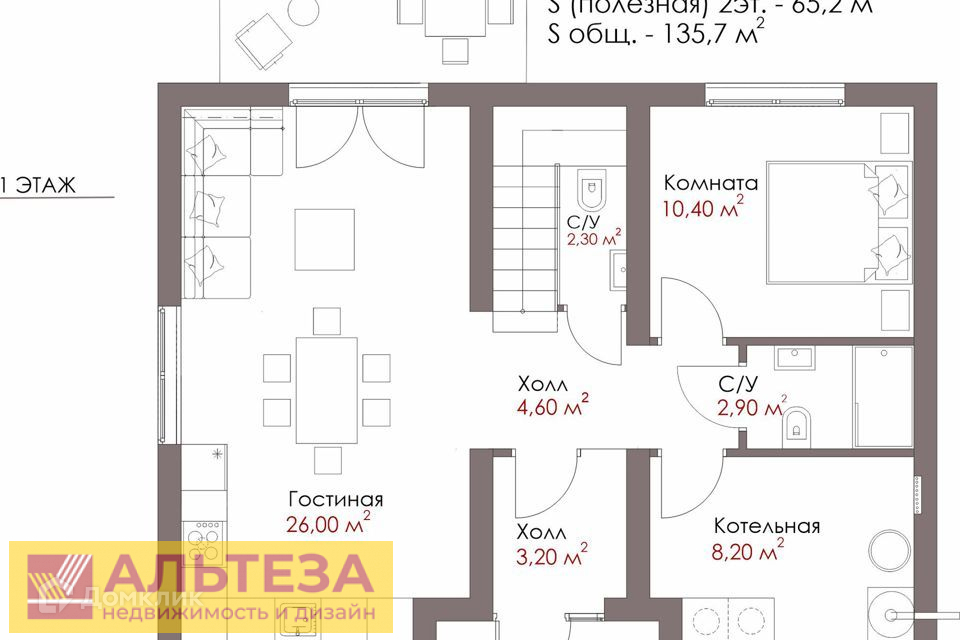 На первом этажекухня — гостиная с большими окнами и выходом на террасу, холл, с/у, гостевой с/у, большая котельная и гостевая комната.