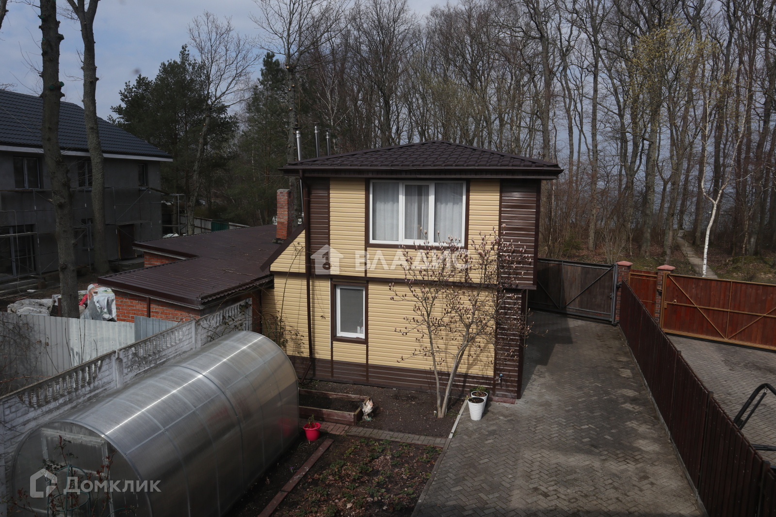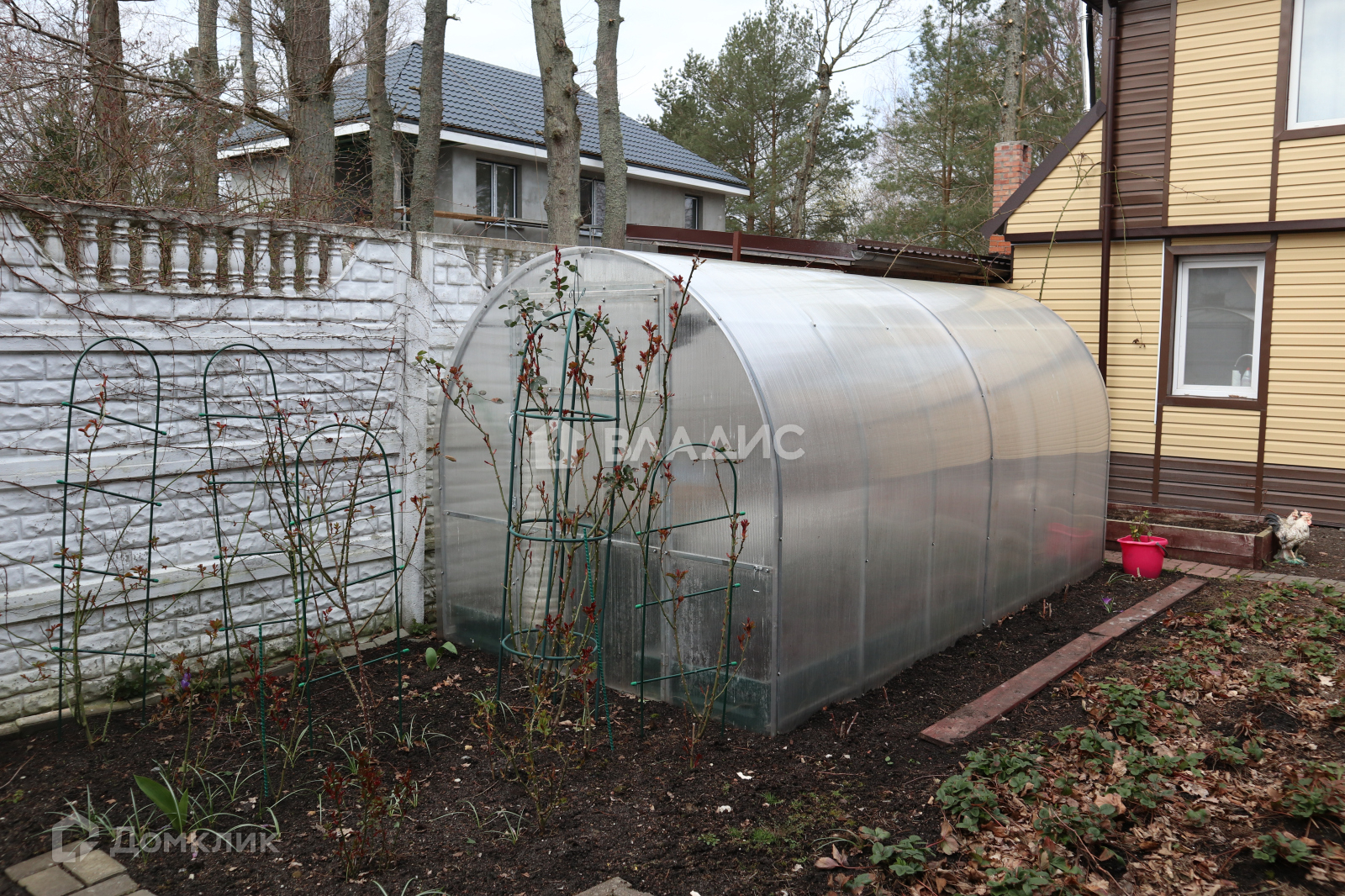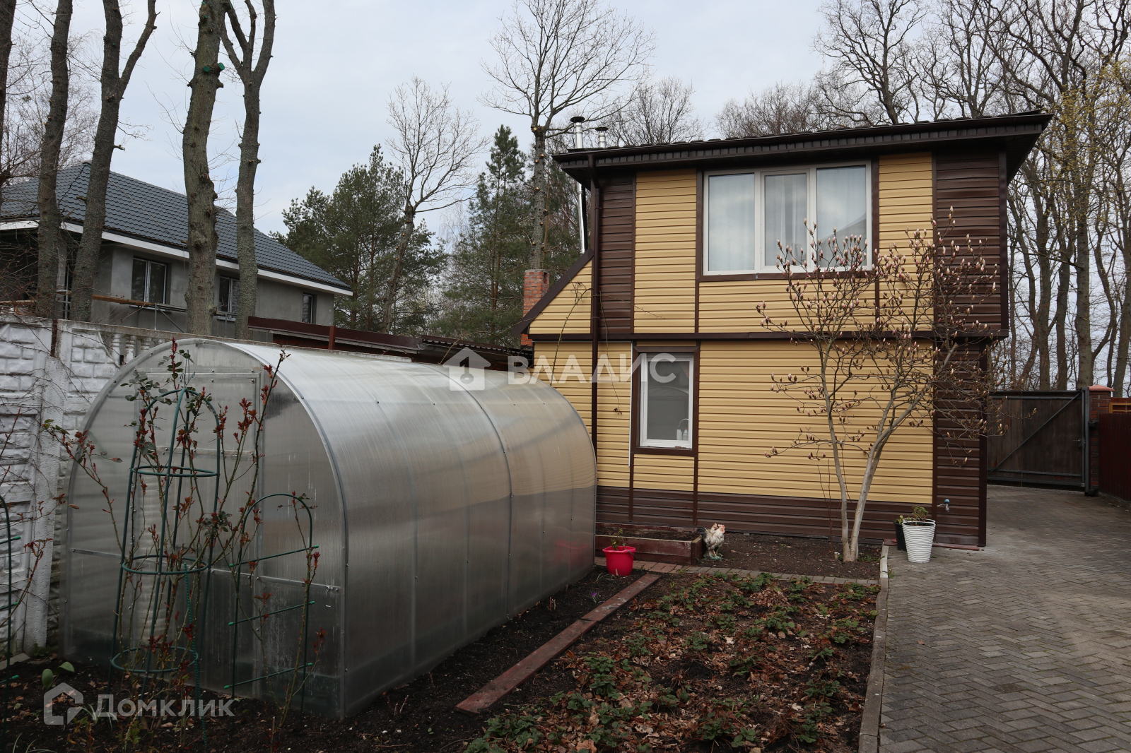 Двор выложен плиткой, во дворе растут туи, магнолия, цветы, клубника. Есть теплица.