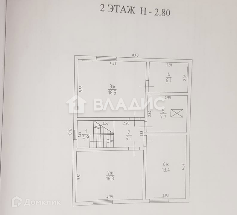 Второй этаж (полумансардный): высота потолка 2,8 кв.м, три изолированные комнаты правильной формы 18,5 кв.м с гардеробной 6,1 кв.м, 16,8 кв.м и 13,4 кв.м, холл 4,1 кв.м, совмещенный санузел 7,7 кв.м.