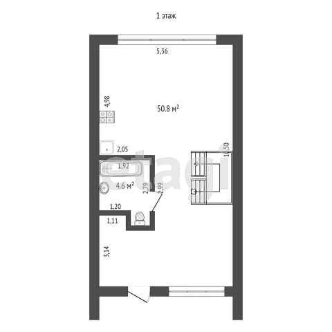 Первый этаж холл, лестница на второй этаж, санузел, кухня-гостинная.