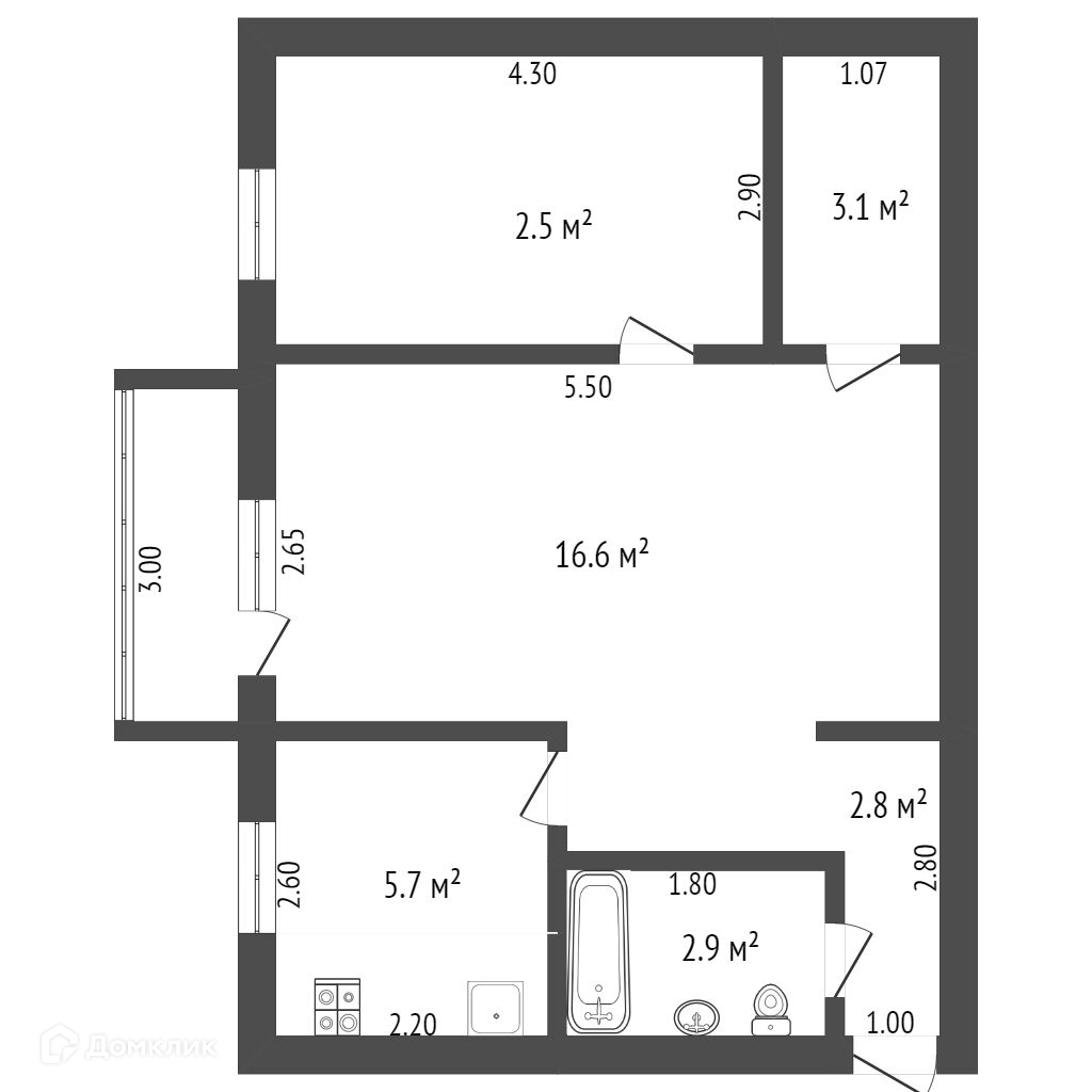 Общая площадь 43.6 м2