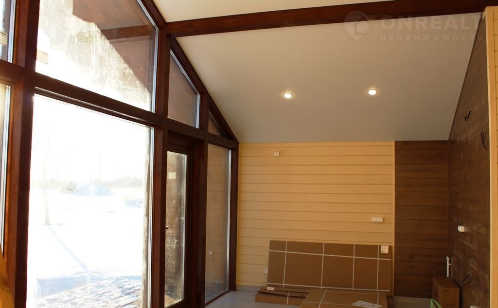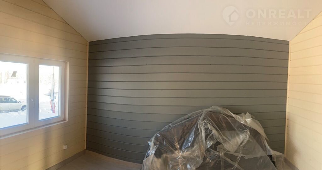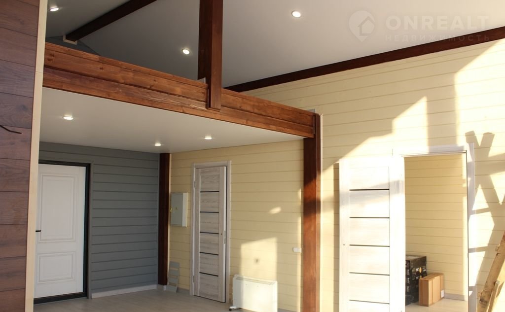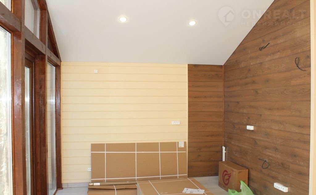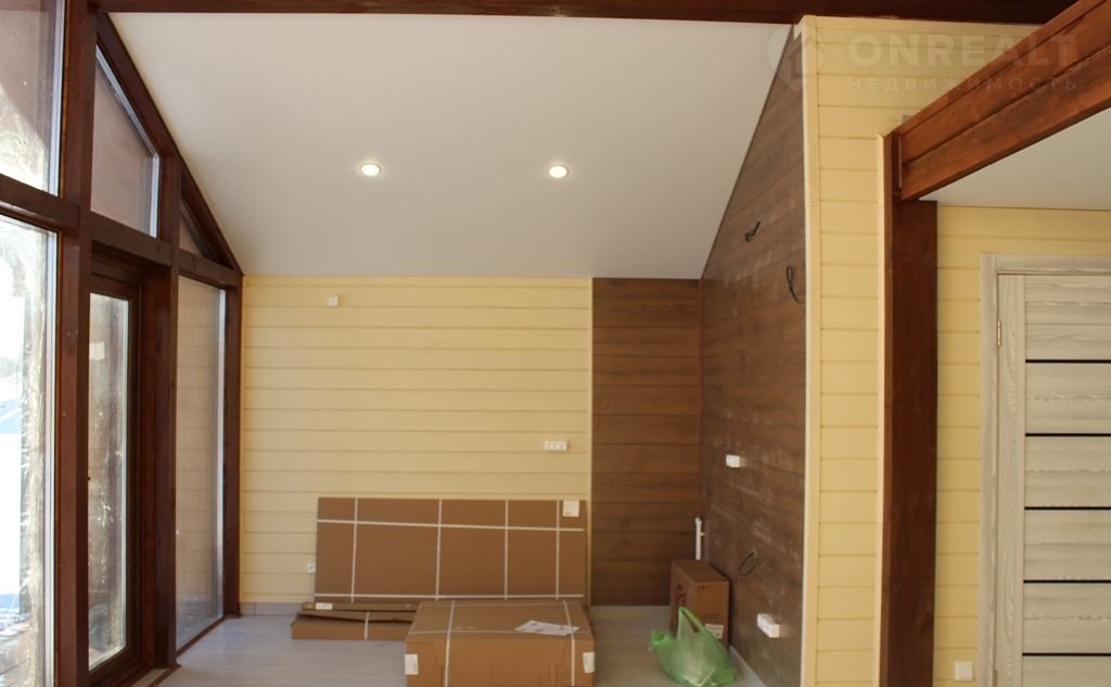 • Дом полностью с чистовой отделкой: натяжные потолки, отделка стен — имитация бруса, пол — ламинат, установлена сантехника.