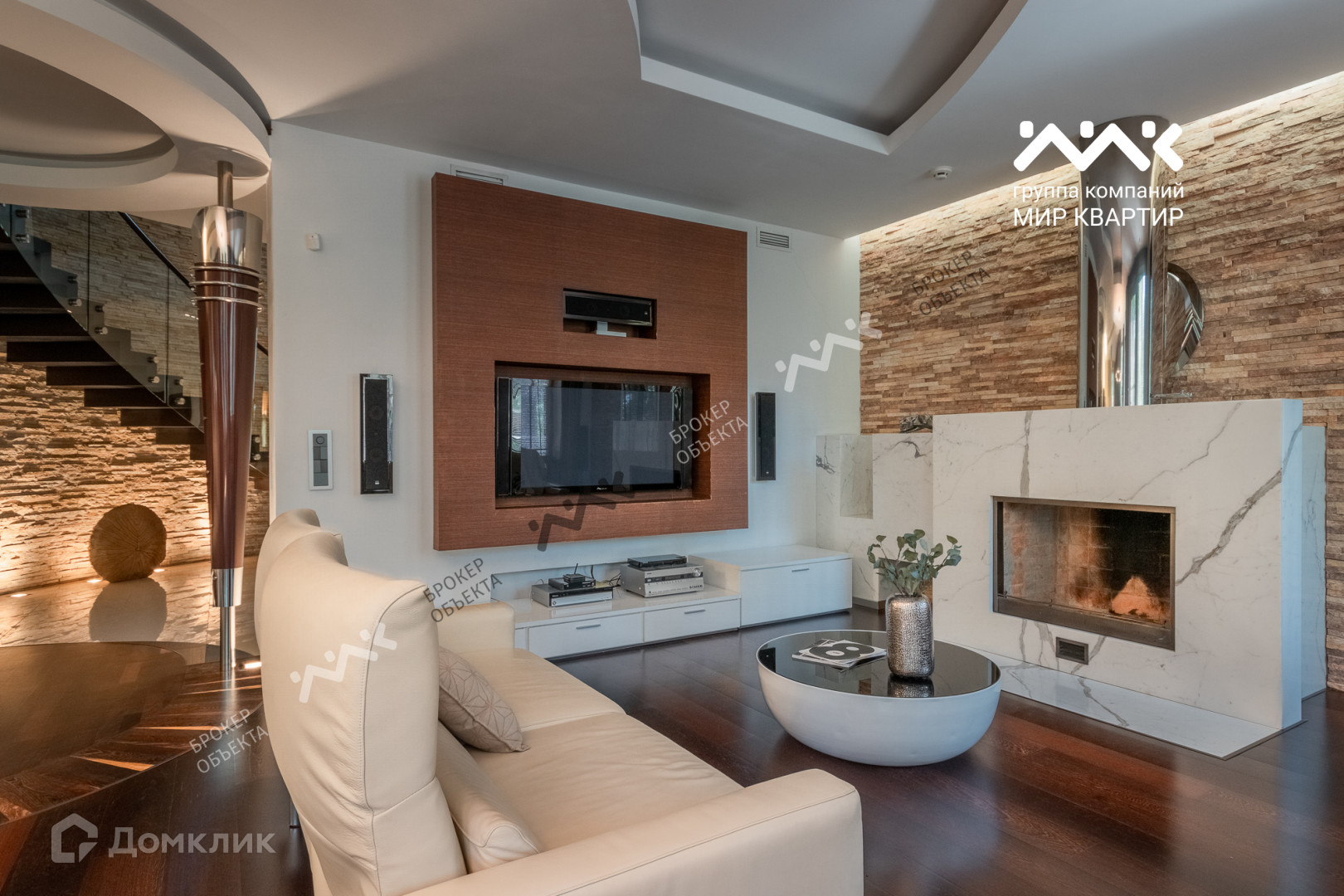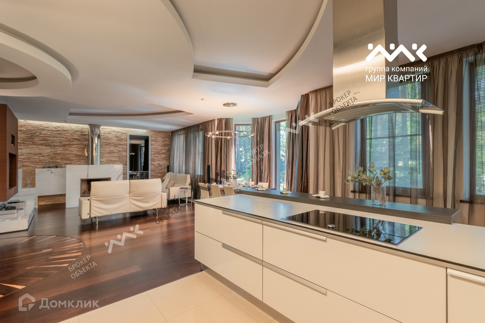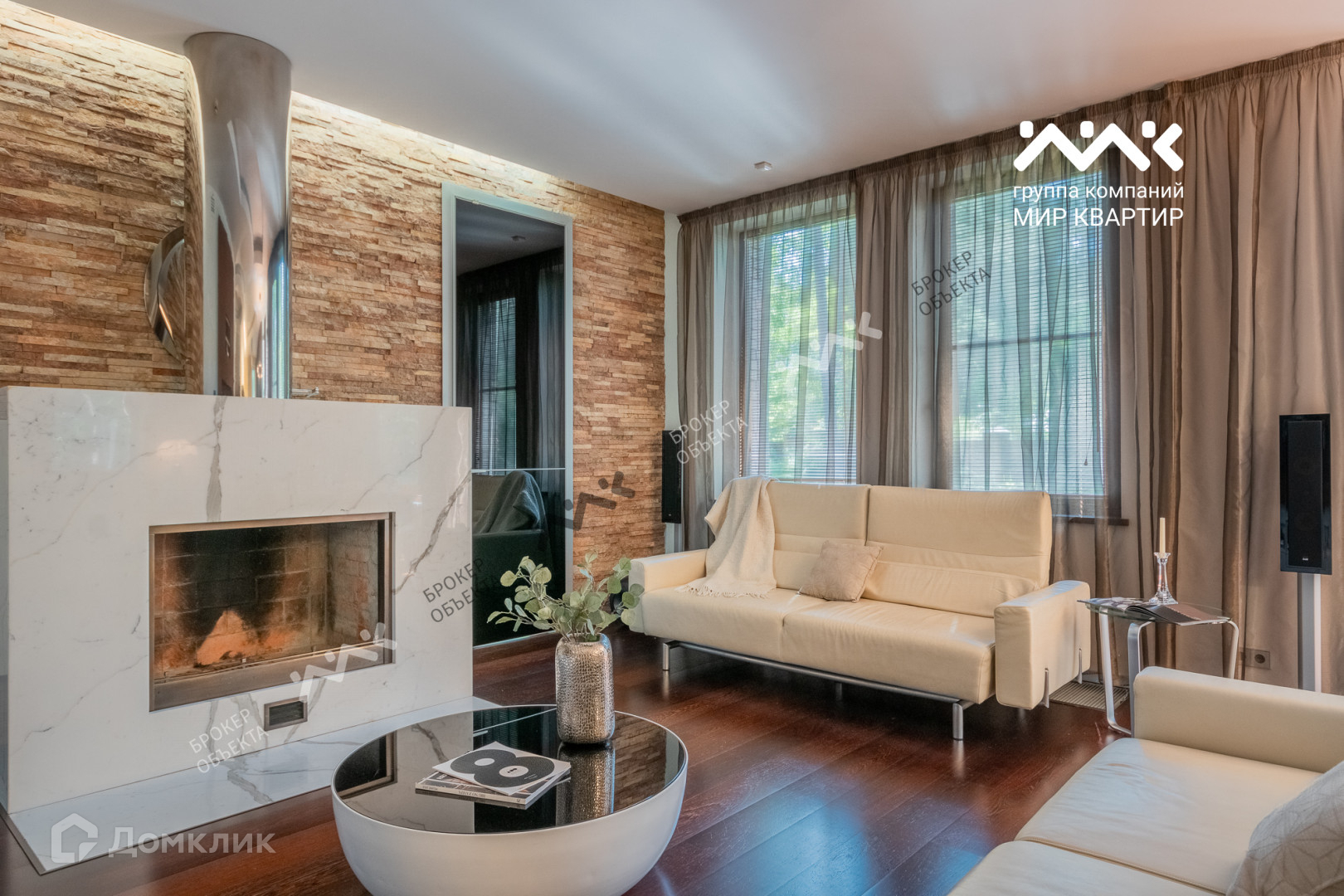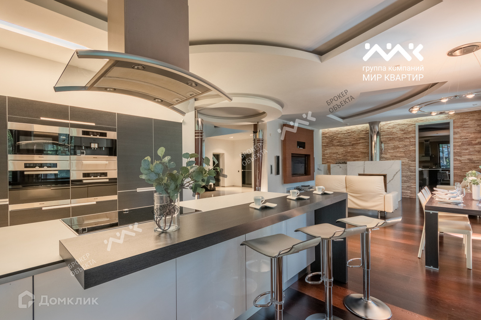 При отделке использованы мрамор, гранит, паркет, дуб-доска, установлена мебель производства Италии, техника AEG, Miele.