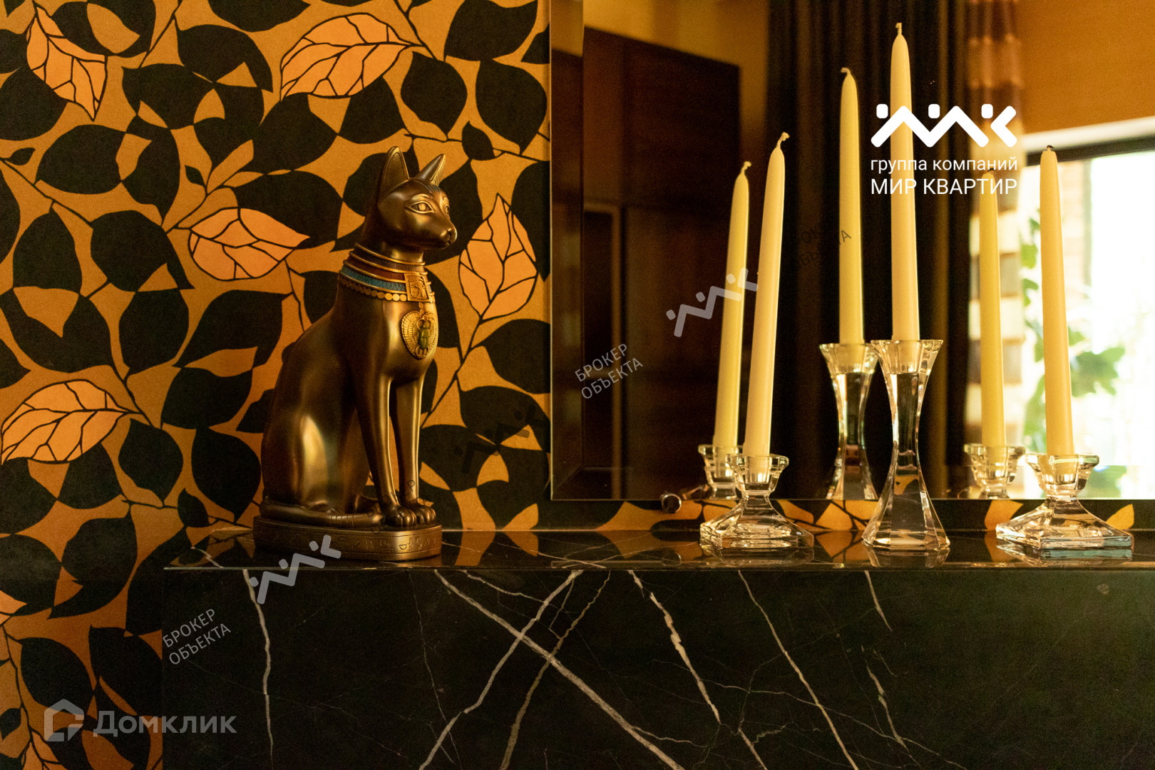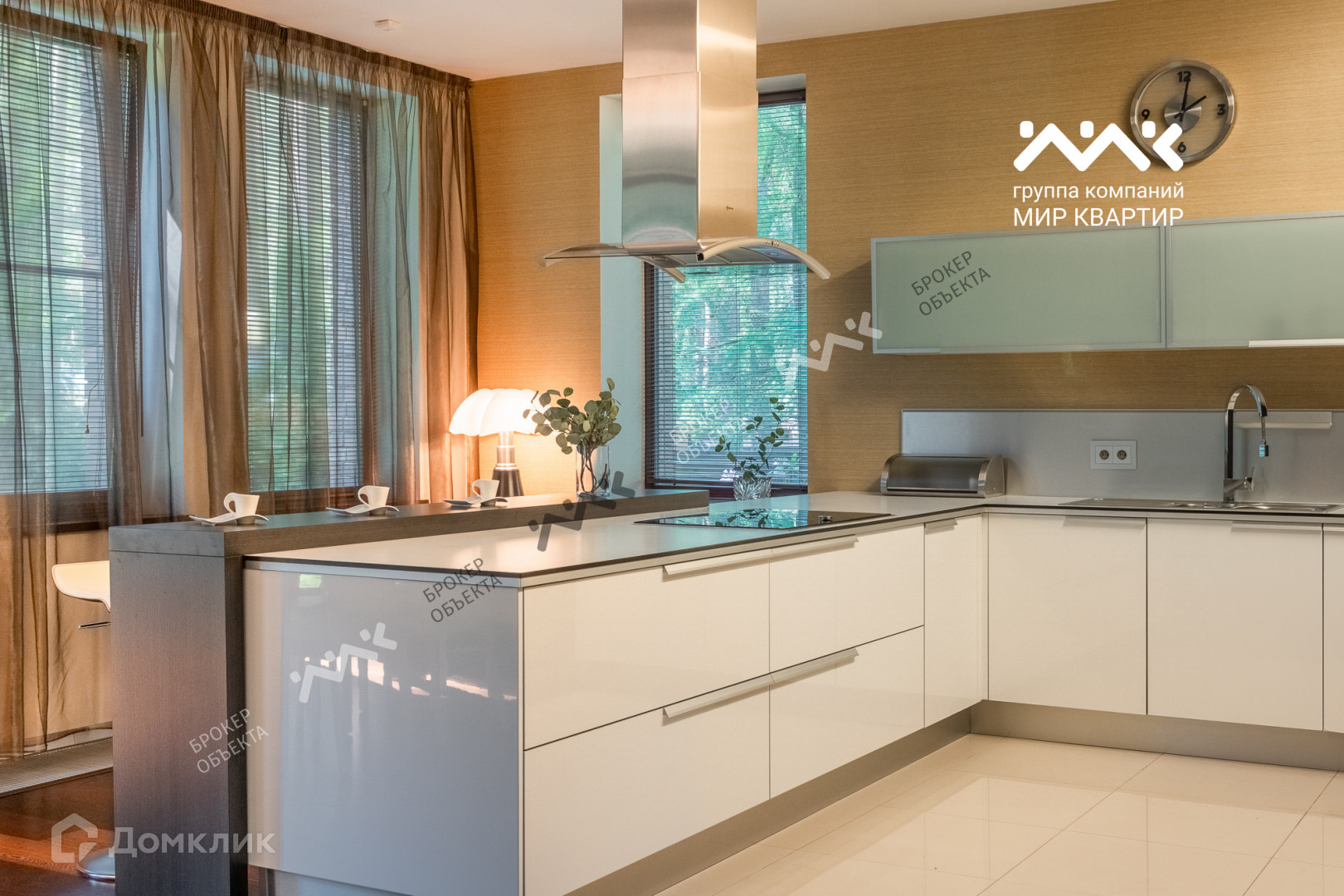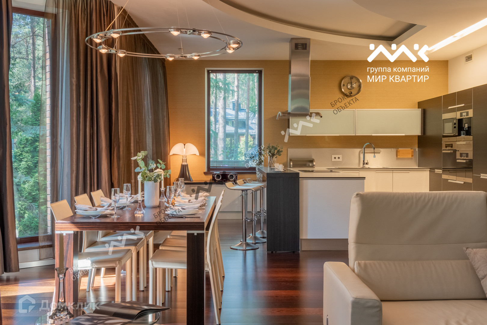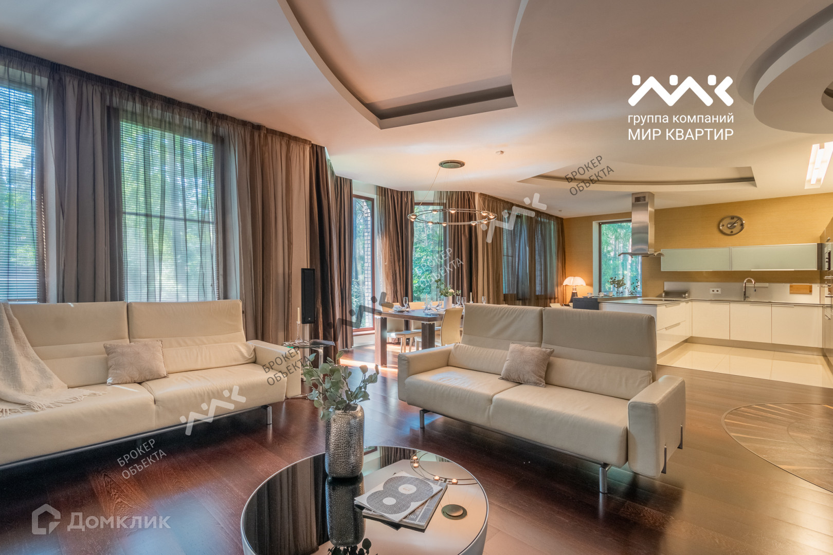При отделке использованы мрамор, гранит, паркет, дуб-доска, установлена мебель производства Италии, техника AEG, Miele.