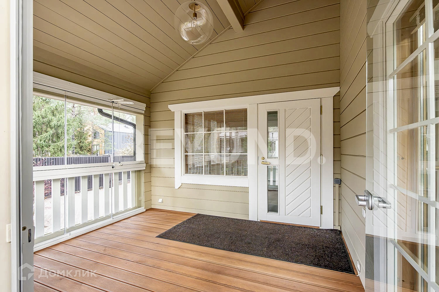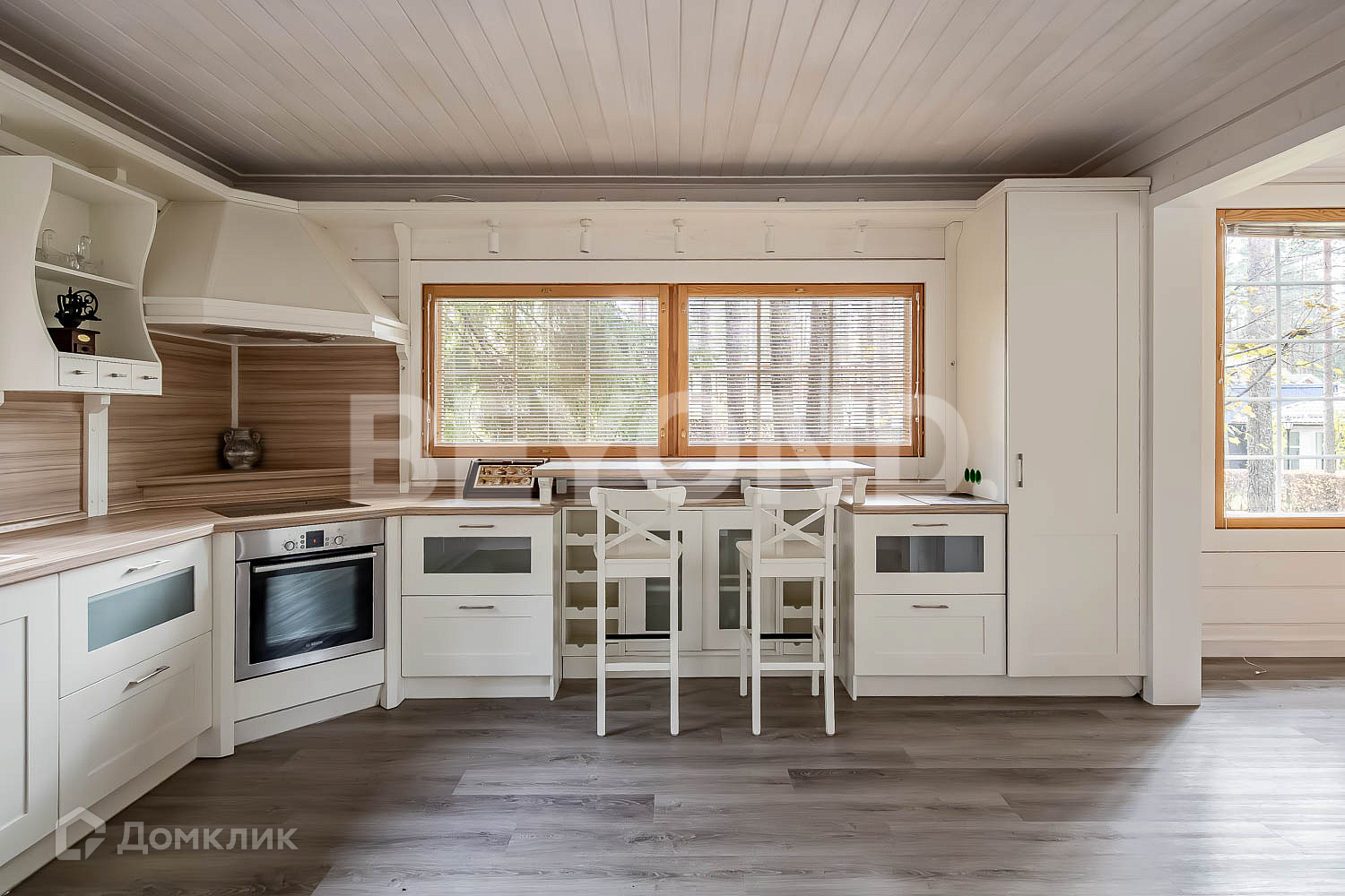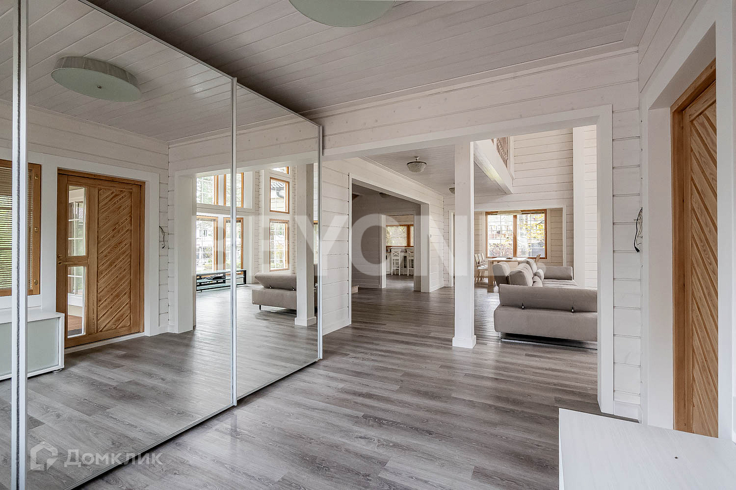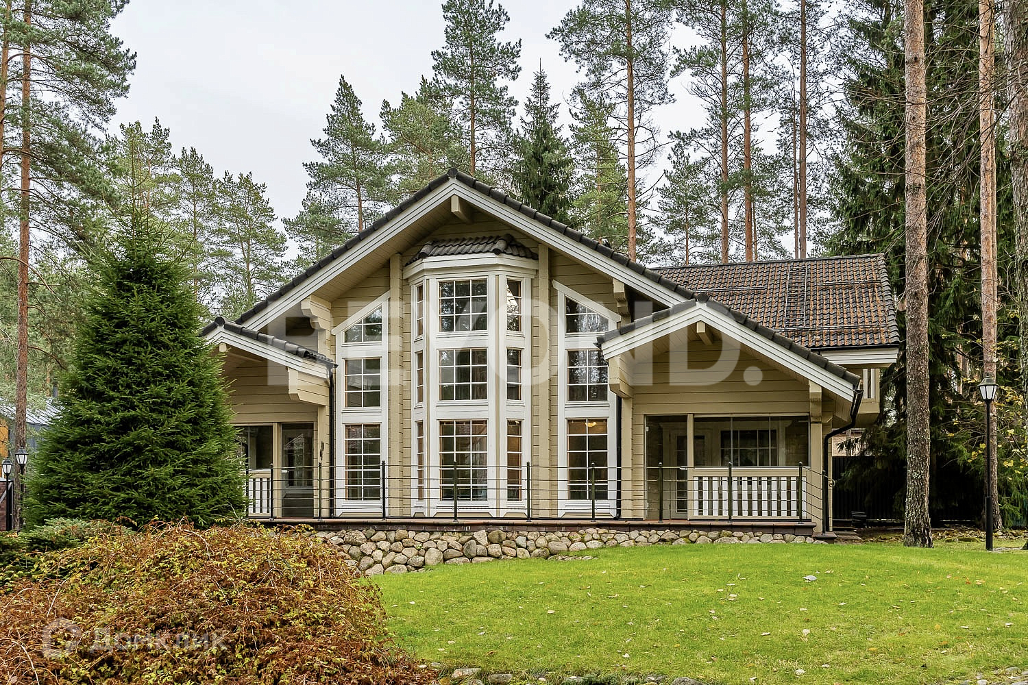Основной дом - HONKA с панорамным финским остеклением, общей площадью 215.5 кв. м, имеет два этажа, где расположились 4 спальни, гардеробная комната, 2 санузла, кабинет, гостиная со вторым светом, кухня и столовая зона с выходом на крытую террасу - 12 кв. м.