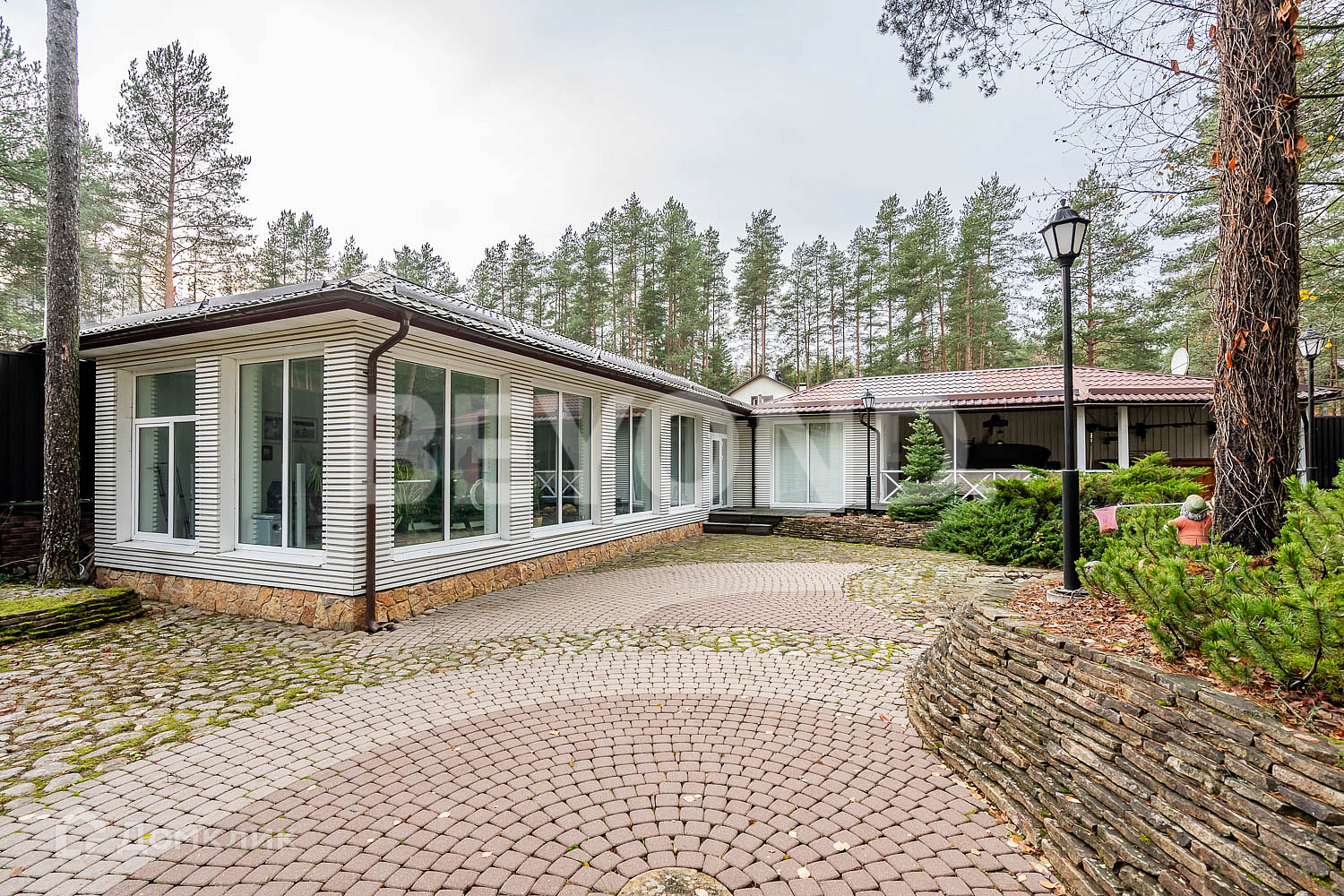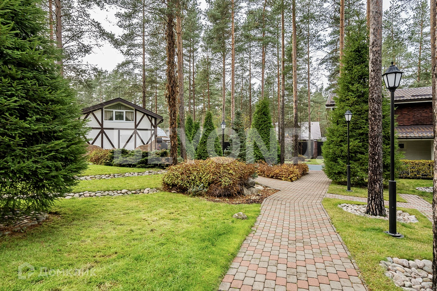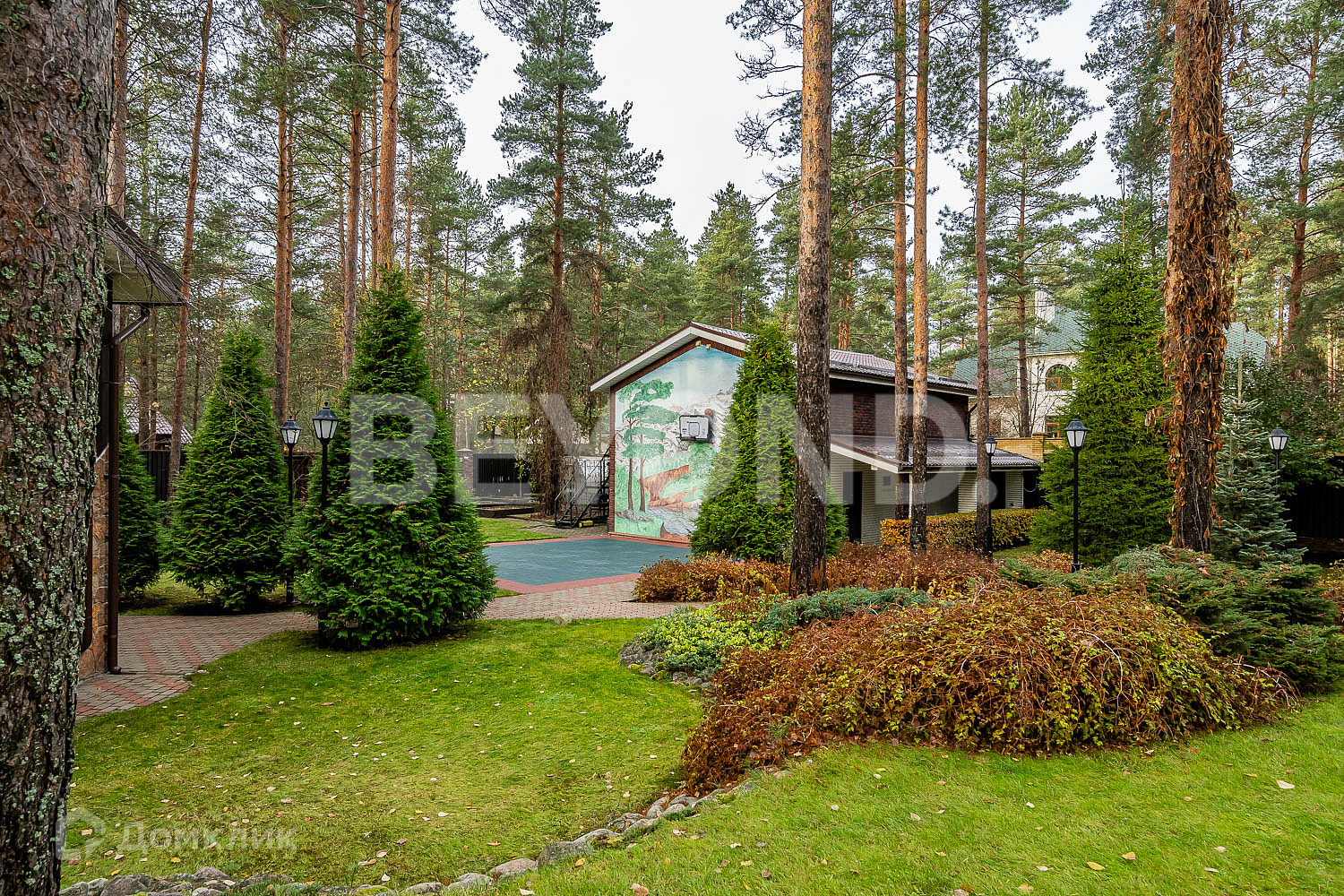 Ухоженный участок с многочисленными соснами имеет ландшафтный дизайн, освещение, мощение дорожек и уличной террасы для летней мебели. Сделана разводка и выводы для полива.