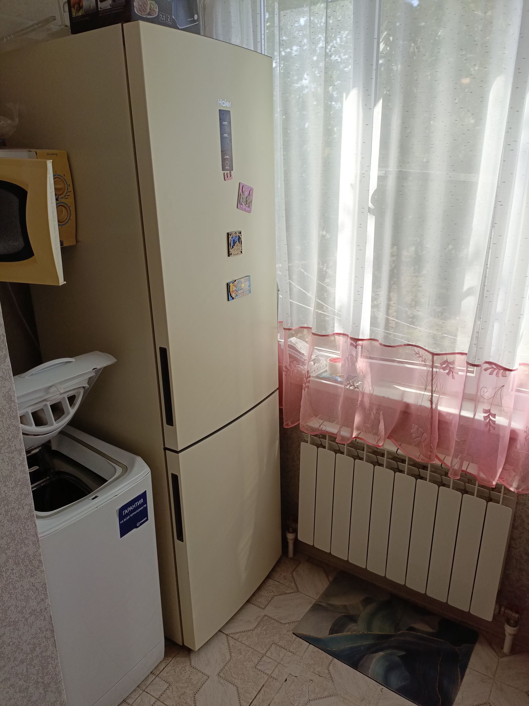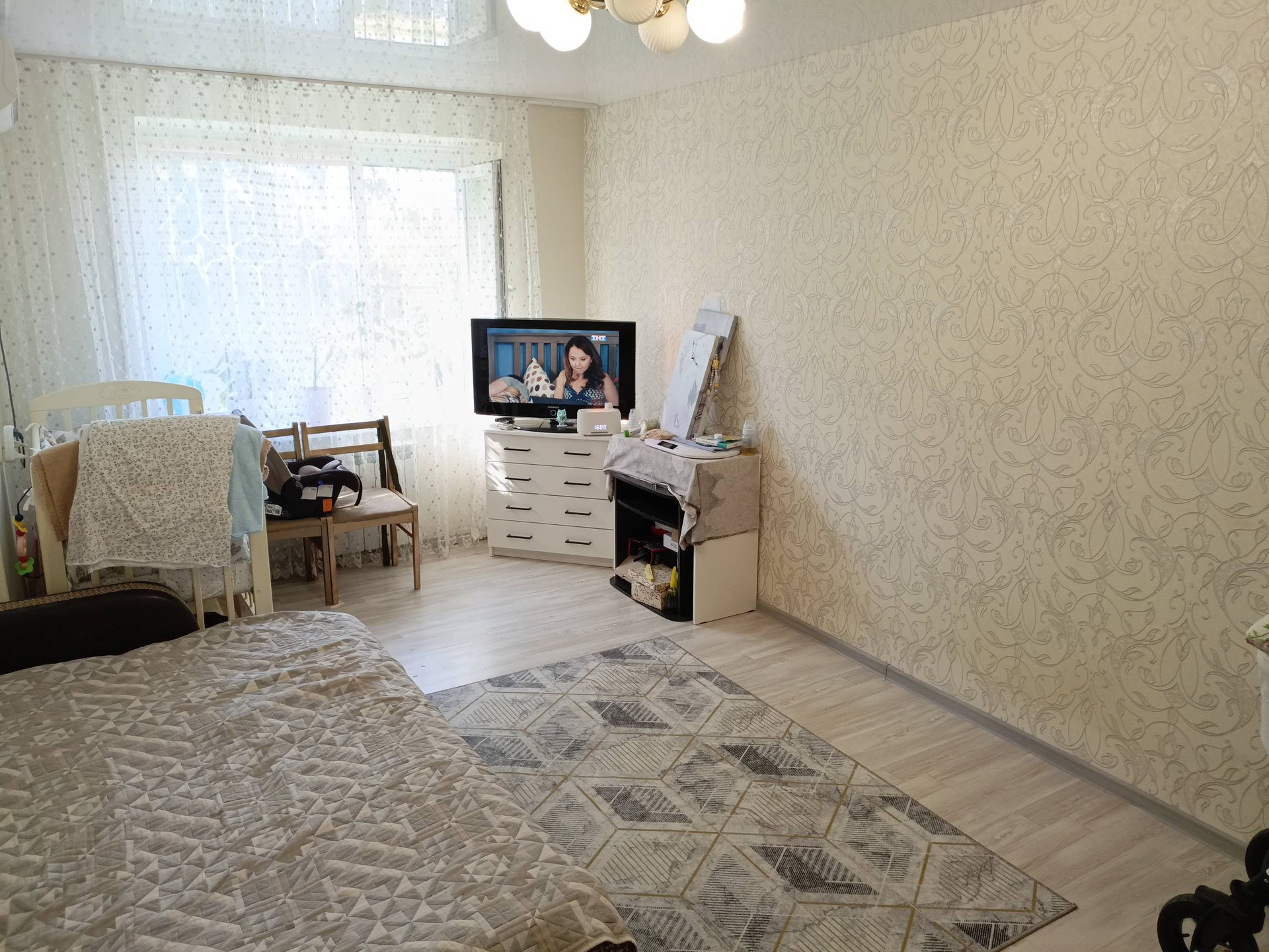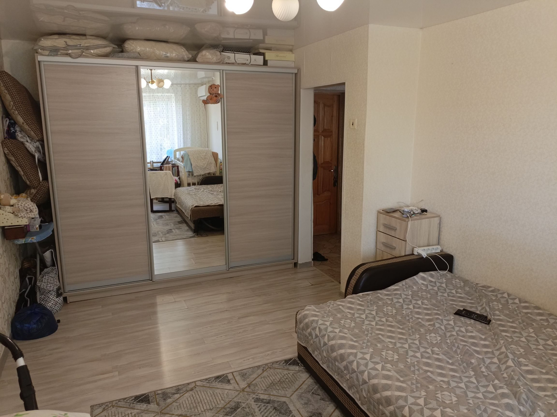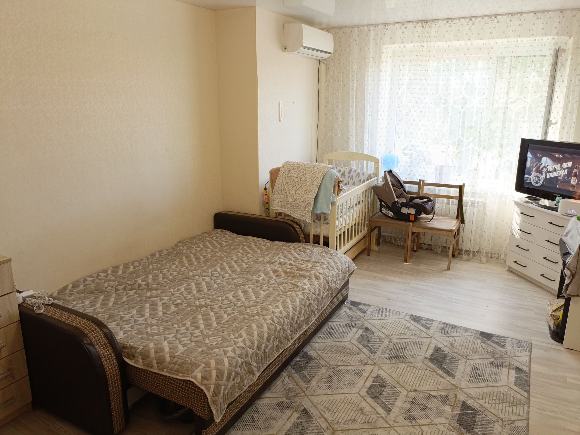 В жилой комнате и ванной натяжной потолок. Кухонный гарнитур остаётся. В жилой комнате остаётся сплит-система.