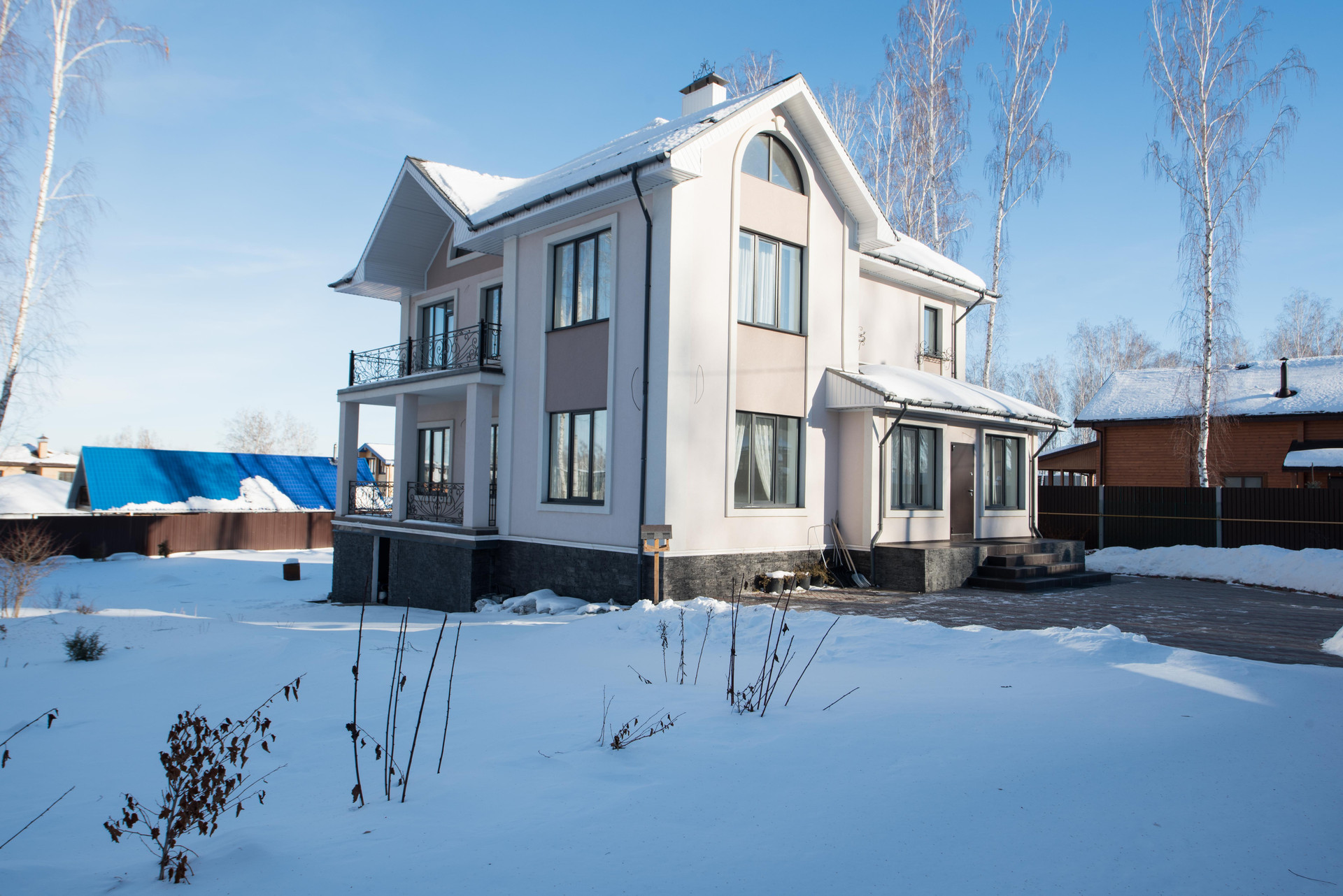 Отделка фасада коттеджа - "мокрый фасад". Облицовка цоколя камнем. Декоративные балконы на фасаде. Два этажа ,плюс цокольный этаж.