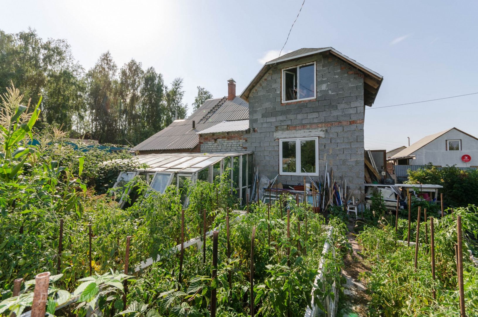 Дом возведен частично из кирпича, частично из шлакоблока, крыша из высокопрочной гибкой черепицы, окна пластиковые, дверь железная. Большая часть дома утеплена.