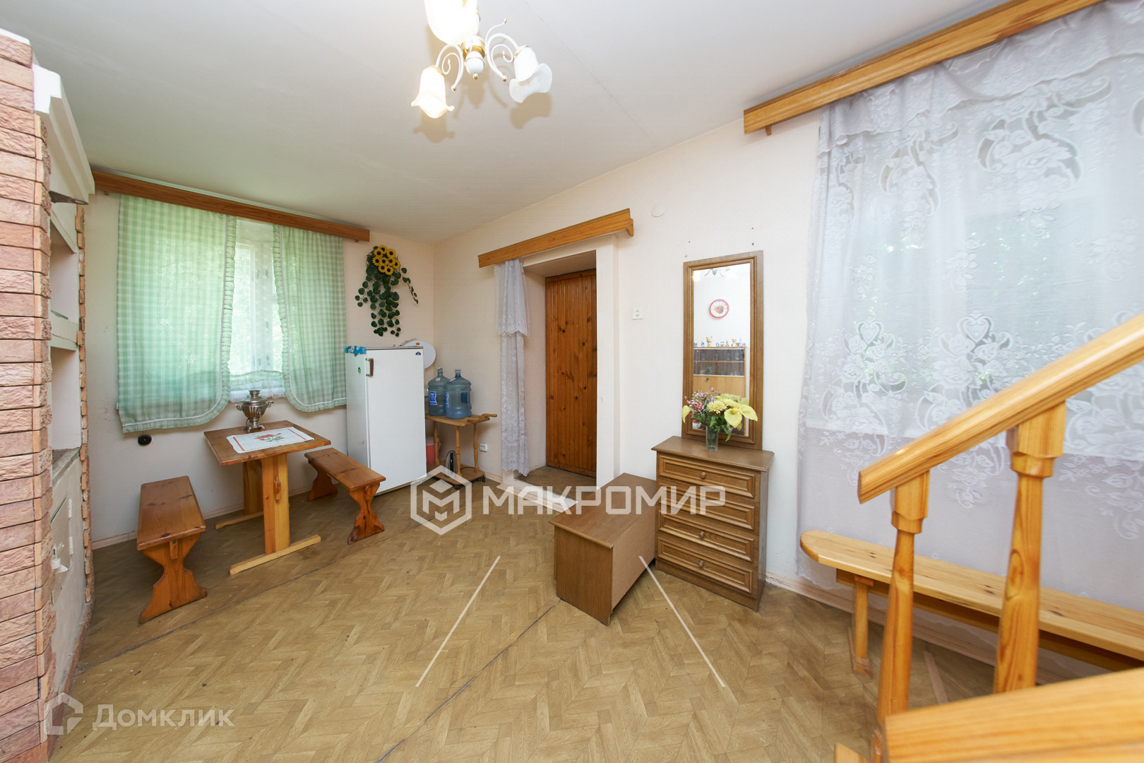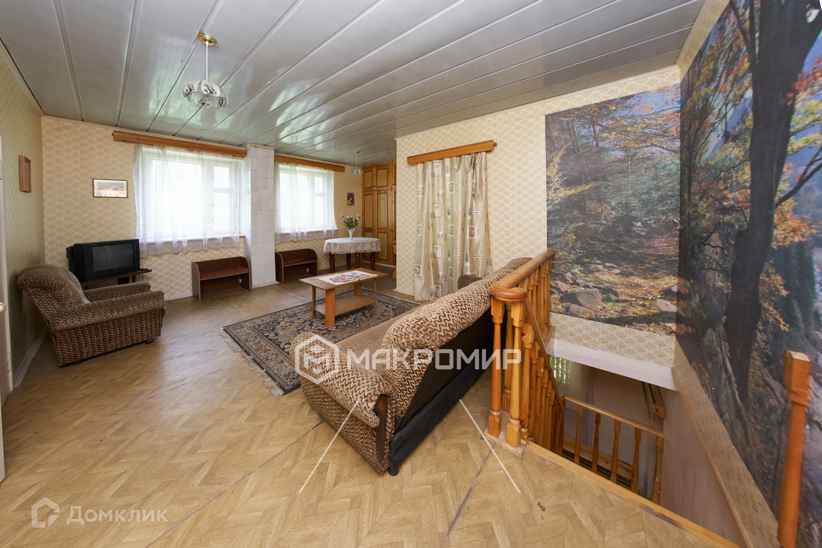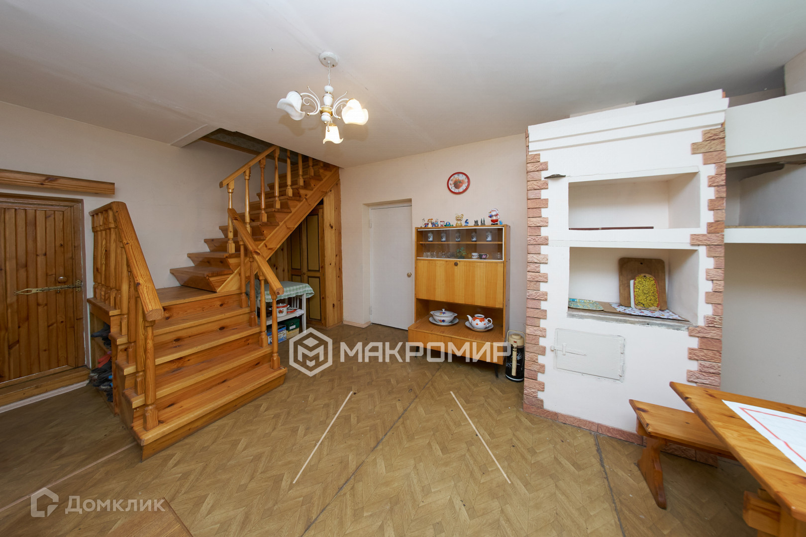 - на первом этаже - кухня с Русской печкой и просторная гостиная площадью 45 кв.м. В гостиной два больших окна и высокие потолки, благодаря чему комната очень светлая;