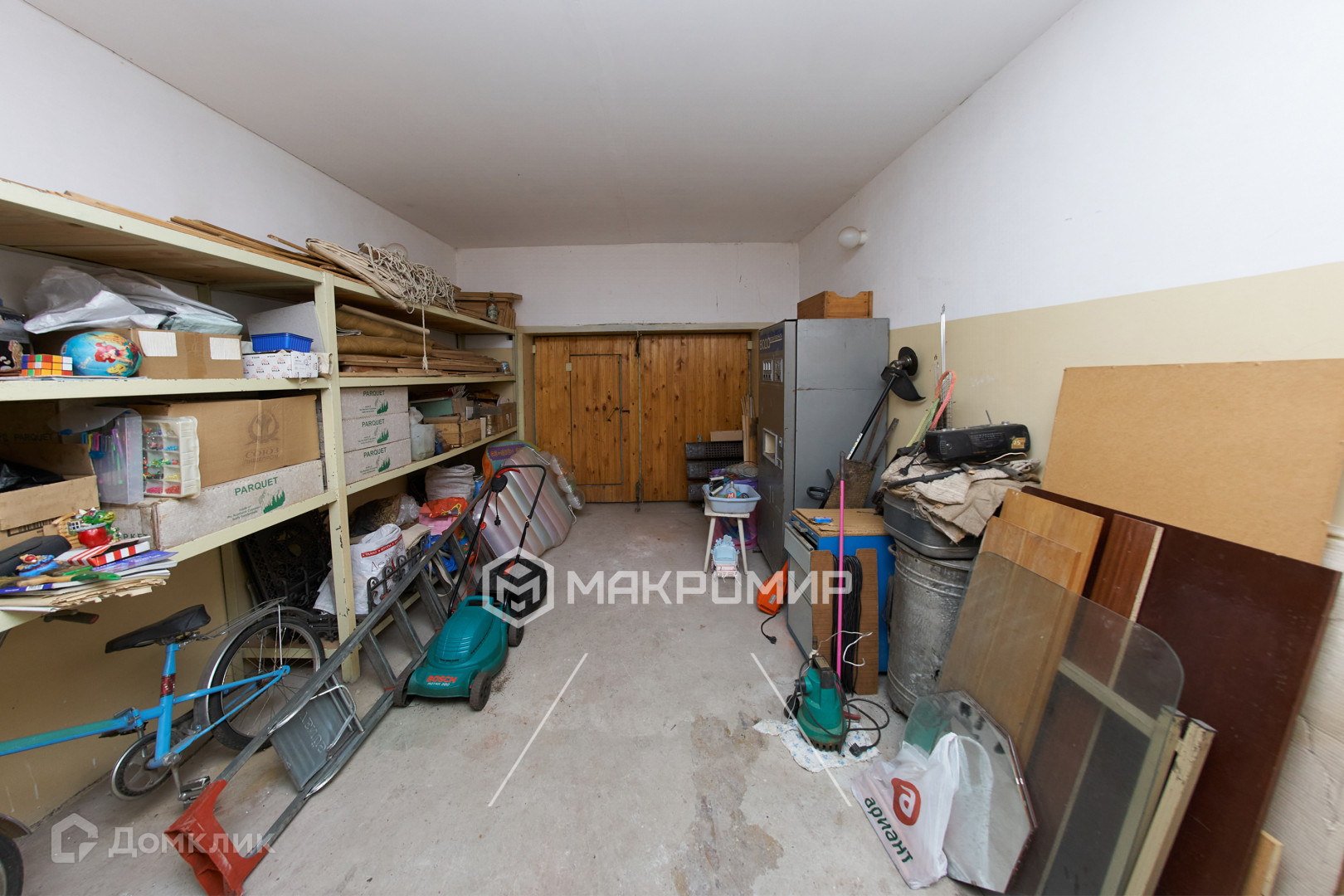 Кроме дома, на территории участка имеется большой гараж. Въезд в гараж располагаются напротив уличных ворот. Гараж оборудован погребом площадью 26 кв.м. и стеллажами с полками.