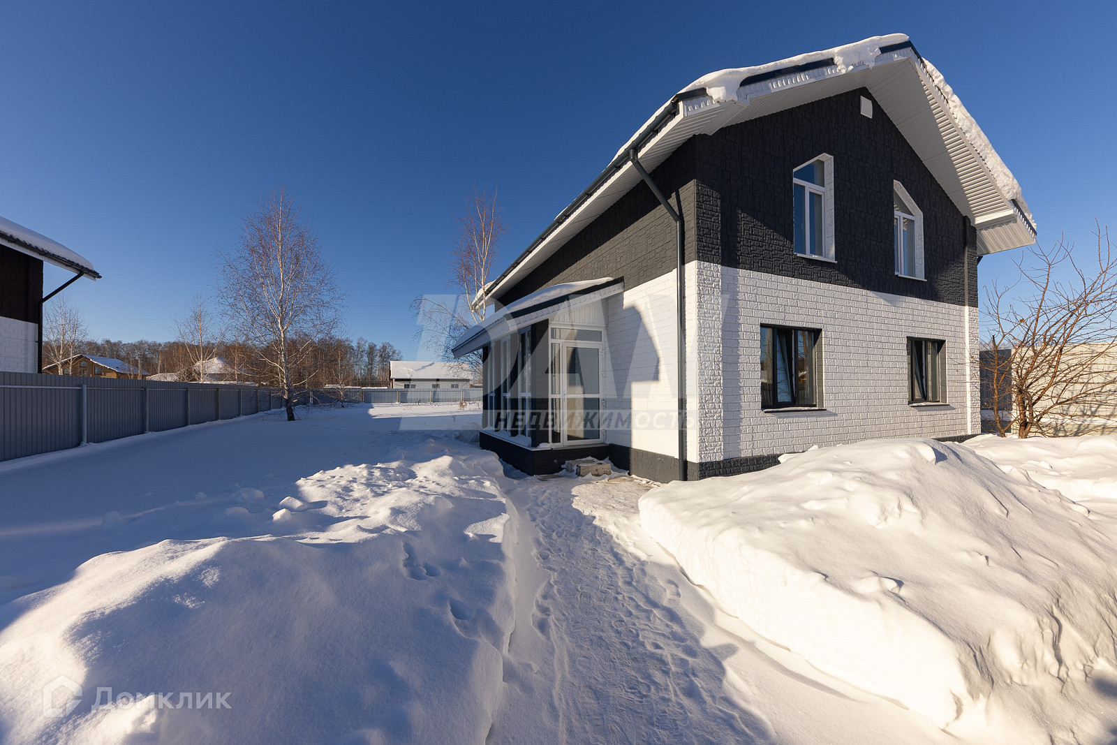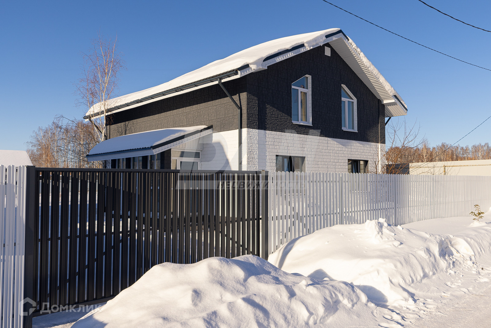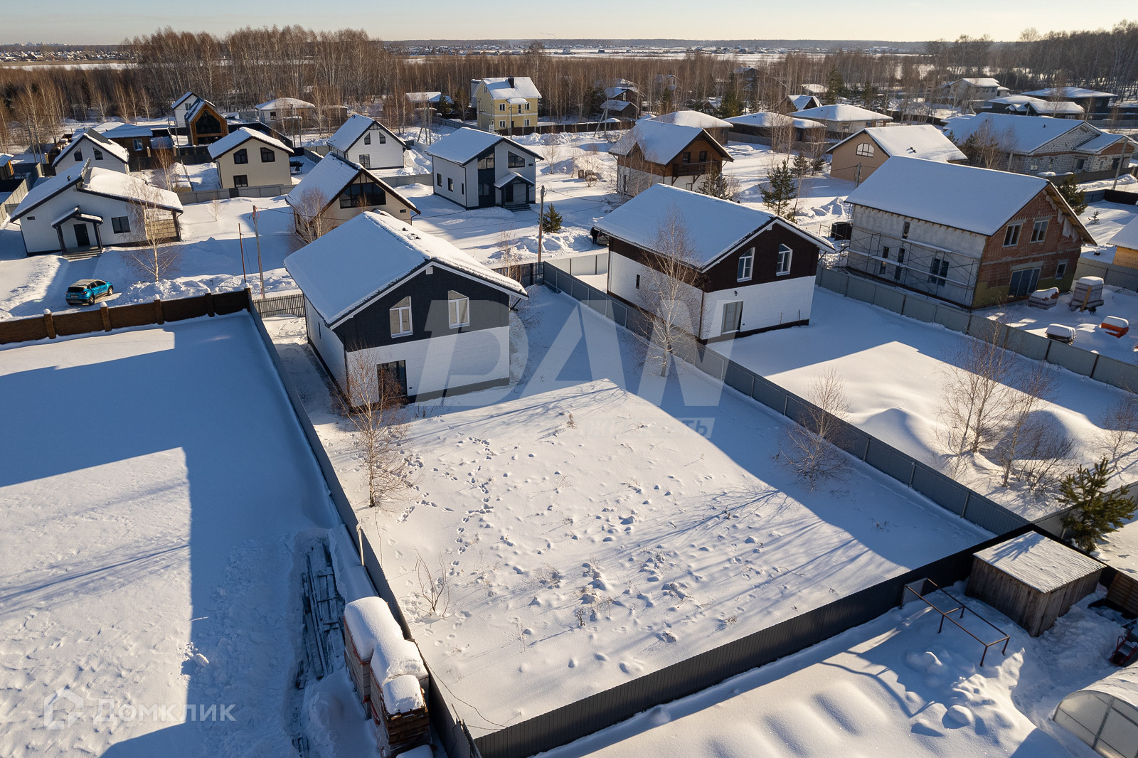 Участок: участок прямоугольный, правильной формы, почва без близких грунтовых вод, на территории сохранены взрослые деревья: 4 берёзы и яблоня, откатные ворота из евроштакетника, весь участок огорожен забором.
