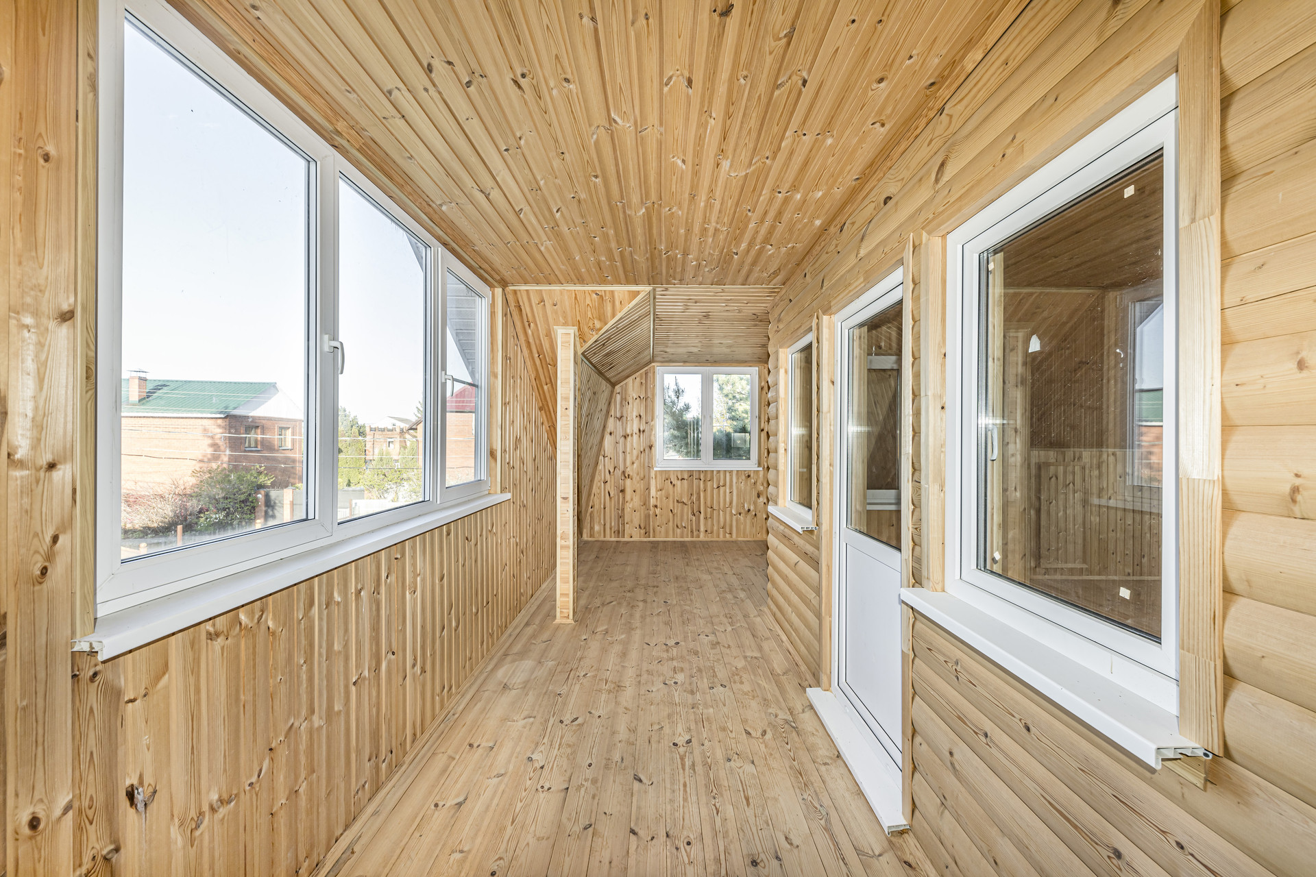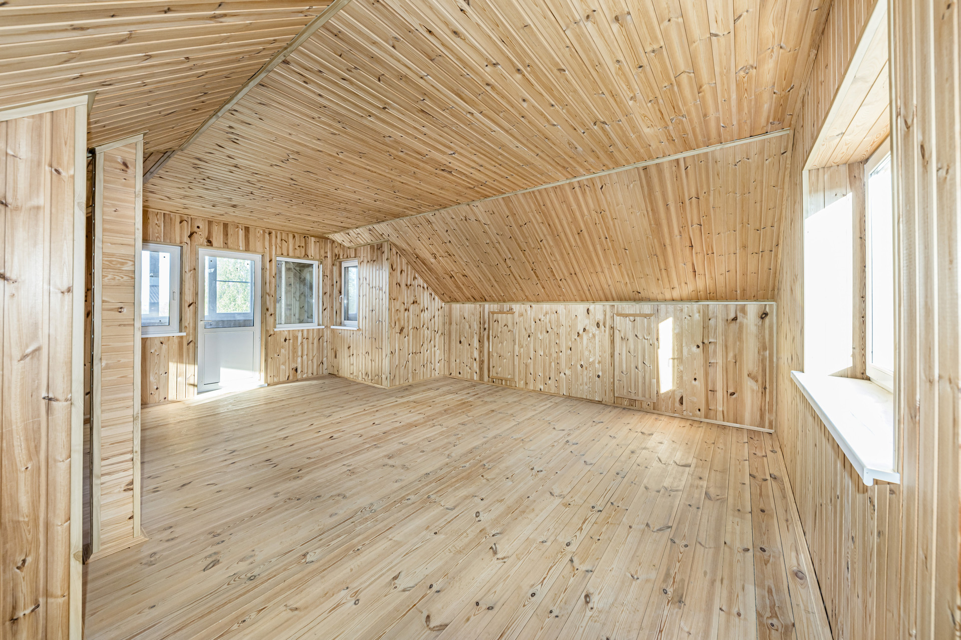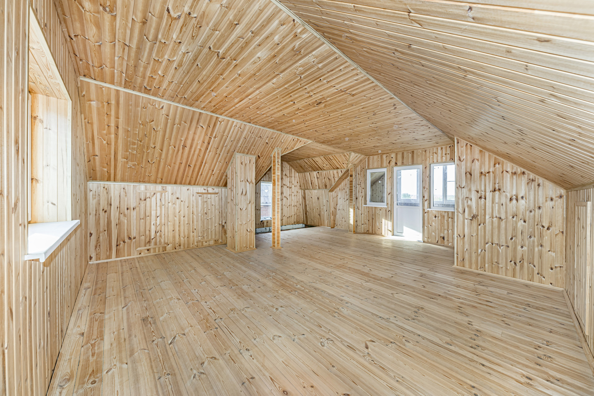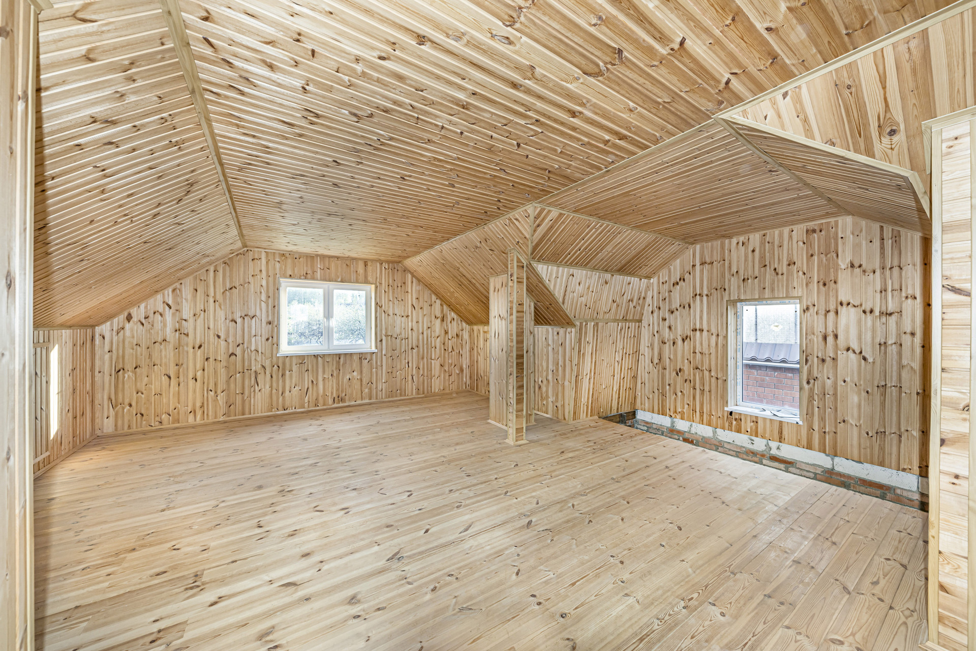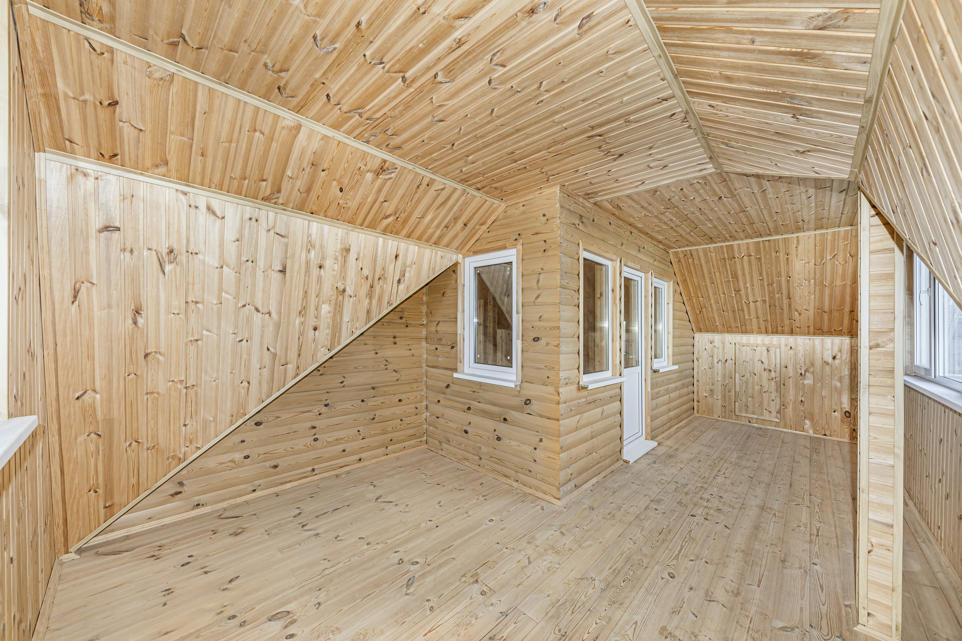 Отделка второго этажа полностью выполнена из дерева. Стены отделаны вагонкой, пол выполнен из шпунта.