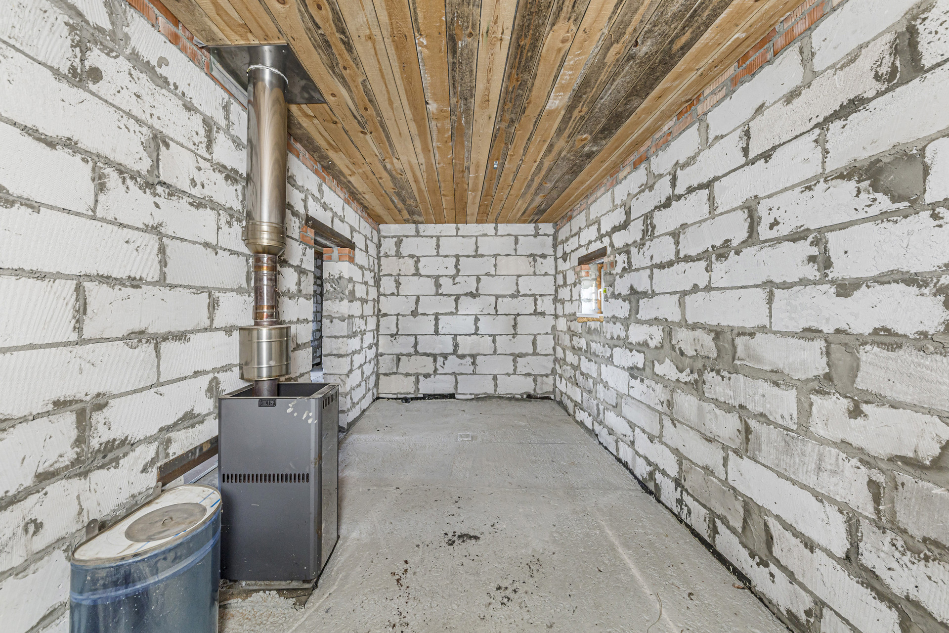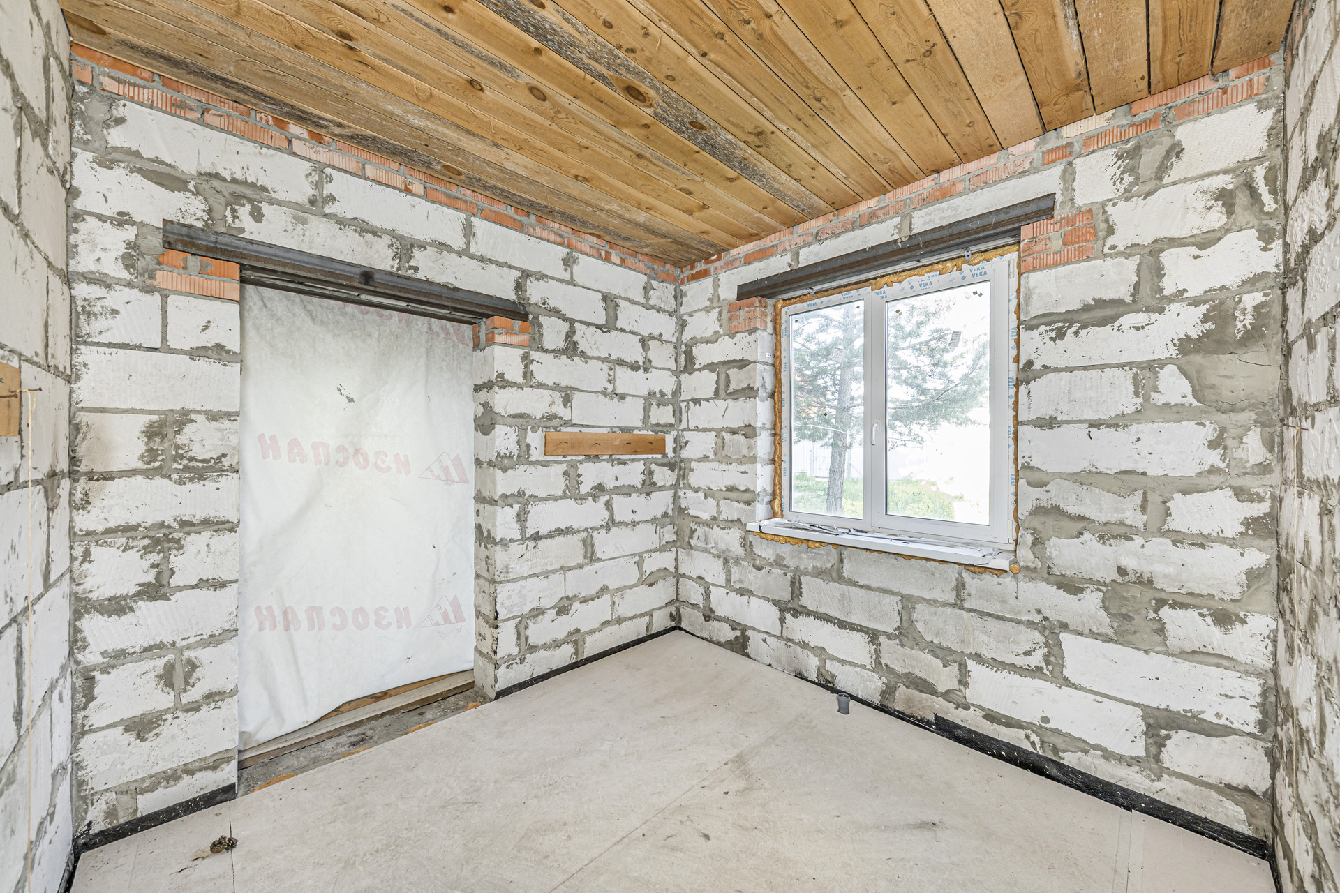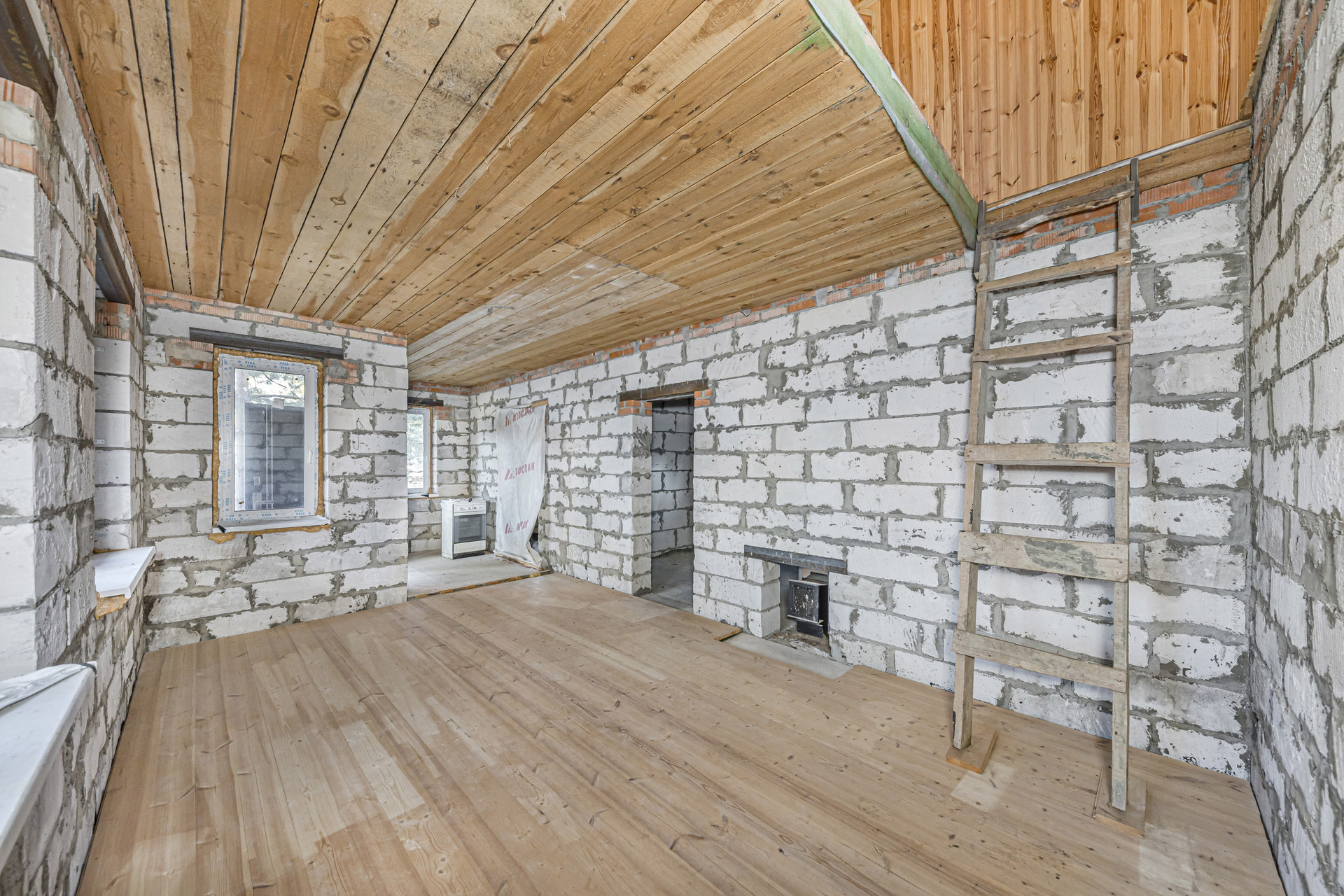 Первый этаж подготовлен к внутренней отделке. В основной комнате уложен шпунт, в кухне и прихожей пол подготовлен к устройству покрытия из керамической плитки.