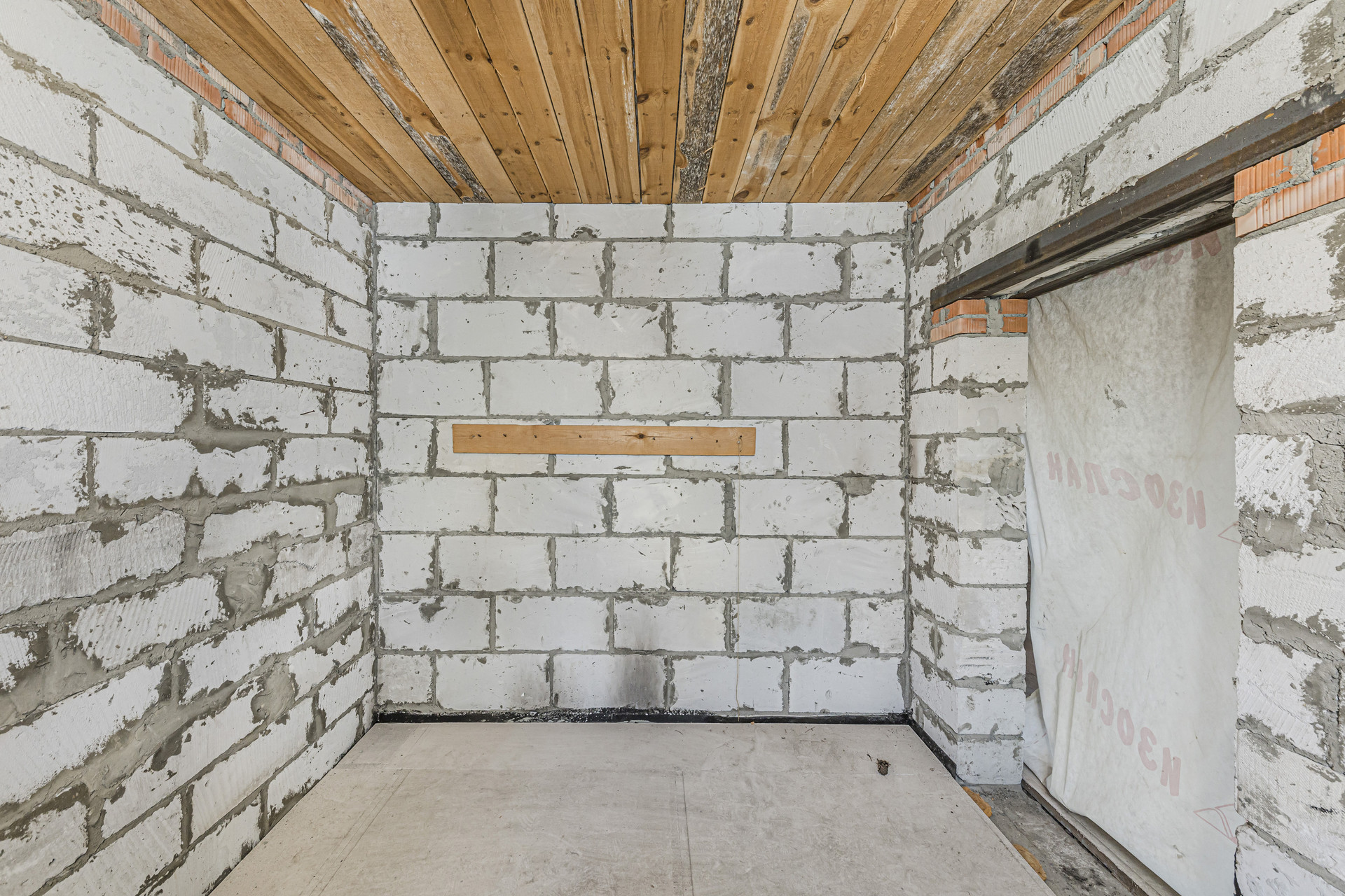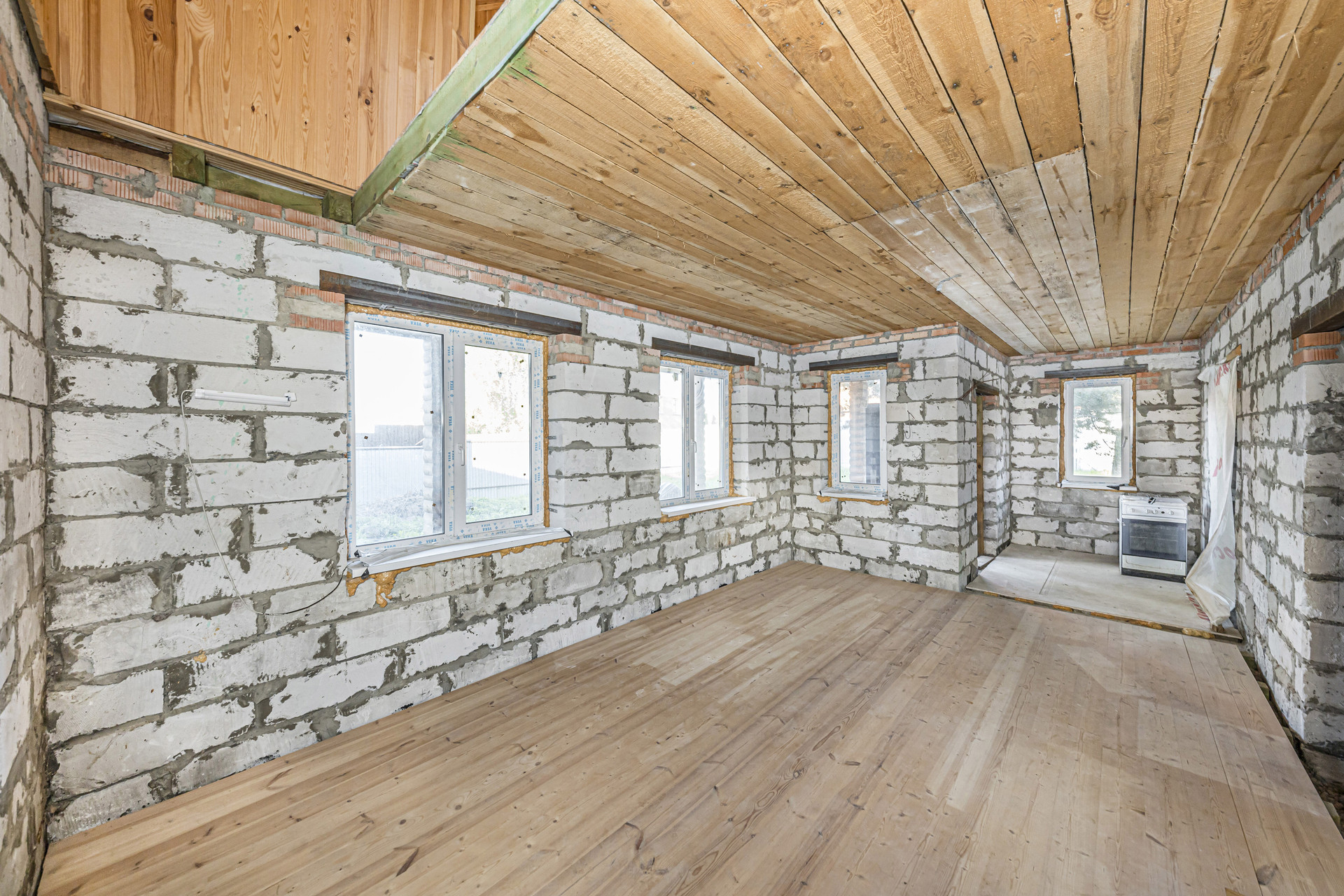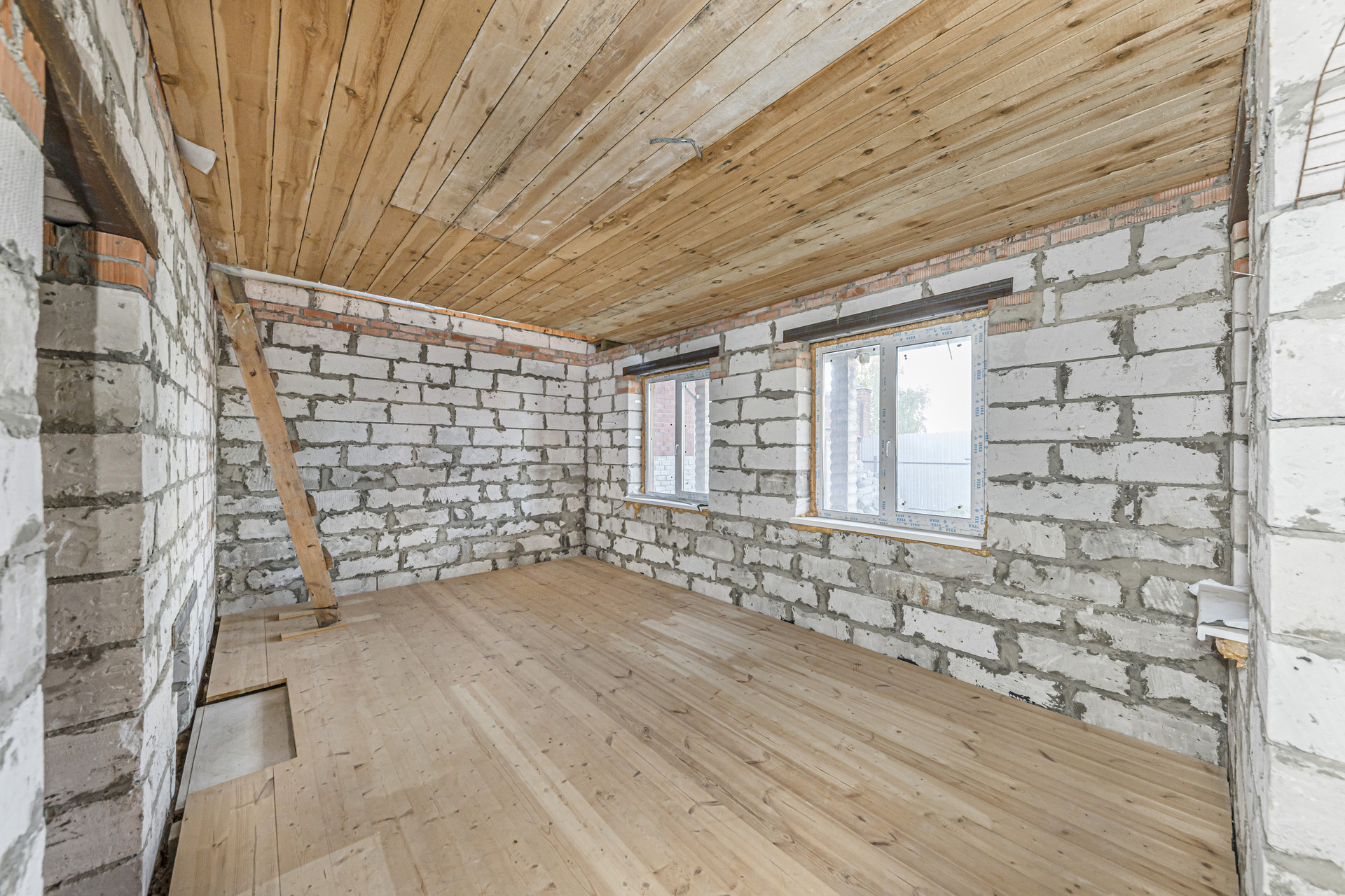Первый этаж подготовлен к внутренней отделке. В основной комнате уложен шпунт, в кухне и прихожей пол подготовлен к устройству покрытия из керамической плитки.