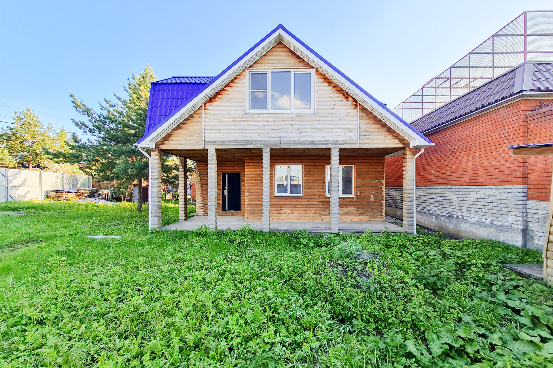 Стены дома выполнены из газоблока 300мм, дополнительно фасад всего дома утеплен пеноплэксом 50мм, наружная отделка выполнена деревянным блок-Хаусом. Крыша выполнена из металлочерепицы.